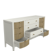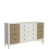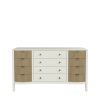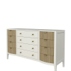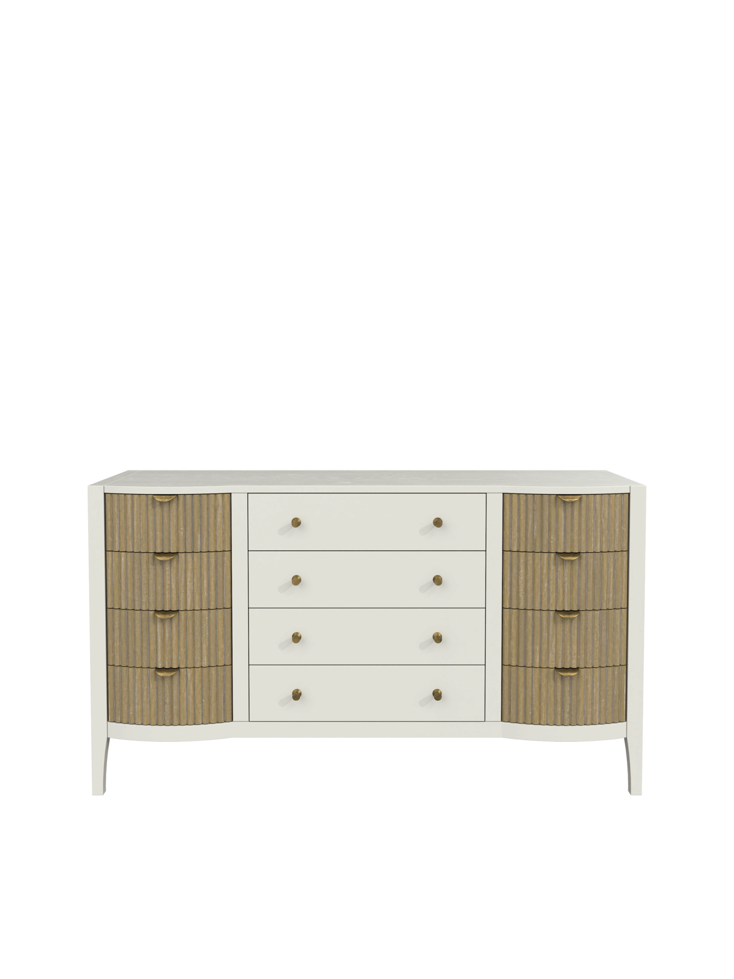 Abbeydale 12 Drawer Chest combines a quintessential British style with innovation and charm. This generously proportioned chest marries elements of the Art Deco style with the recent trend for weathered ribbed panels. The curving drawer fronts and simple silhouette present a contemporary yet elegant appearance, perfect for modern luxury decorating. Local Elm solids and veneers are used in the construction of the carcase, subtly brushed to accentuate the grain which can be seen through Soft Natural paint finish. Solid poplar is then used for the ribbed details, lightly weathered and lacquered for protection. The drawer boxes are traditionally made, running on traditional wooden rails and dressed with brushed brass knobs and tab handles.
