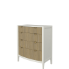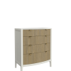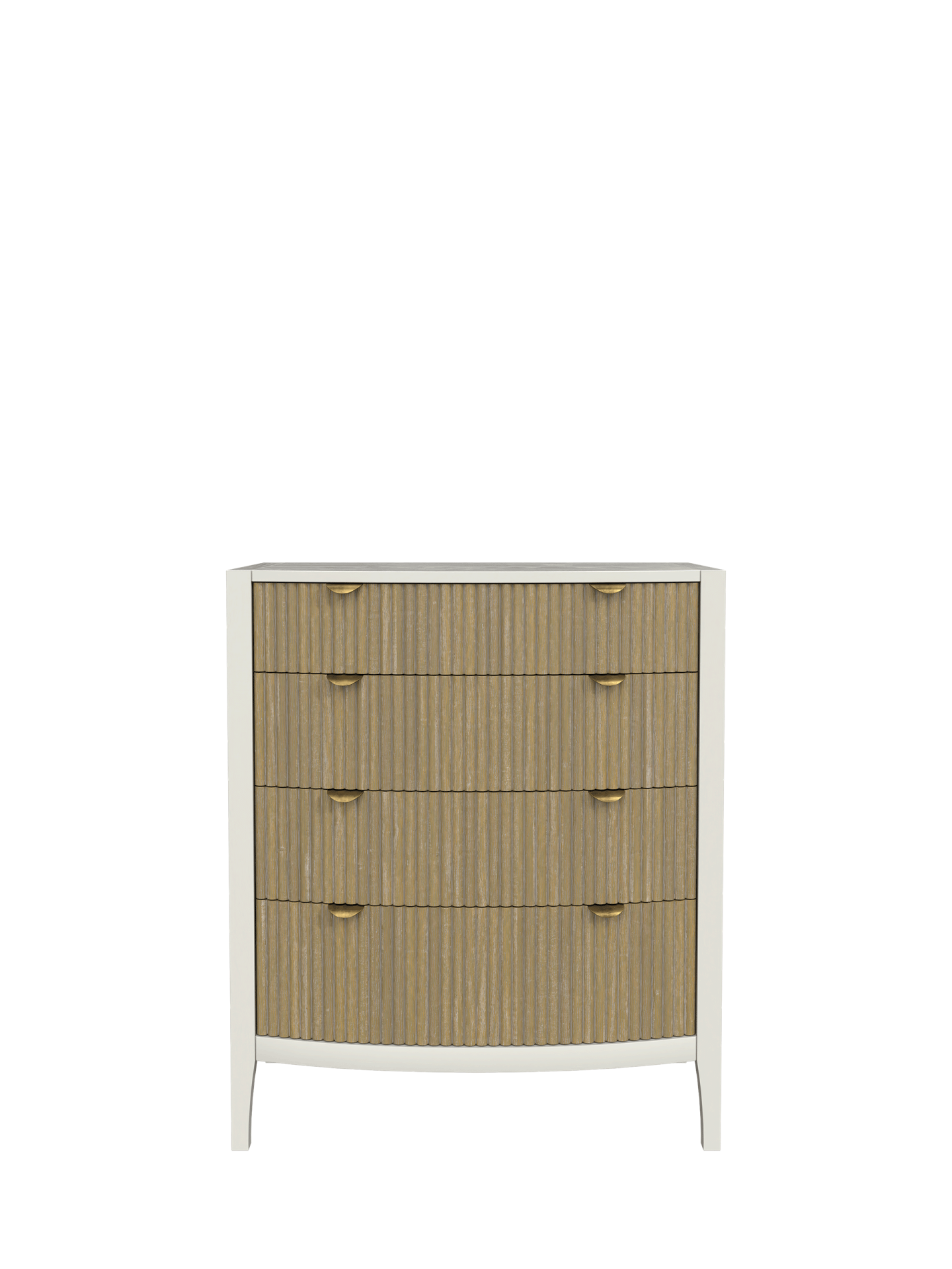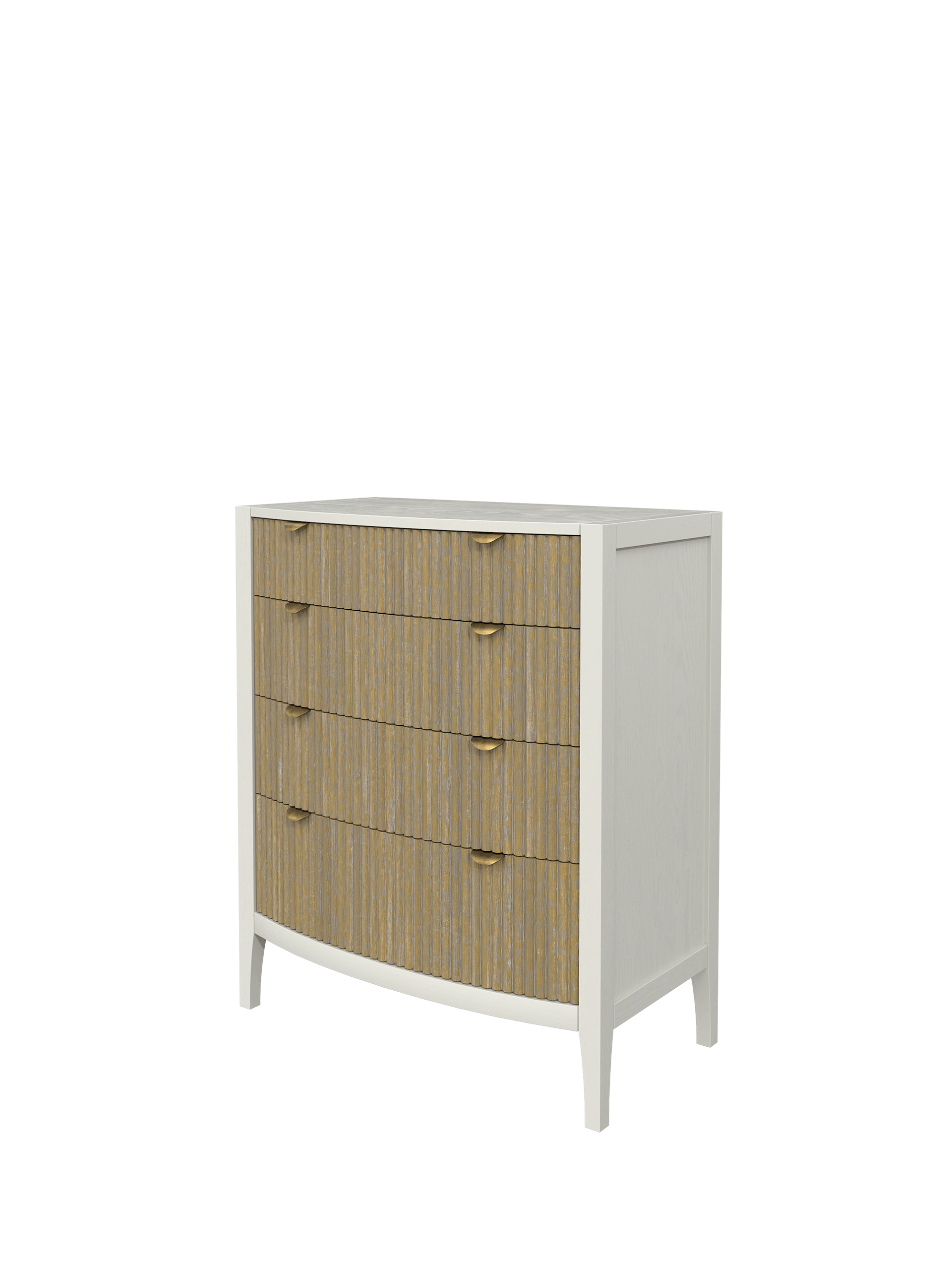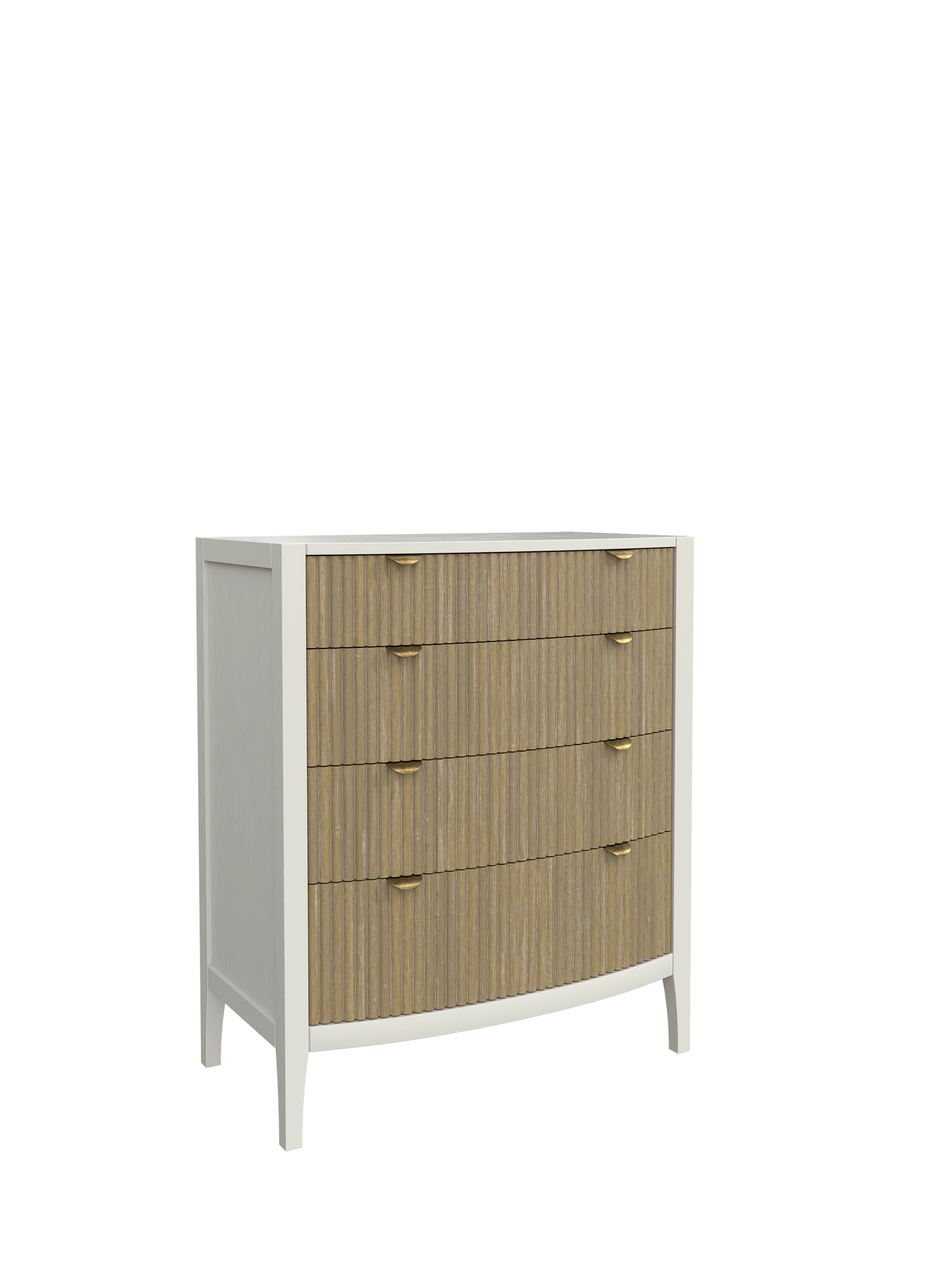 Abbeydale 12 Drawer Chest combines a quintessential British style with innovation and charm. This generously proportioned chest marries elements of the Art Deco style with the recent trend for weathered ribbed panels. The curving drawer fronts and simple silhouette present a contemporary yet elegant appearance, perfect for modern luxury decorating. Local Elm solids and veneers are used in the construction of the carcase, subtly brushed to accentuate the grain which can be seen through the Soft Natural paint finish. Solid poplar is then used for the ribbed details, lightly weathered and lacquered for protection. The drawer boxes are traditionally made, running on traditional wooden rails and dressed with brushed brass knobs and tab handles.