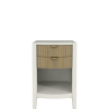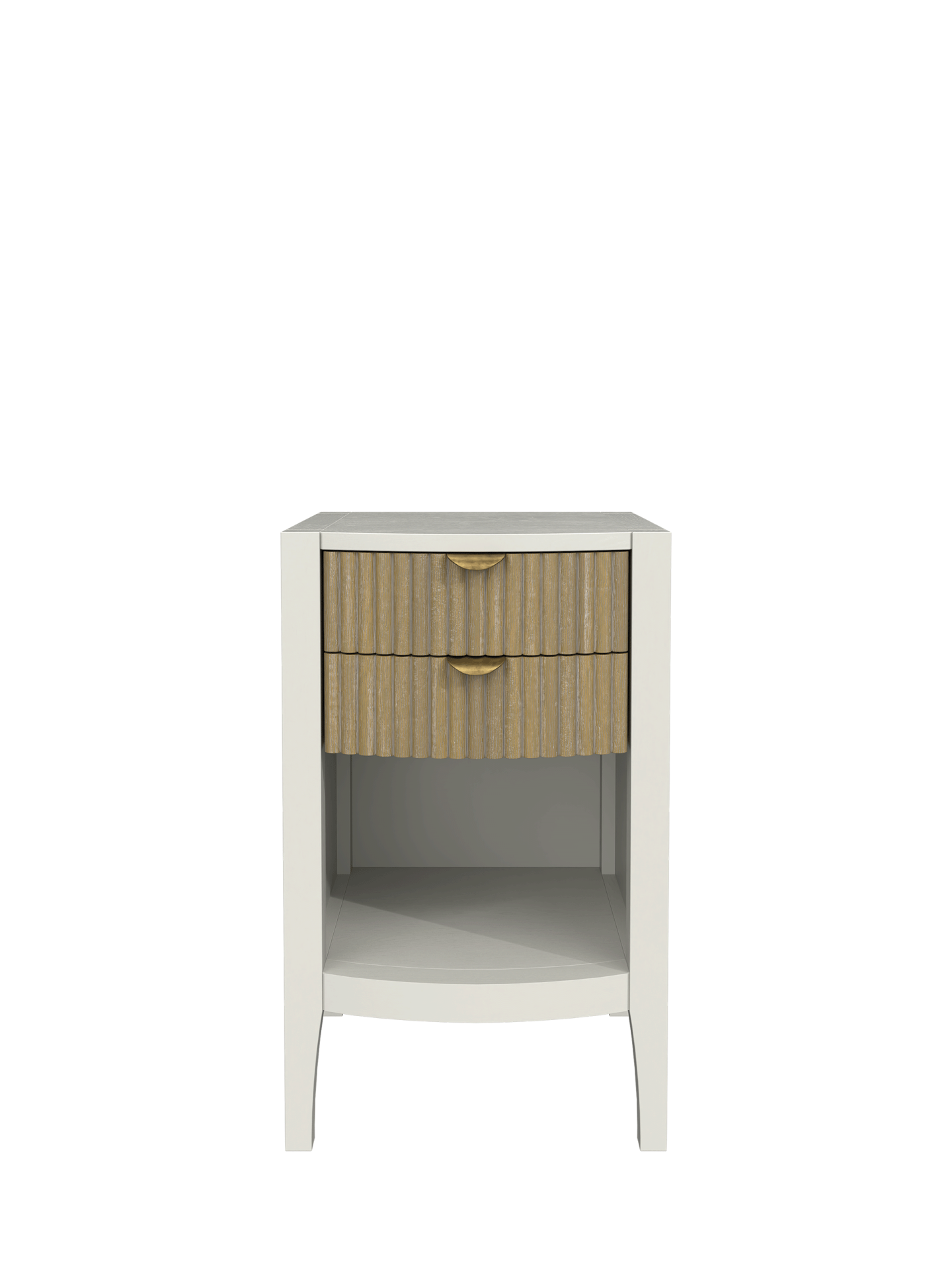 Abbeydale 2 Drawer Bedside Table combines a quintessential British style with innovation and charm. This practical bedside chest marries elements of the Art Deco style with the recent trend for weathered ribbed panels. The curving drawer fronts and simple silhouette present a contemporary yet elegant appearance, perfect for modern luxury decorating. Local Elm solids and veneers are used in the construction of the carcase, subtly brushed to accentuate the grain which can be seen through the Soft Natural paint finish. Solid poplar is then used for the ribbed details, lightly weathered and lacquered for protection. The drawer boxes are traditionally made, running on traditional wooden rails and dressed with brushed brass knobs and tab handles.