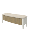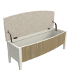 Abbeydale Blanket Box combines a quintessential British style with innovation and charm. This practical storage piece marries elements of the Art Deco style with the recent trend for weathered ribbed panels. The curving front and simple silhouette presents a contemporary yet elegant appearance, perfect for modern luxury decorating. Local Elm solids and veneers are used in the construction of the carcase, subtly brushed to accentuate the grain which can be seen through the Soft Natural paint finish. Solid poplar is then used for the ribbed details, lightly weathered and lacquered for protection. The lid opens and closes with a safe, soft close mechanism and doubles as a seat; beatifully upholstered inside and out with a natural poly-cotton fabric.