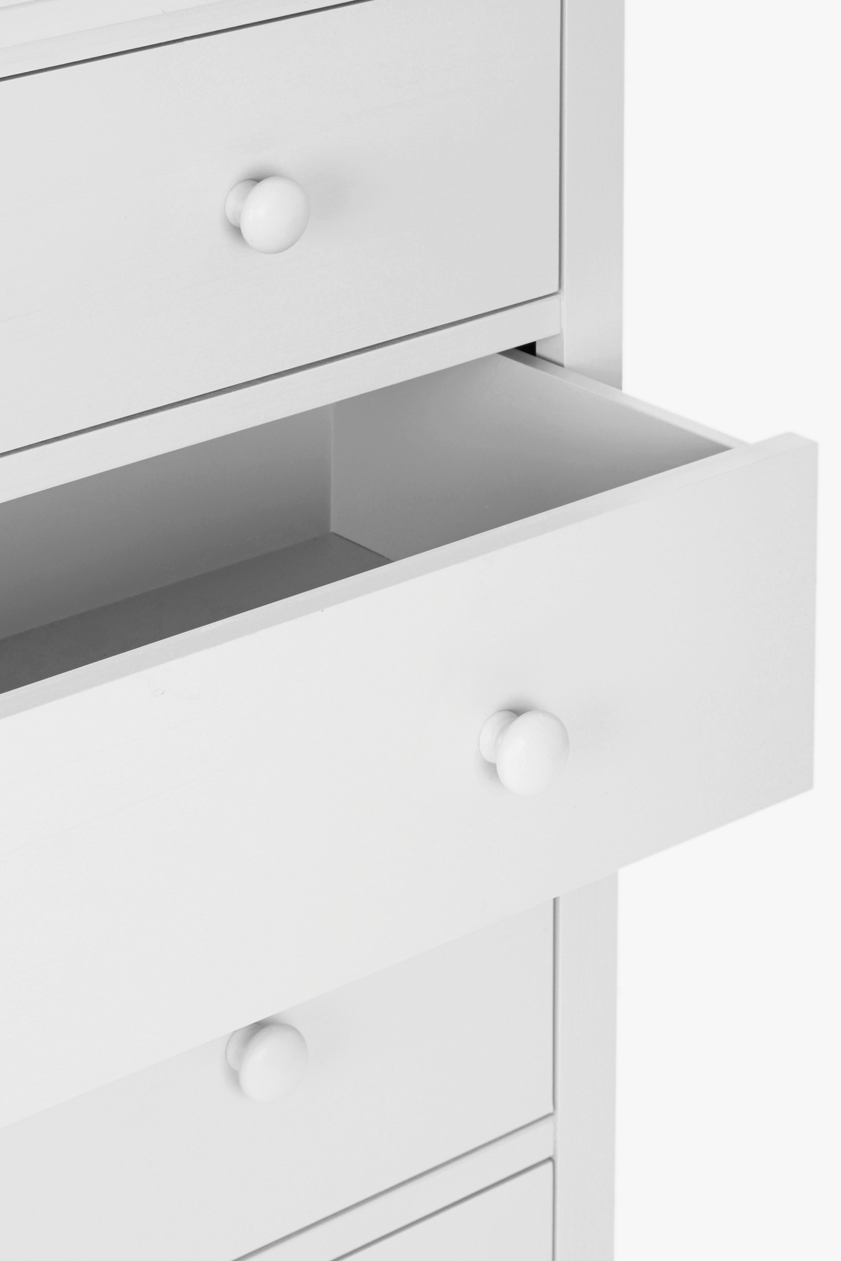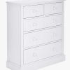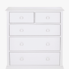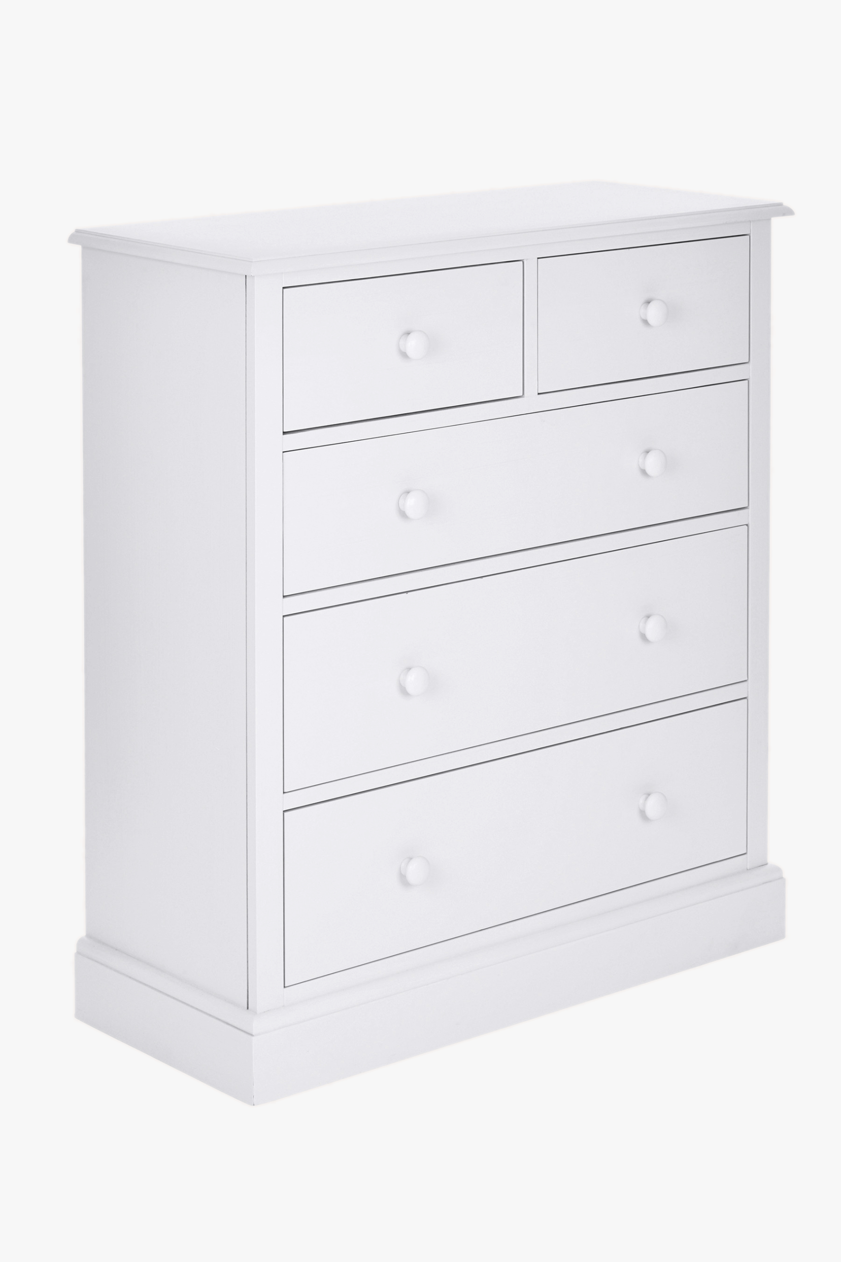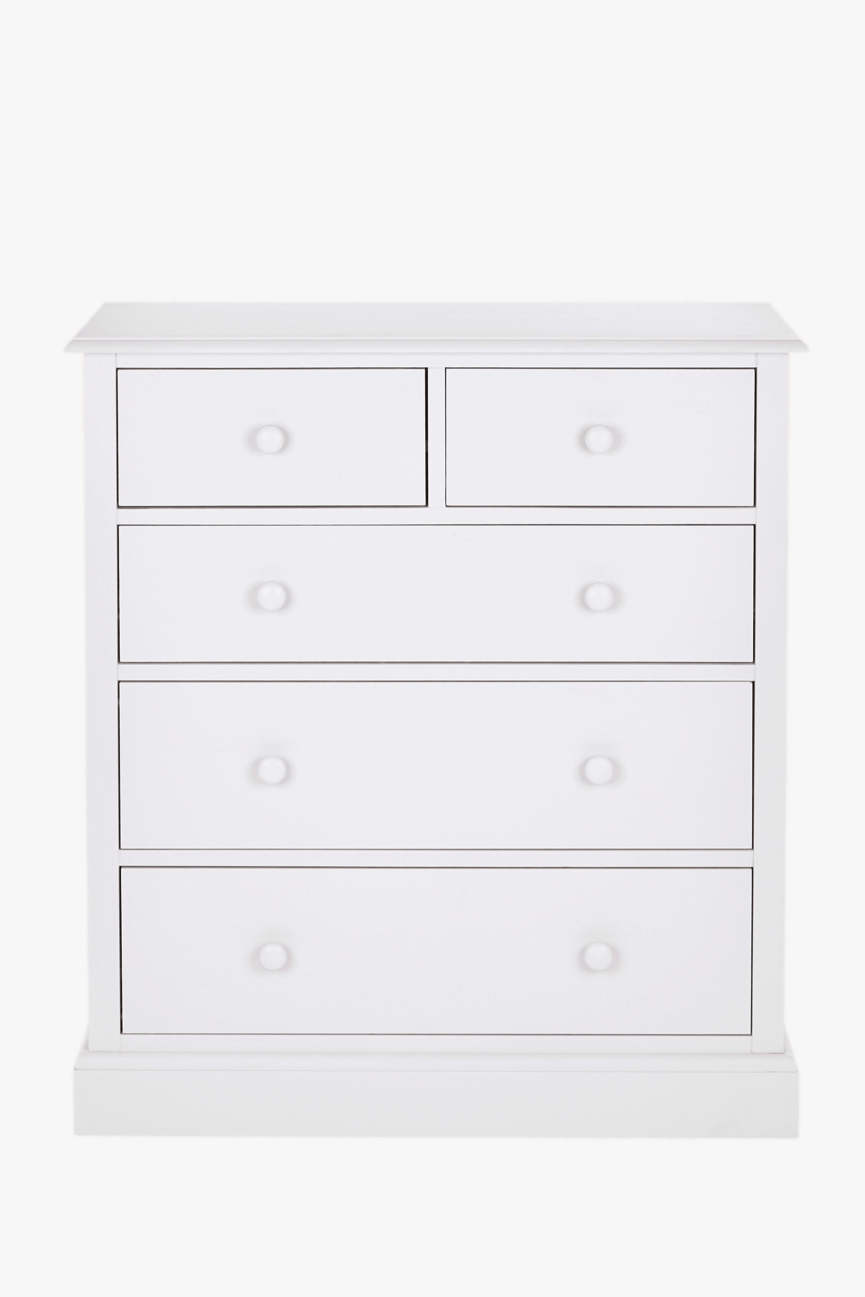 The Laura Ashley Ashwell 2+3 Drawer Chest comprises two small drawers and three double drawers providing plentiful storage. It is traditional in design with painted, modern materials and features turned wooden handles, wooden runners, a profiled top and a bottom plinth.