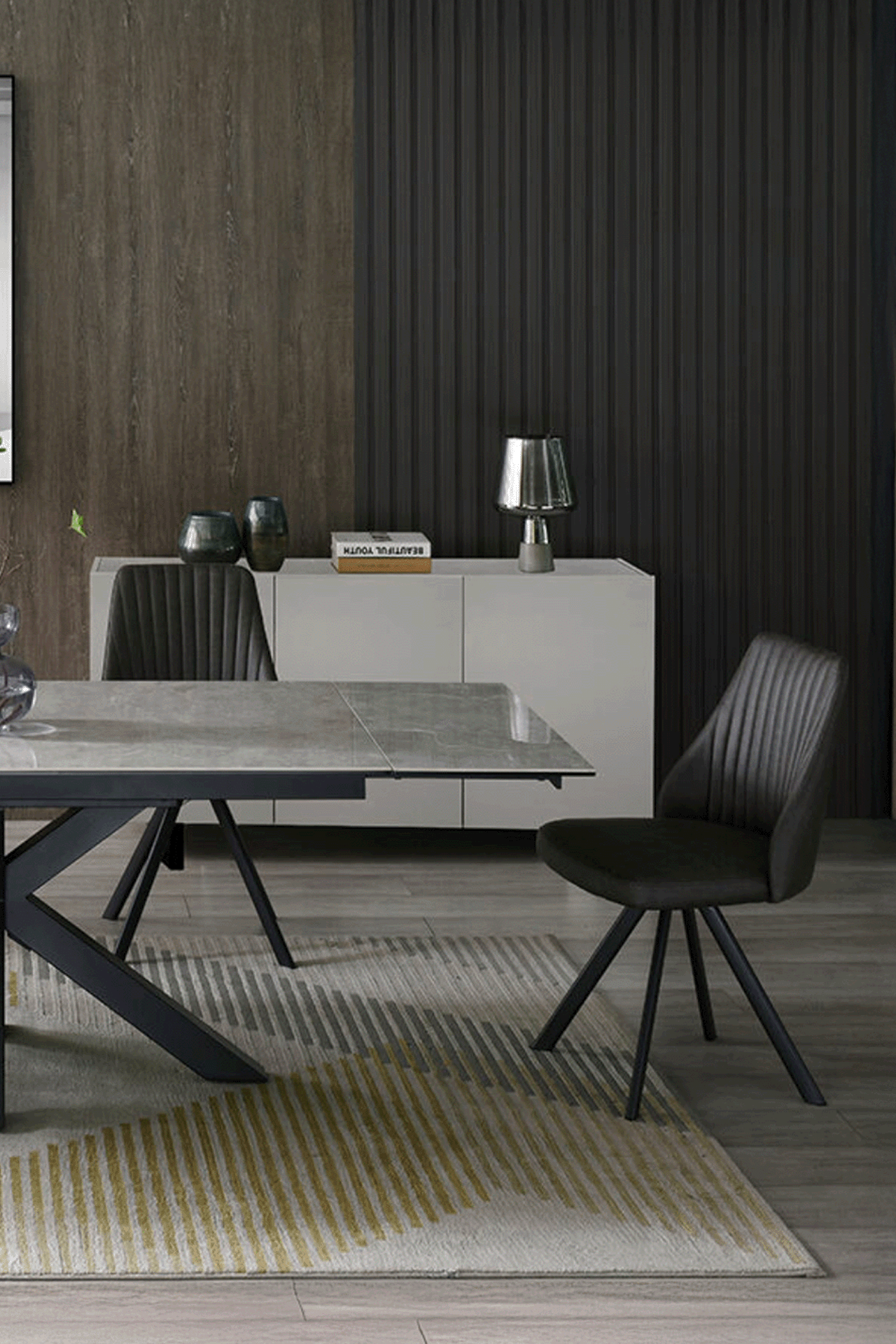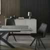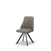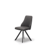 This chair really has it all in its versatility, clean contemporary lines, attractive ribbed details, and a fully cushioned seat and back upholstered in a light grey, dark grey or brown faux bison upholstery. It features a swivel mechanism with return making it easy to keep up with the conversation around your dining table. The legs are finished in a smart black powder coat.