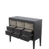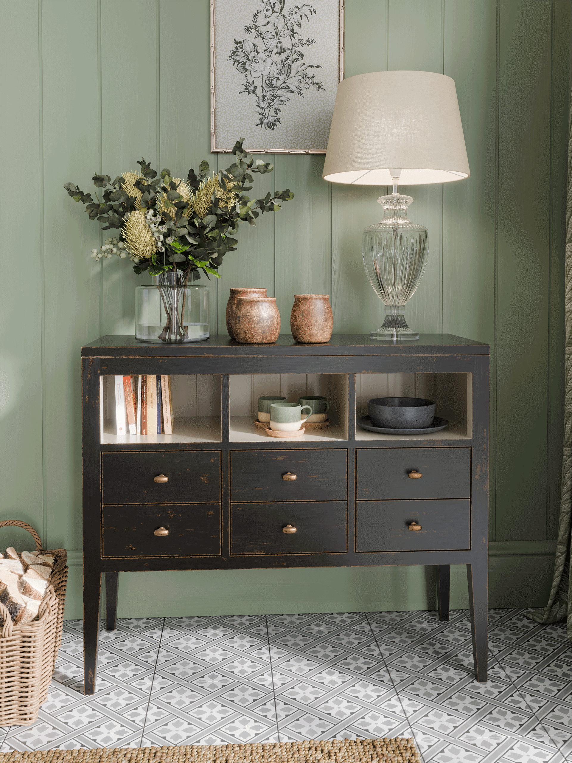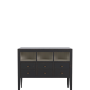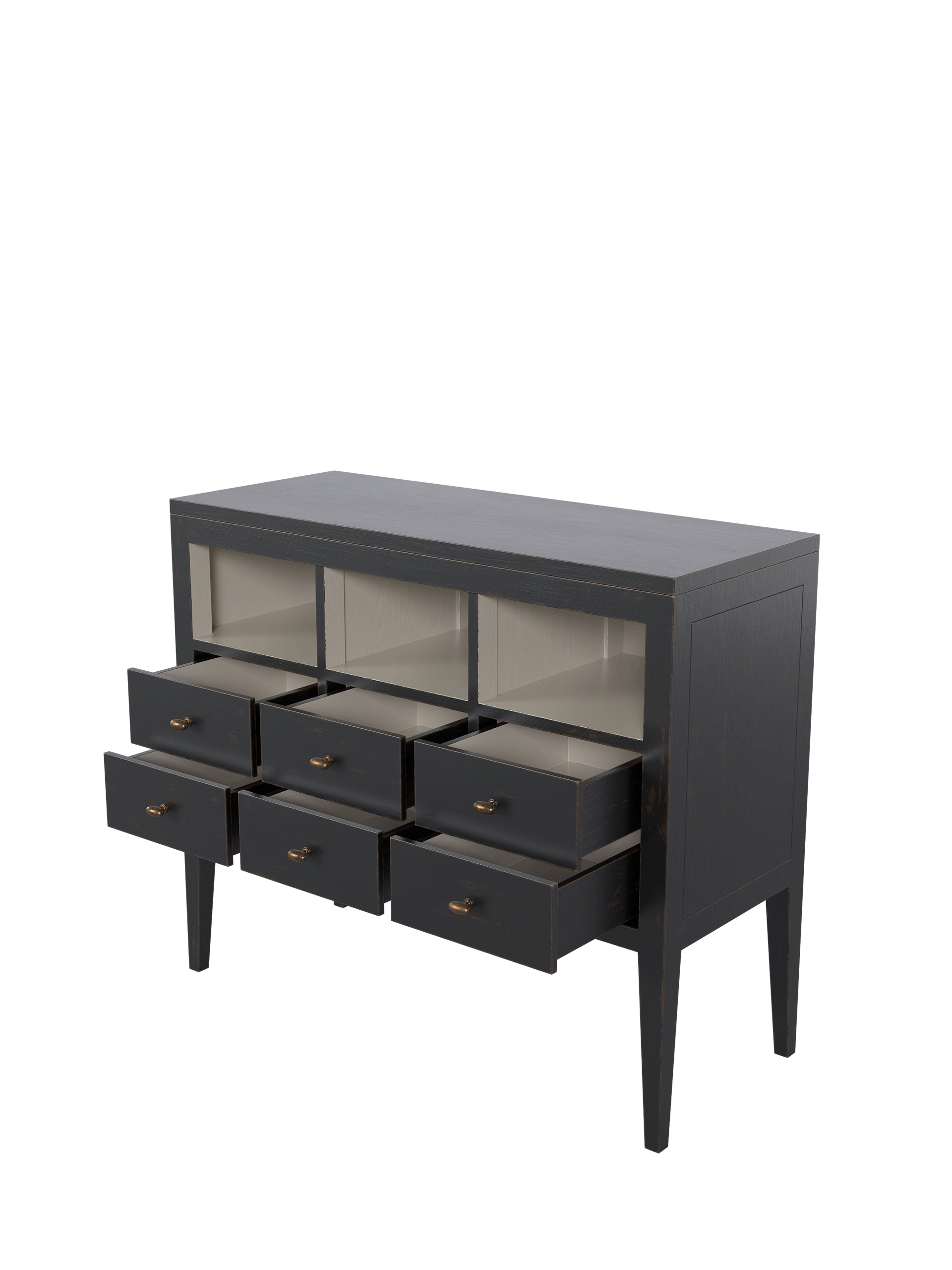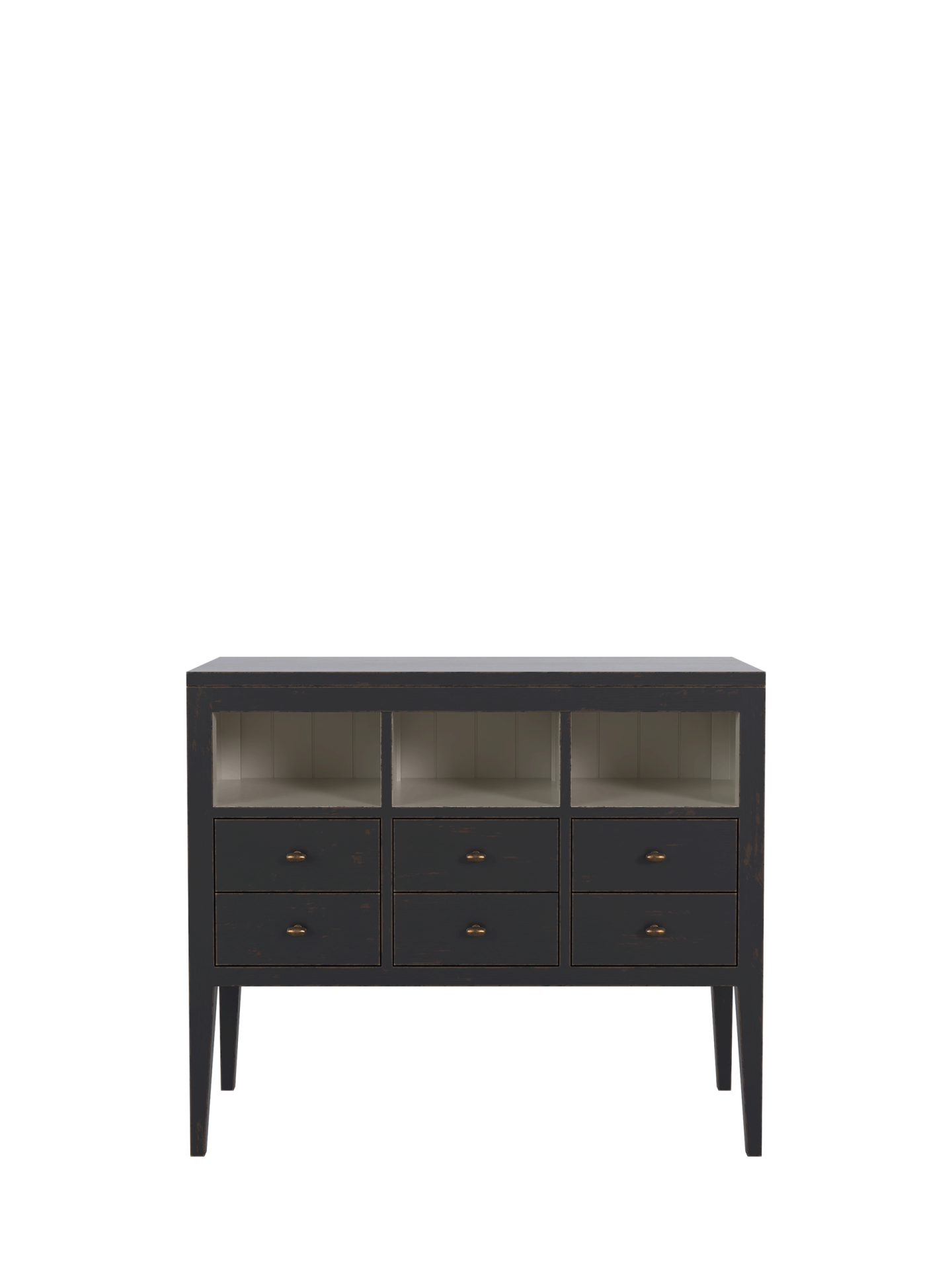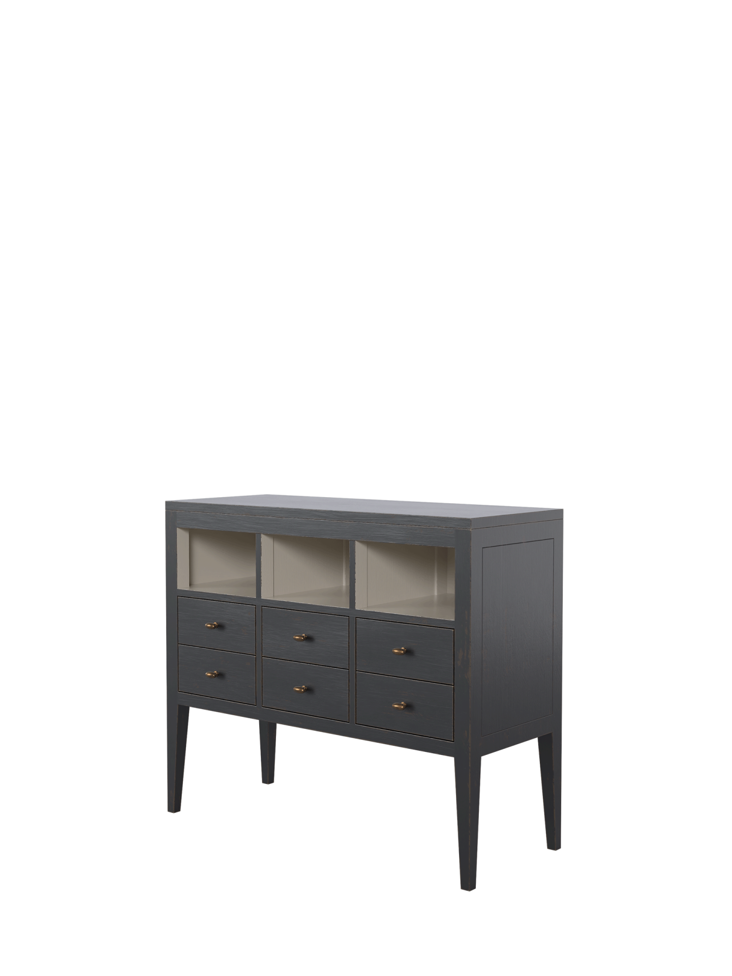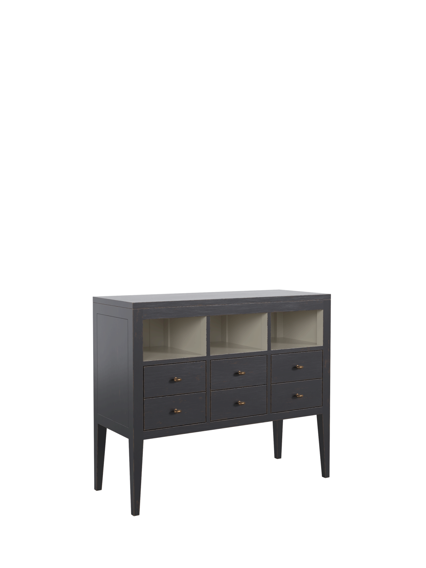 Barwick 6 Drawer Low Bookcase is ideal for a Kitchen / Diner space where a free-standing and retro décor are desired. Local Bayur solids and modern materials are used to create clean lines and a simple shape accentuated with recessed panels and detail grooves. Drawer boxes are traditionally made, running on the carcase and are furnished with antiqued handles. The subtly figured timber is hand-painted externally with Charcoal and then edges and selected surfaces are hand-distressed to reveal a burnt umber undercoat. A beautifully contrasting Soft Natural is then used for the interiors. Finally a clear matt lacquer is used to finish the surfaces providing long-lasting protection.