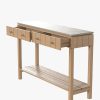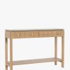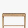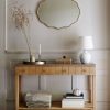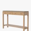 The Laura Ashley Braystone 2 Drawer Console Table is contemporary and stylish with intricate detailing that makes it a perfect addition to any living space. Crafted from solid oak and oak veneer with a gently distressed white-washed finish, this console table features a warm grey sintered stone tabletop with gold accents on the oak hardware. This 2 drawer console table features a gorgeous mitred front, adding a touch of charm to your home.
