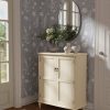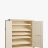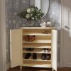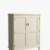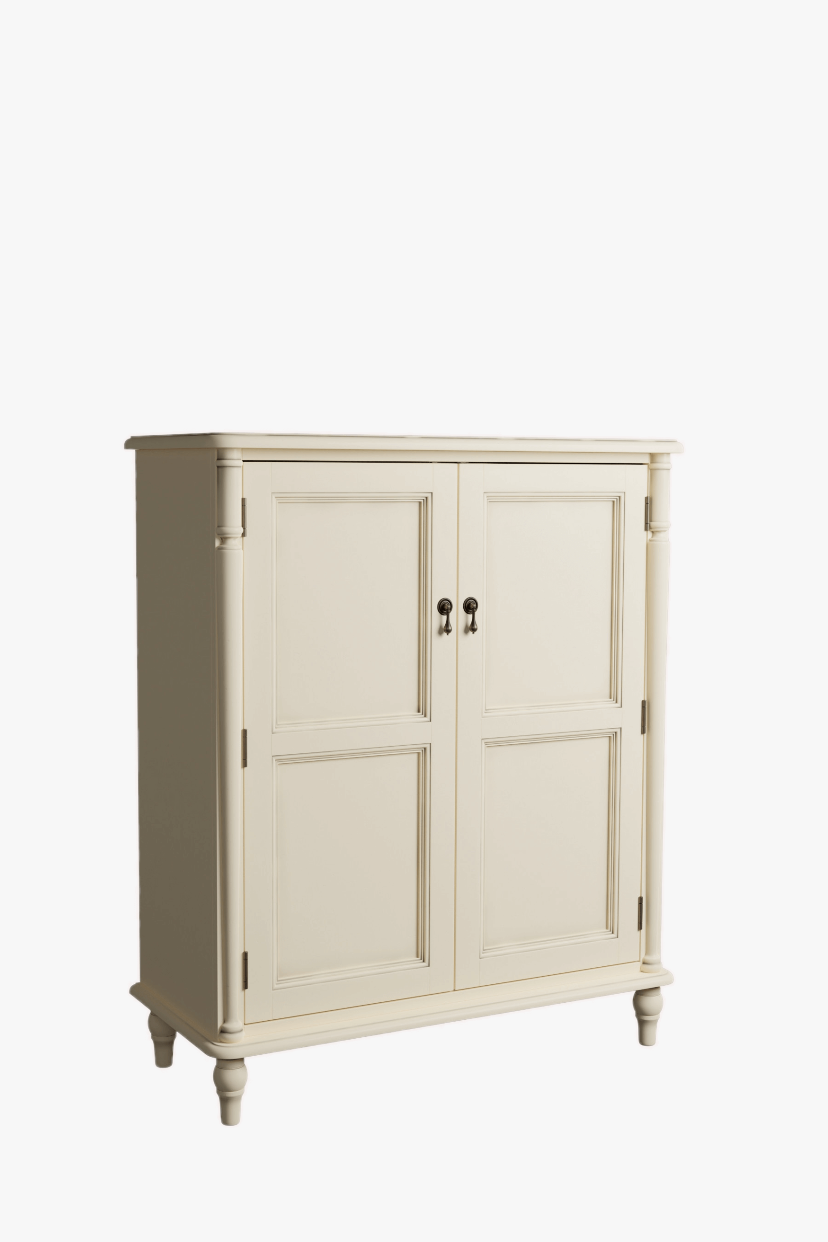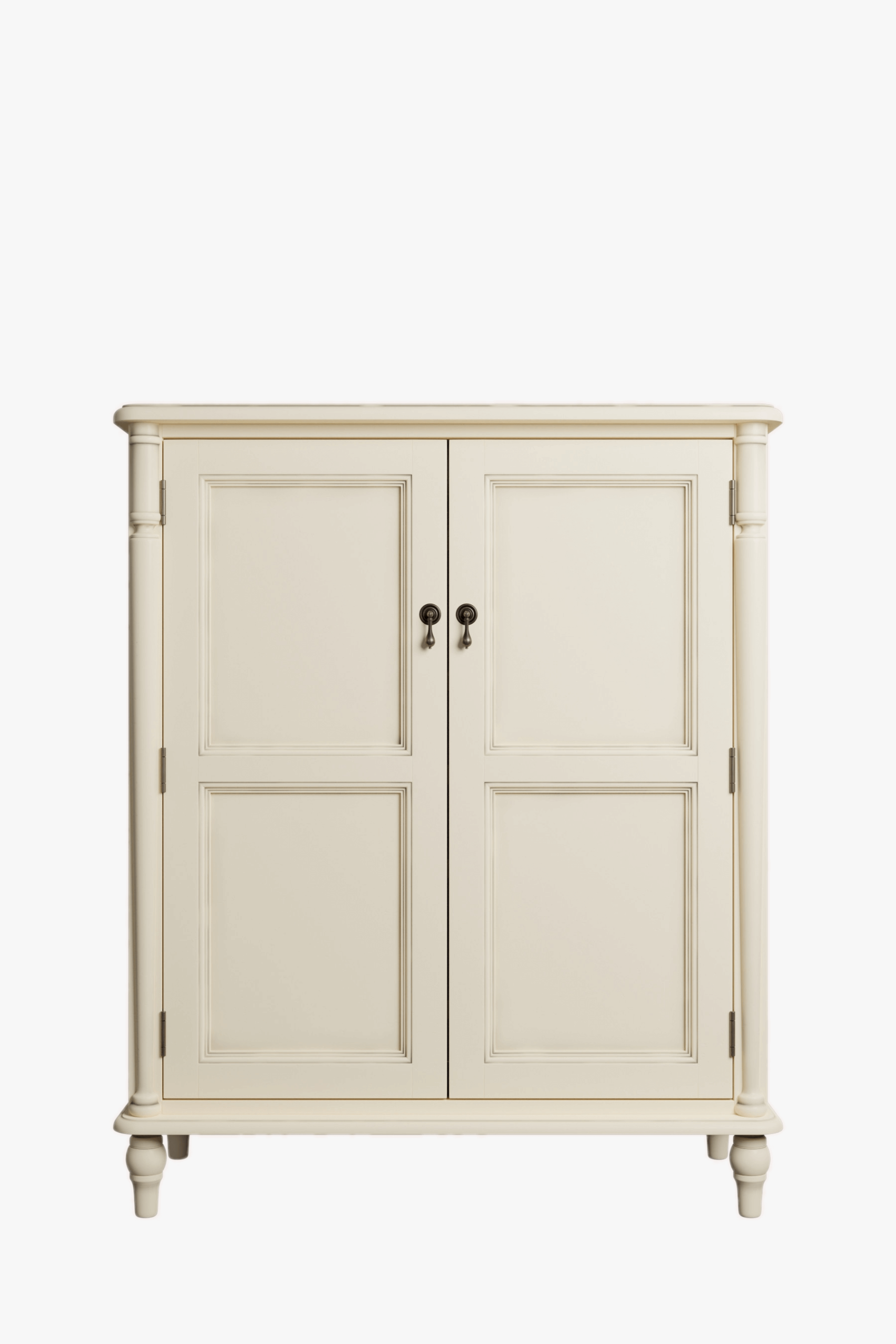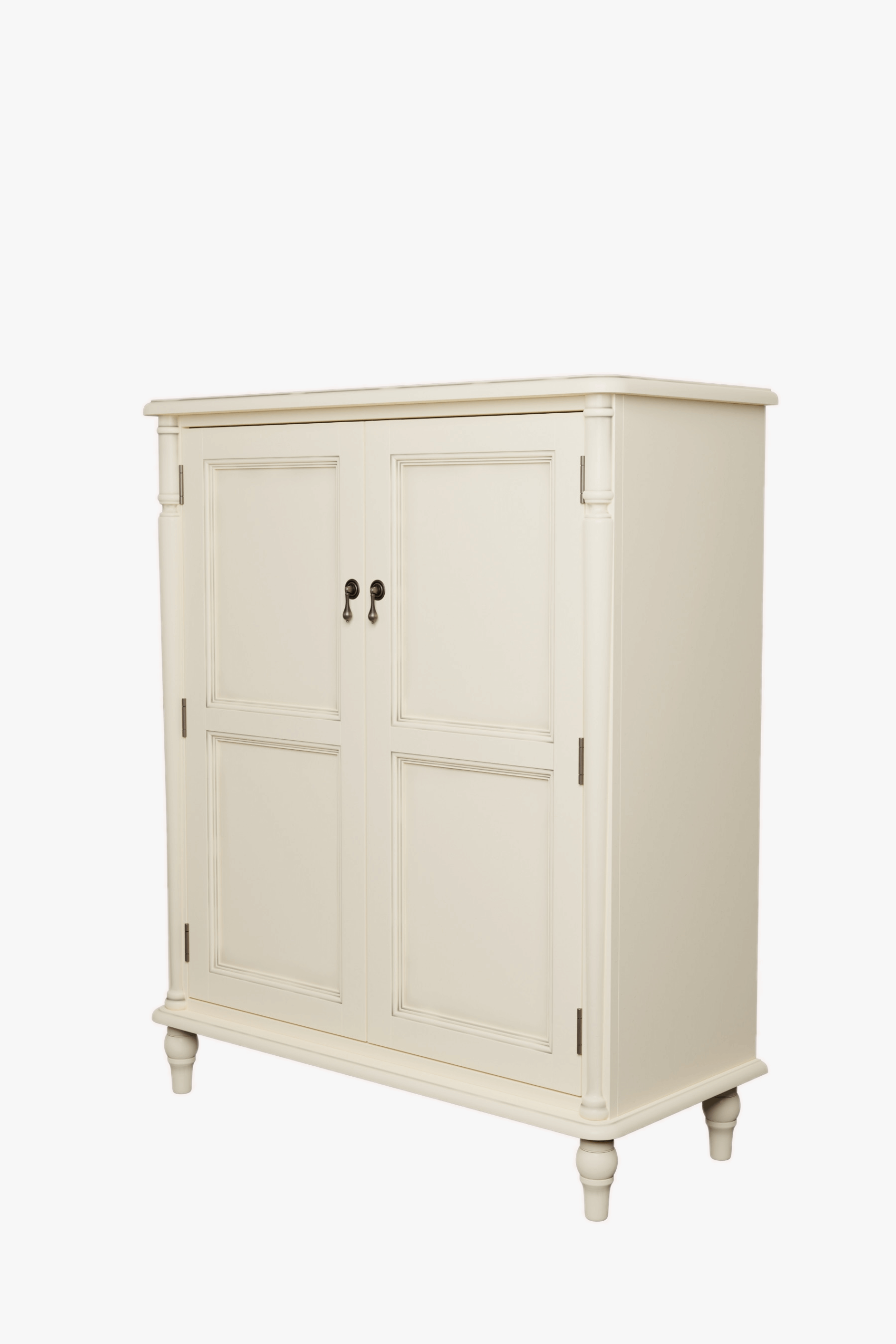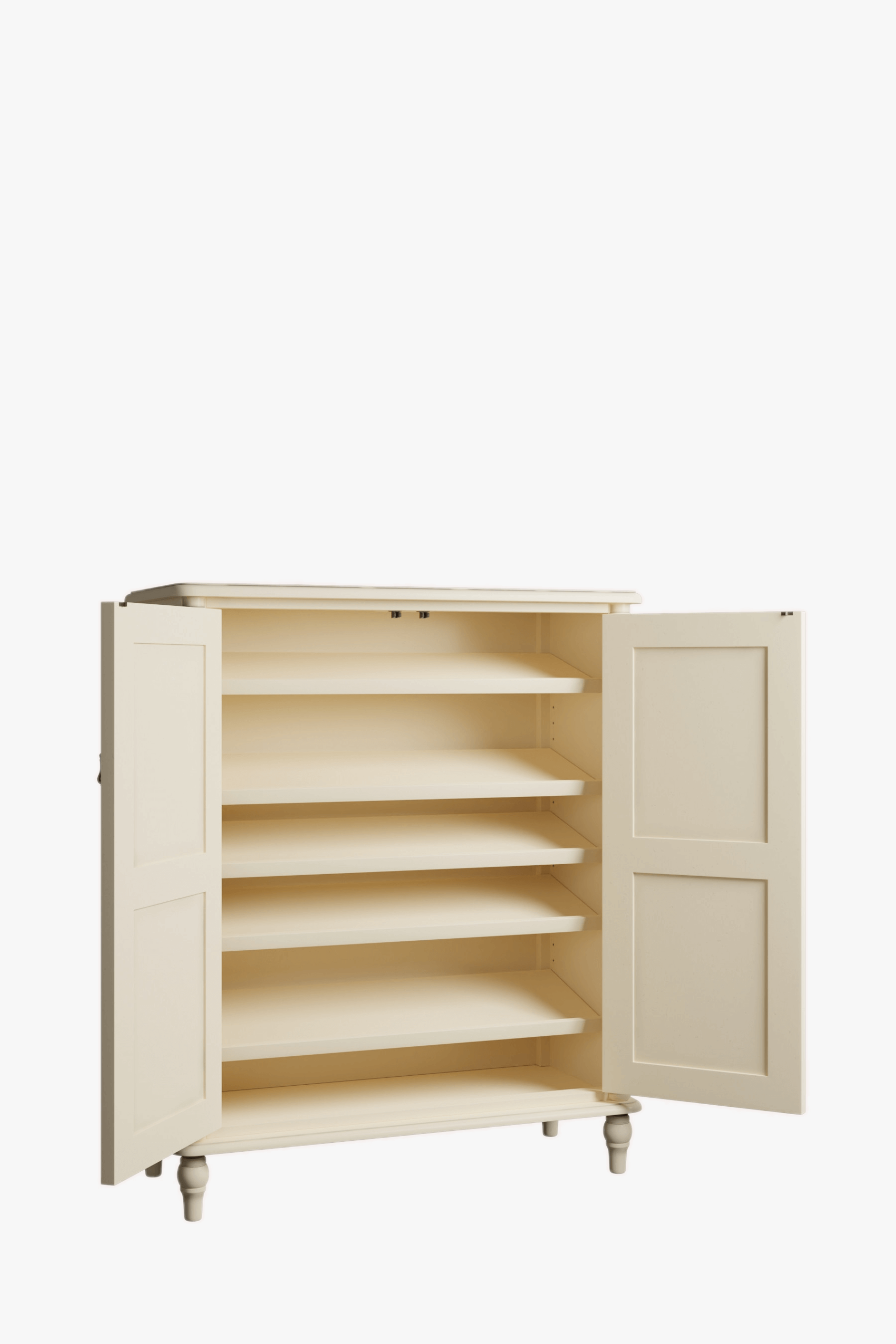 Timeless and elegant, the Clifton 2 Door Shoe Storage Cabinet boasts a hand applied patina to create a unique aged effect which is complemented by antiqued droplet handles. Inside the unit there are five shelves, angled and with a retaining lip so that upto 20 pairs of shoes and boots can be stored and displayed facing outwards. Each shelf is fully height adjustable so that the unit can variously accommodate flats, heels and tall boots.