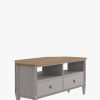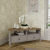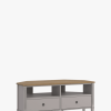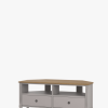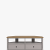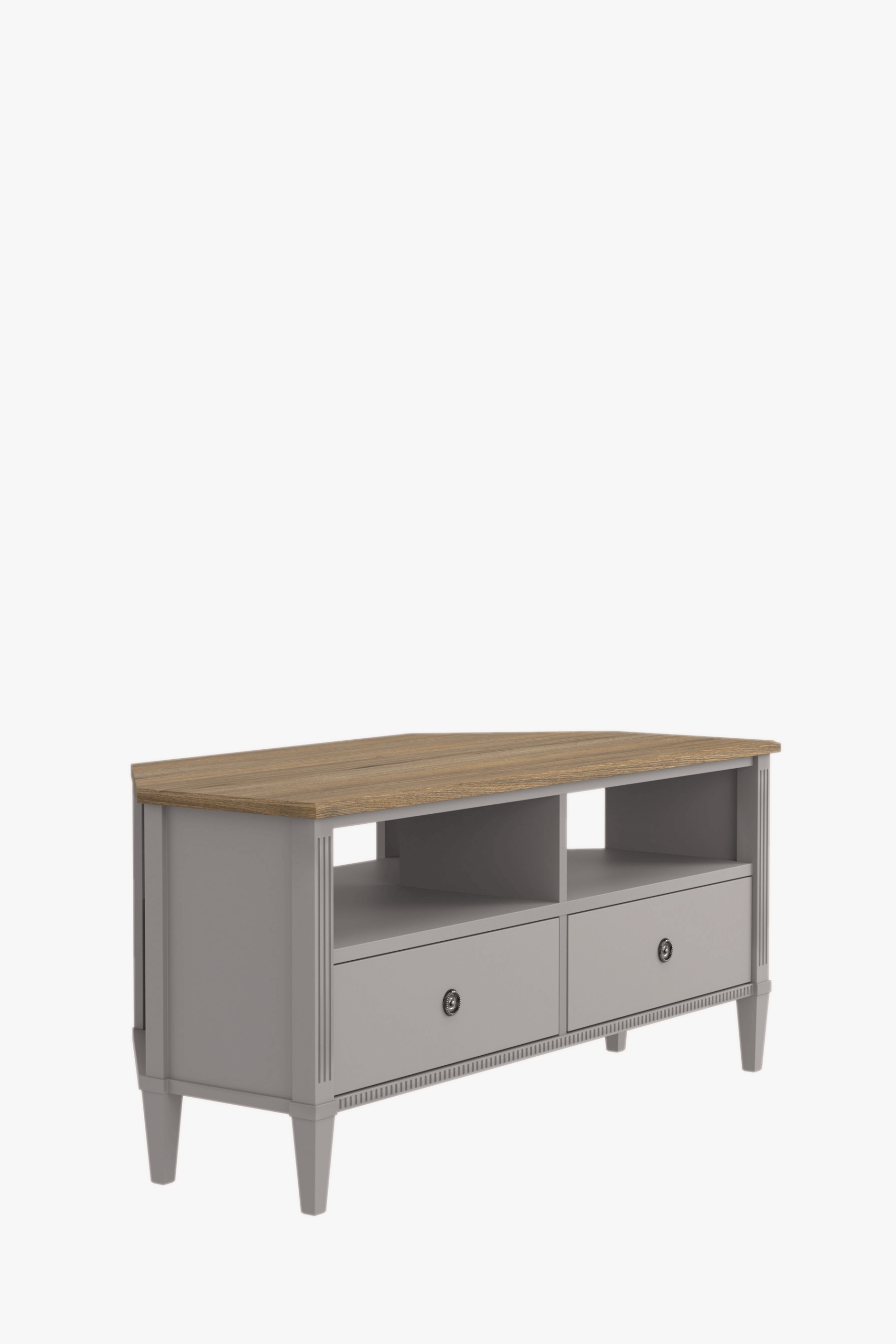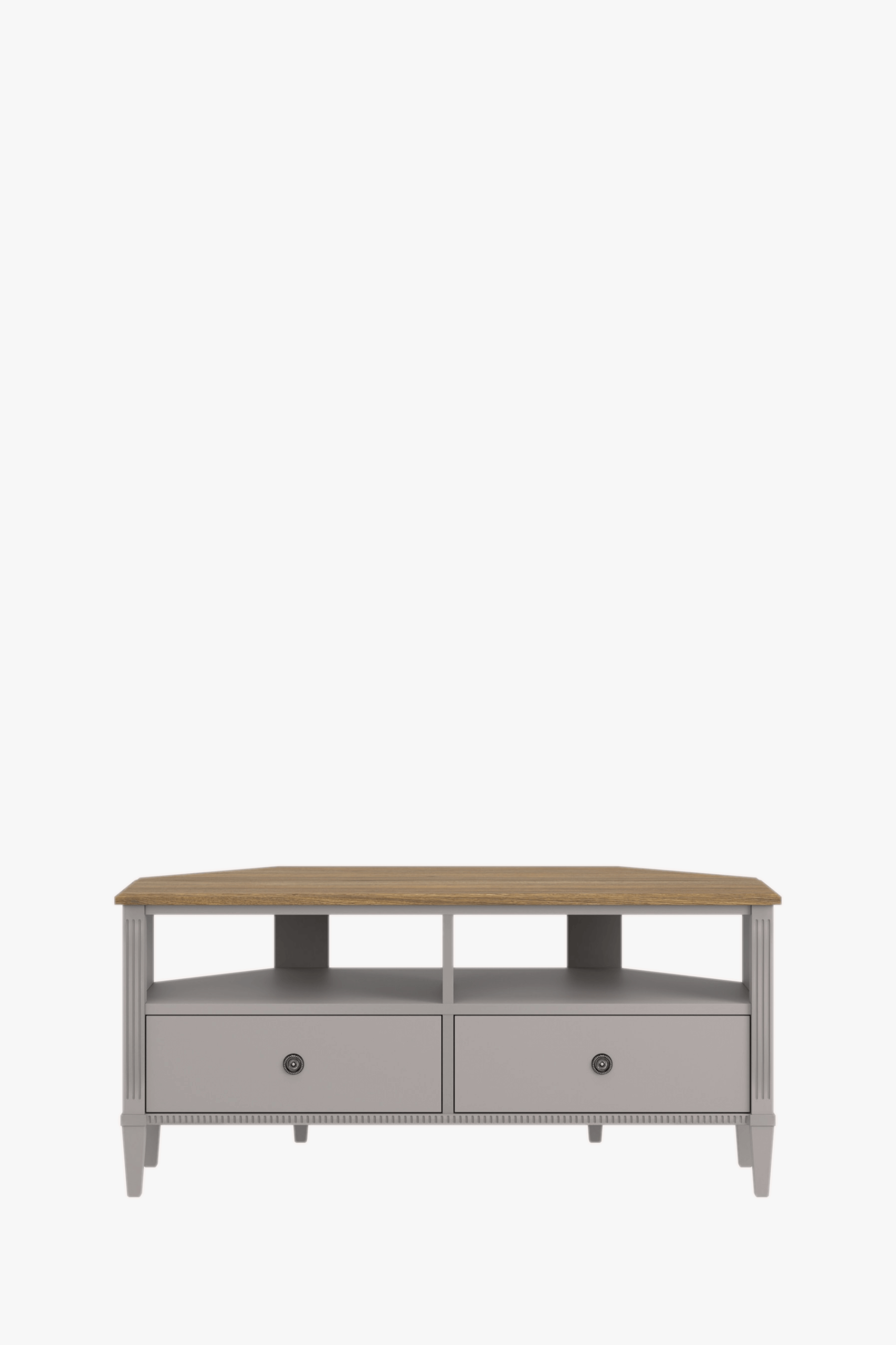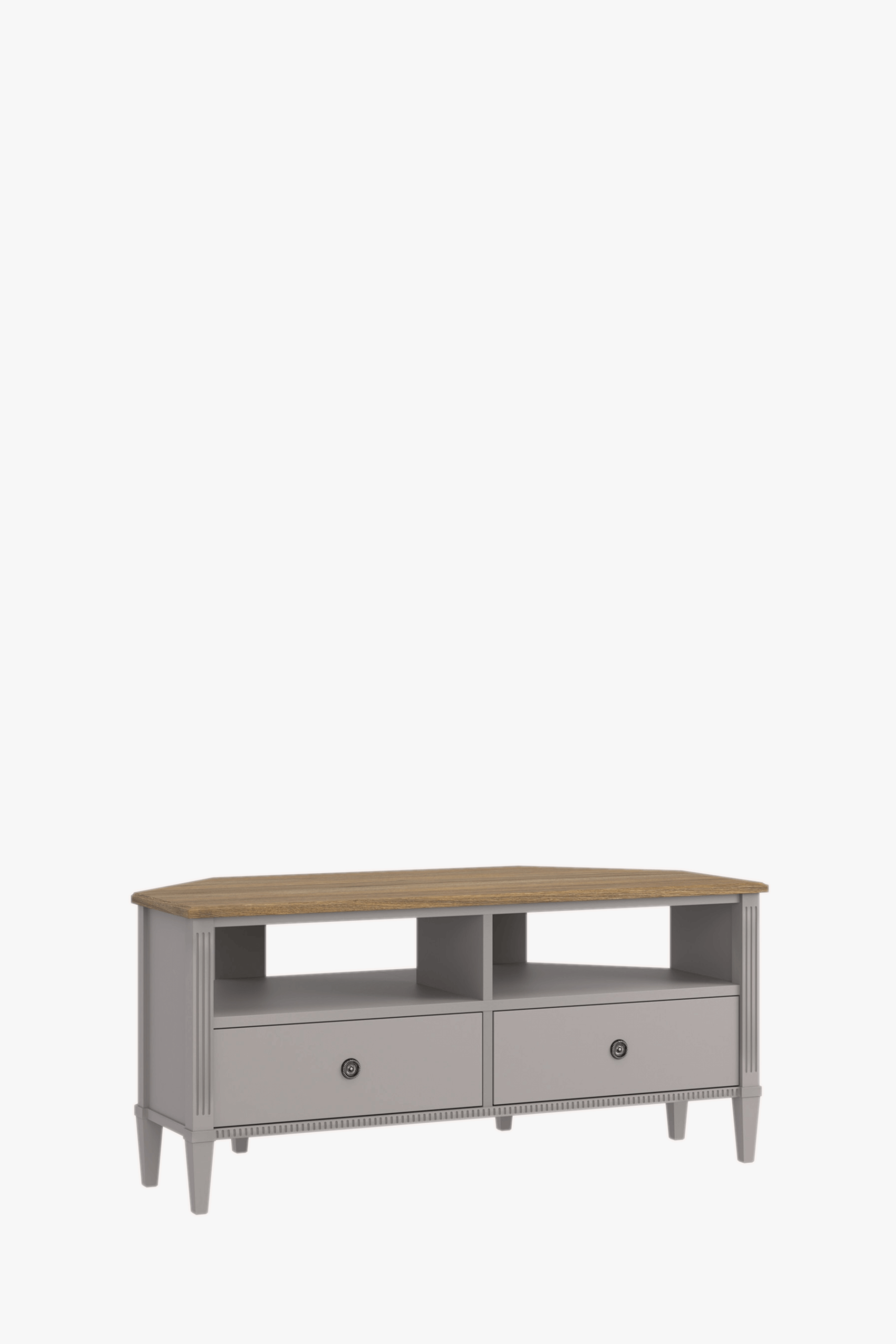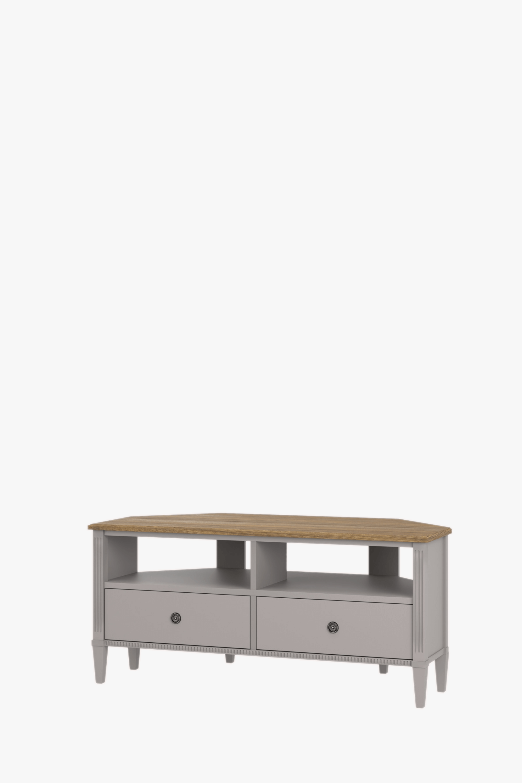 Boasting Gustavian inspired elegance and modern practicality, the Laura Ashley 2 Drawer Corner TV Unit will fit beautifully with many decorative styles. Flat panel televisions up to 43″ will fit on the oak veneered top without overhanging. Two deep drawers provide plenty of space for peripherals and remotes whilst the open backed shelf allows for the simple installation of disc players and TV boxes. Only the legs need to be attached to begin enjoying this piece; full assembly is not required.
