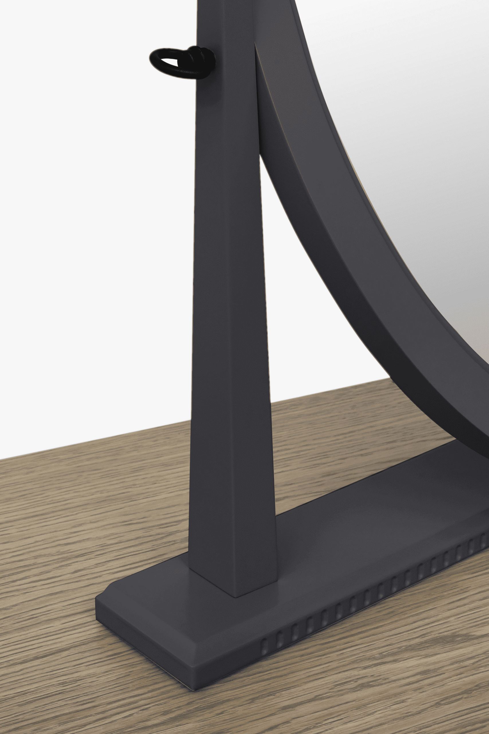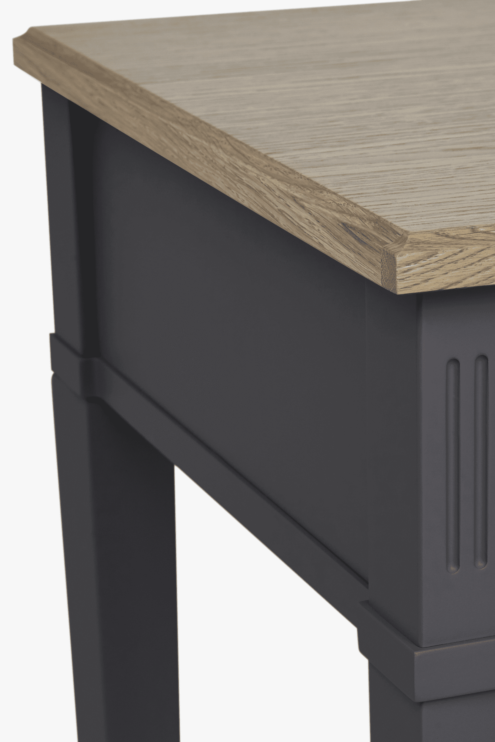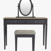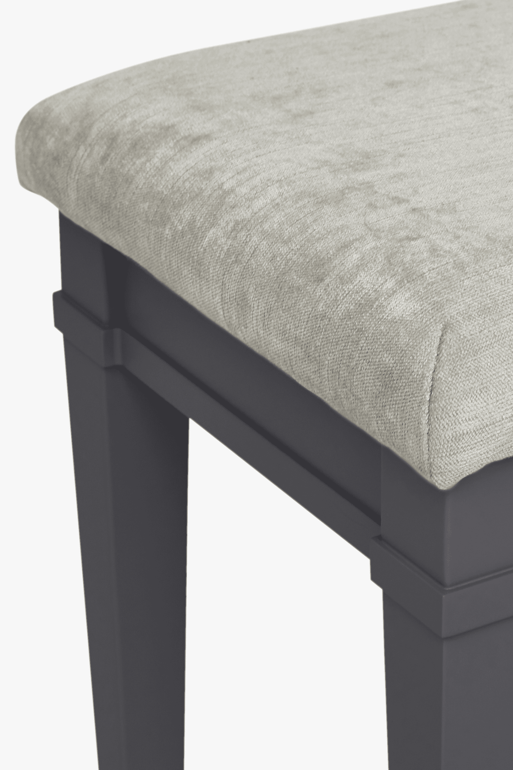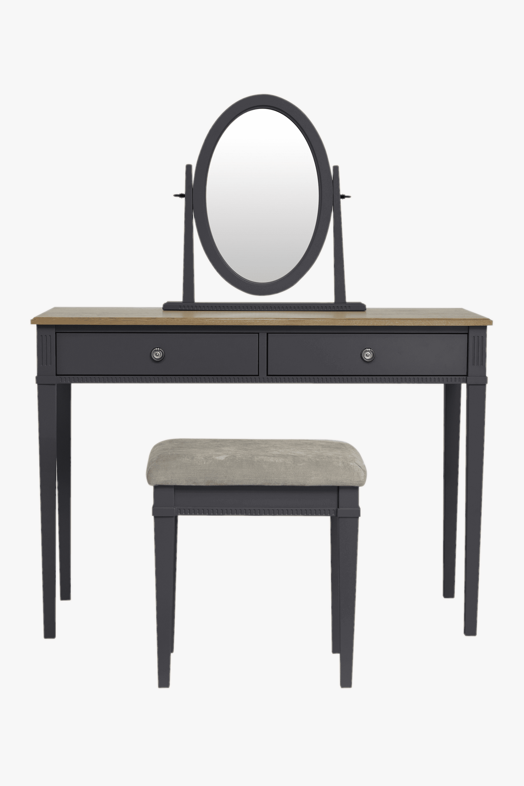 Beautifully proportioned, the Laura Ashley Eleanor 2 Drawer Dressing Table provides ample space for makeup and accessories with room to spare for its elegant tilting mirror. Two traditionally mounted drawers are included within its Gustavian inspired shape and the delicate design continues with the chenille upholstered stool. The painted finish is complemented with an oak veneered top and pewter effect ring handles. Subtle fluting in legs and scalloped dentils on the lower shelf complete the look.