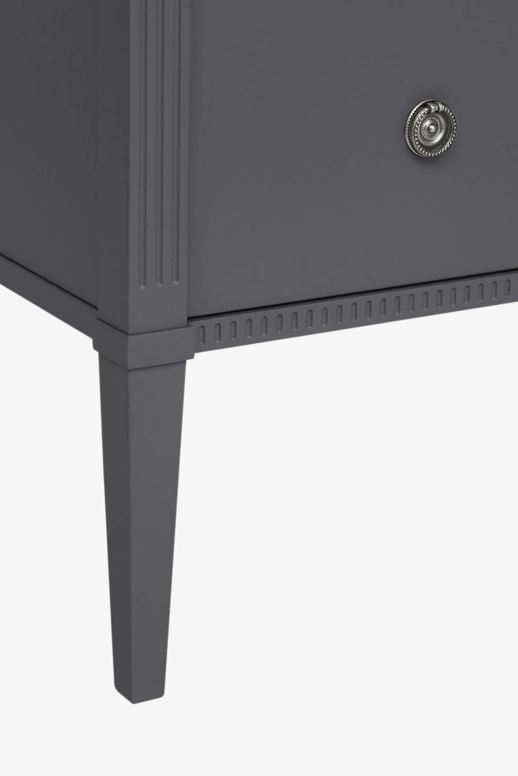 The Laura Ashley Eleanor 3 Drawer Chest features traditionally mounted drawers in is Gustavian inspired shape. The painted finish is complemented with an oak veneered top and pewter effect ring handles. Subtle fluting in legs and scalloped dentils on the lower rail complete the look. Only the legs need to be attached to begin enjoying this piece; full assembly is not required.