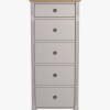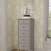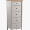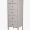 The Laura Ashley Eleanor 5 Drawer Chest features traditionally mounted drawers in is Gustavian inspired shape. The painted finish is complemented with an oak veneered top and pewter effect ring handles. Subtle fluting in legs and scalloped dentils on the lower rail complete the look. Only the legs need to be attached to begin enjoying this piece; full assembly is not required.