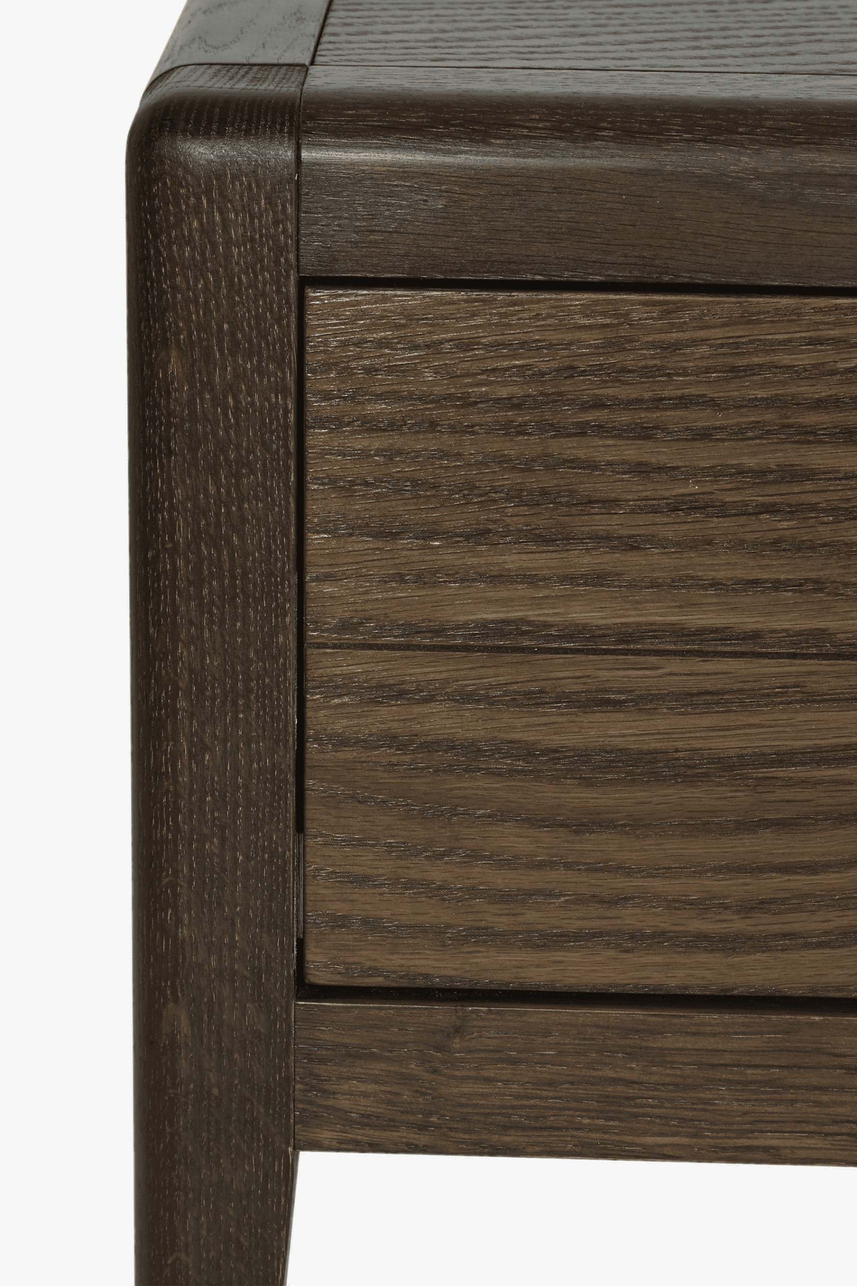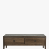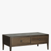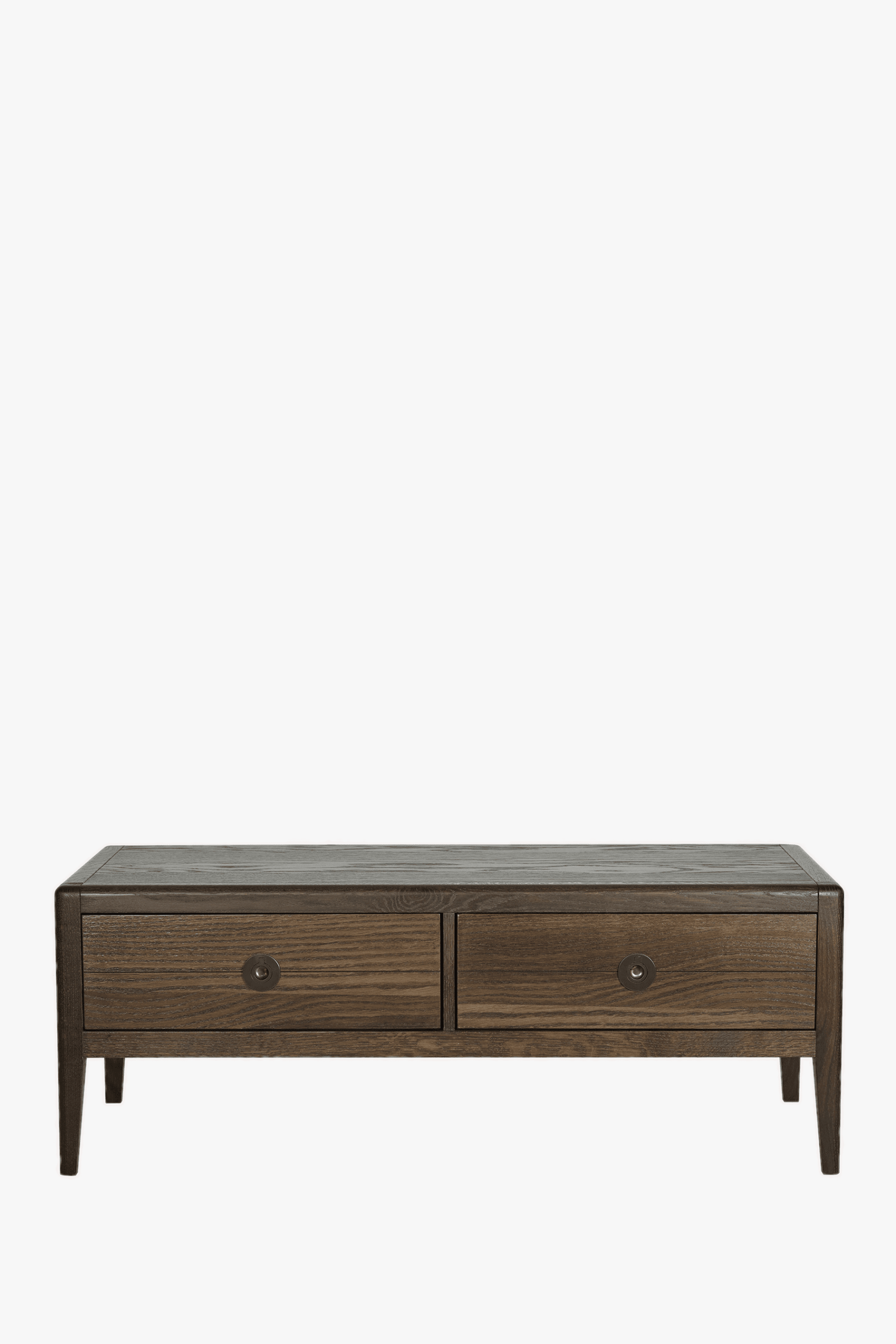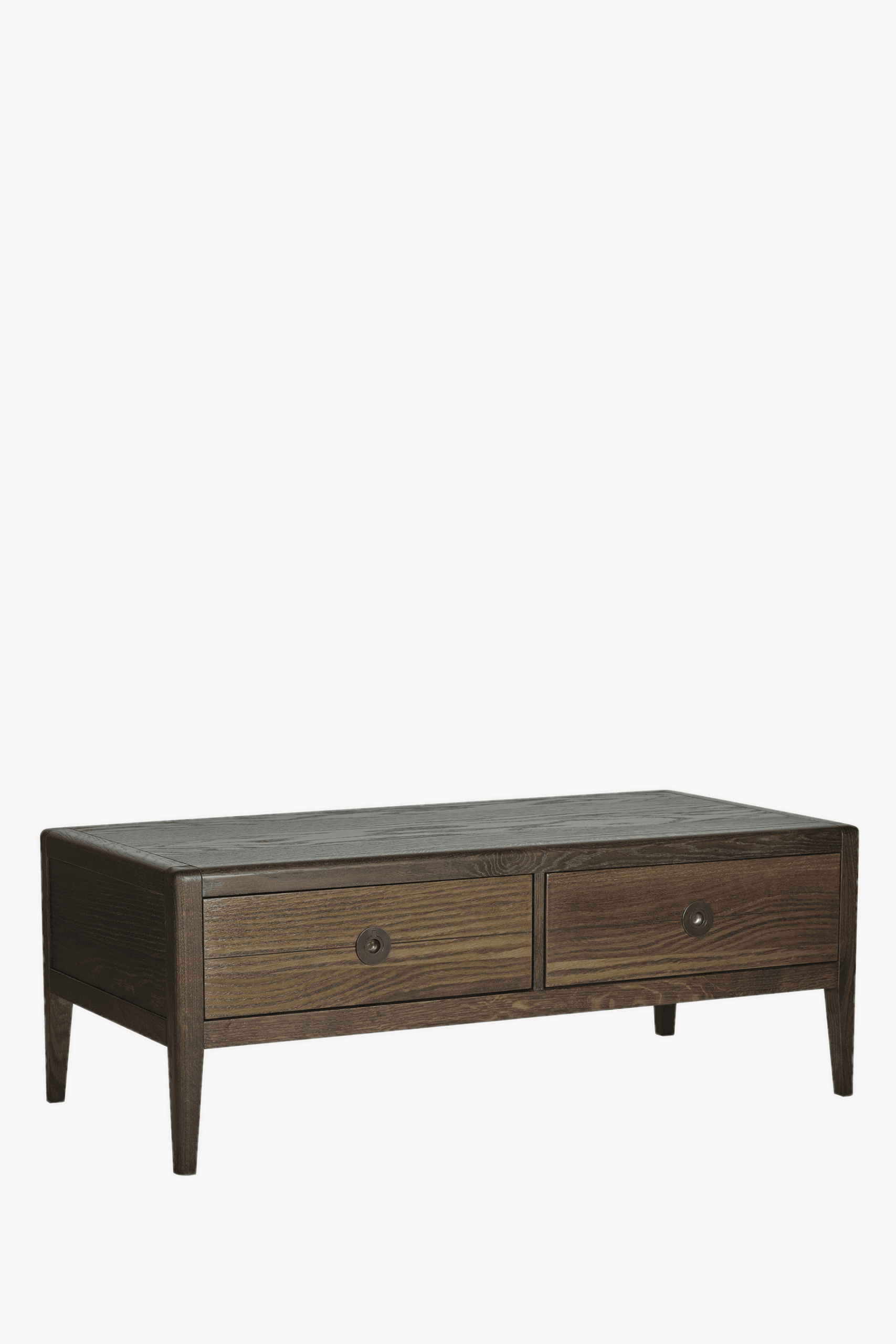 Crafted from oak the Laura Ashley Farnhill 2 Drawer Coffee Table expertly combines soft edges and elegantly tapered legs and a dark stained finish applied to accentuate the beautifully grained wood. This clever coffee table boasts two deep drawers for added handy storage space. 1 adjustable internal shelf