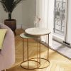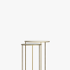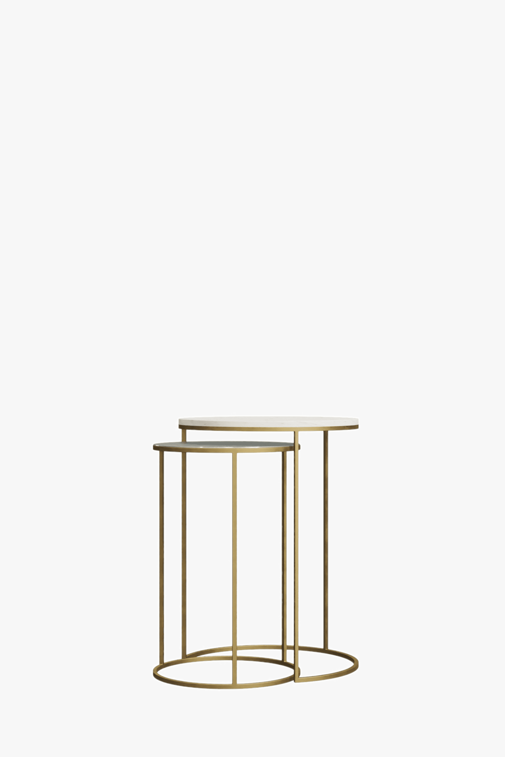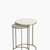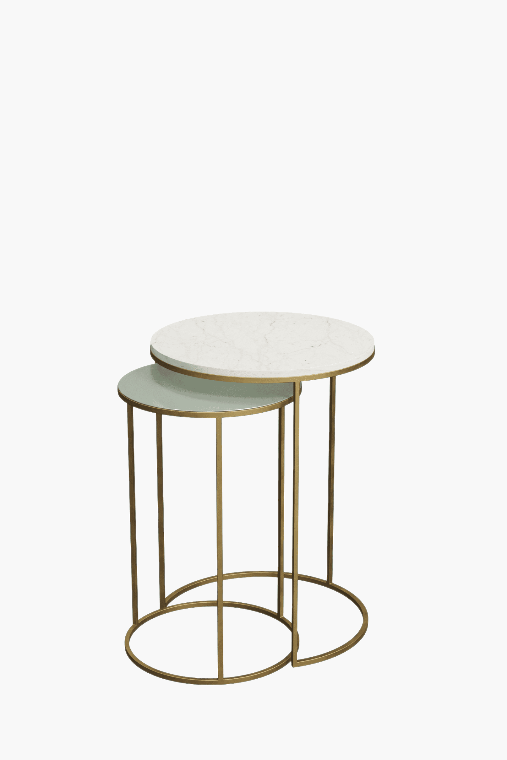 These compact yet useful occasional tables bring a pop of colour to any interior scheme. The combination of the marble with its characteristic veining with the cool sea green on the tops offers a visually pleasing and contemporary look.The frames of the White Marble & Sea Green variant are carefully fabricated from square steel rod with a brass colour powder-coated finish. The tops are white Banswara marble and, as such, no two will be alike. The lower shelves and small table tops are sheet steel with a sea green enamel effect finish.