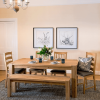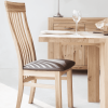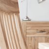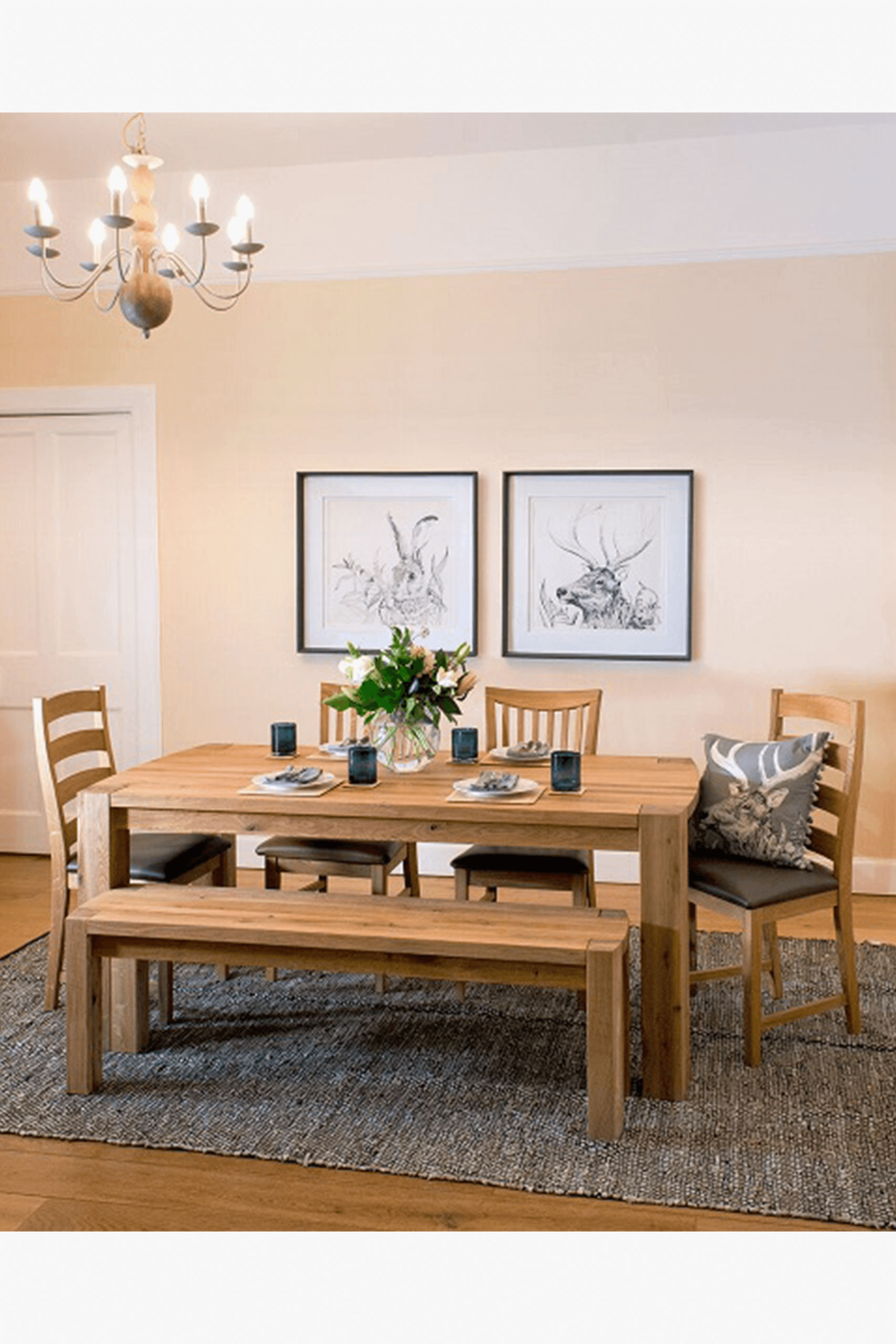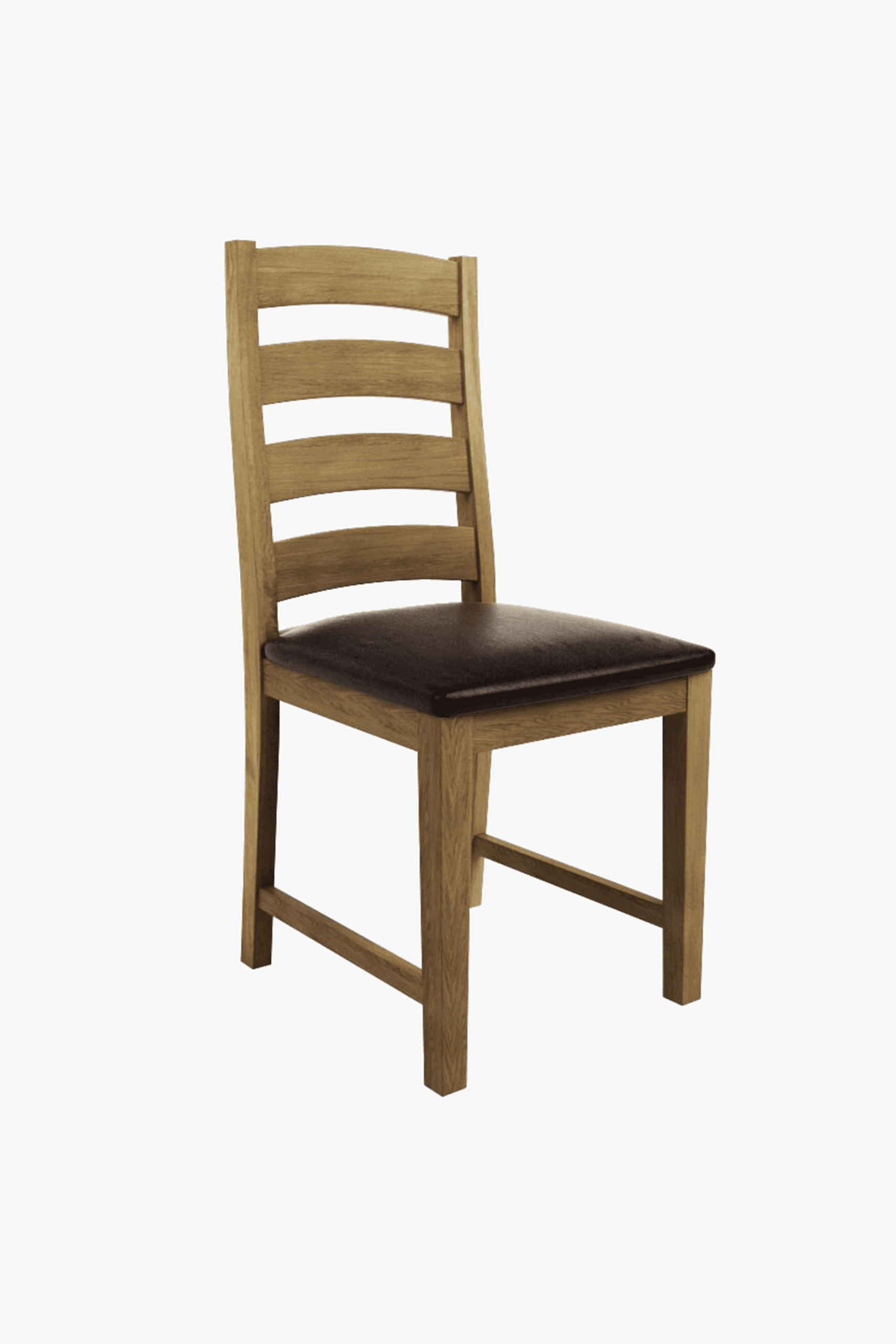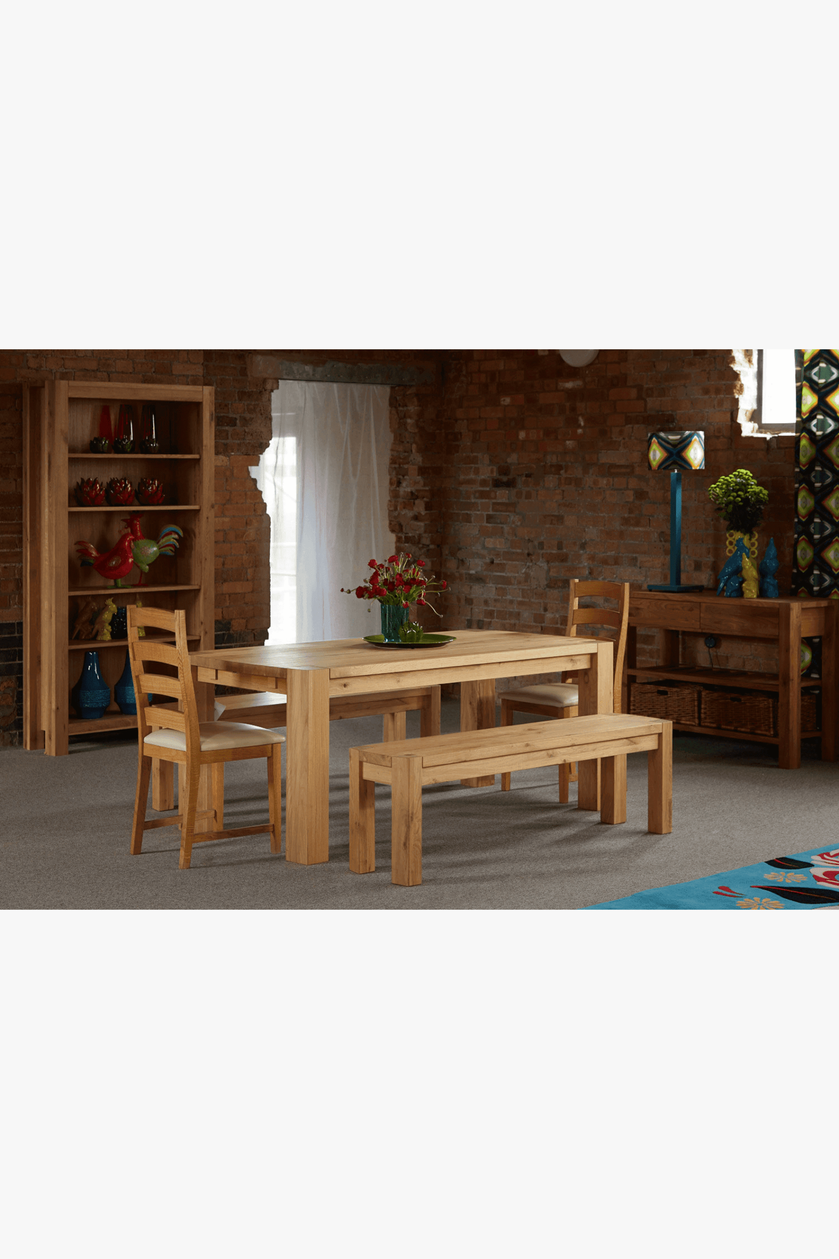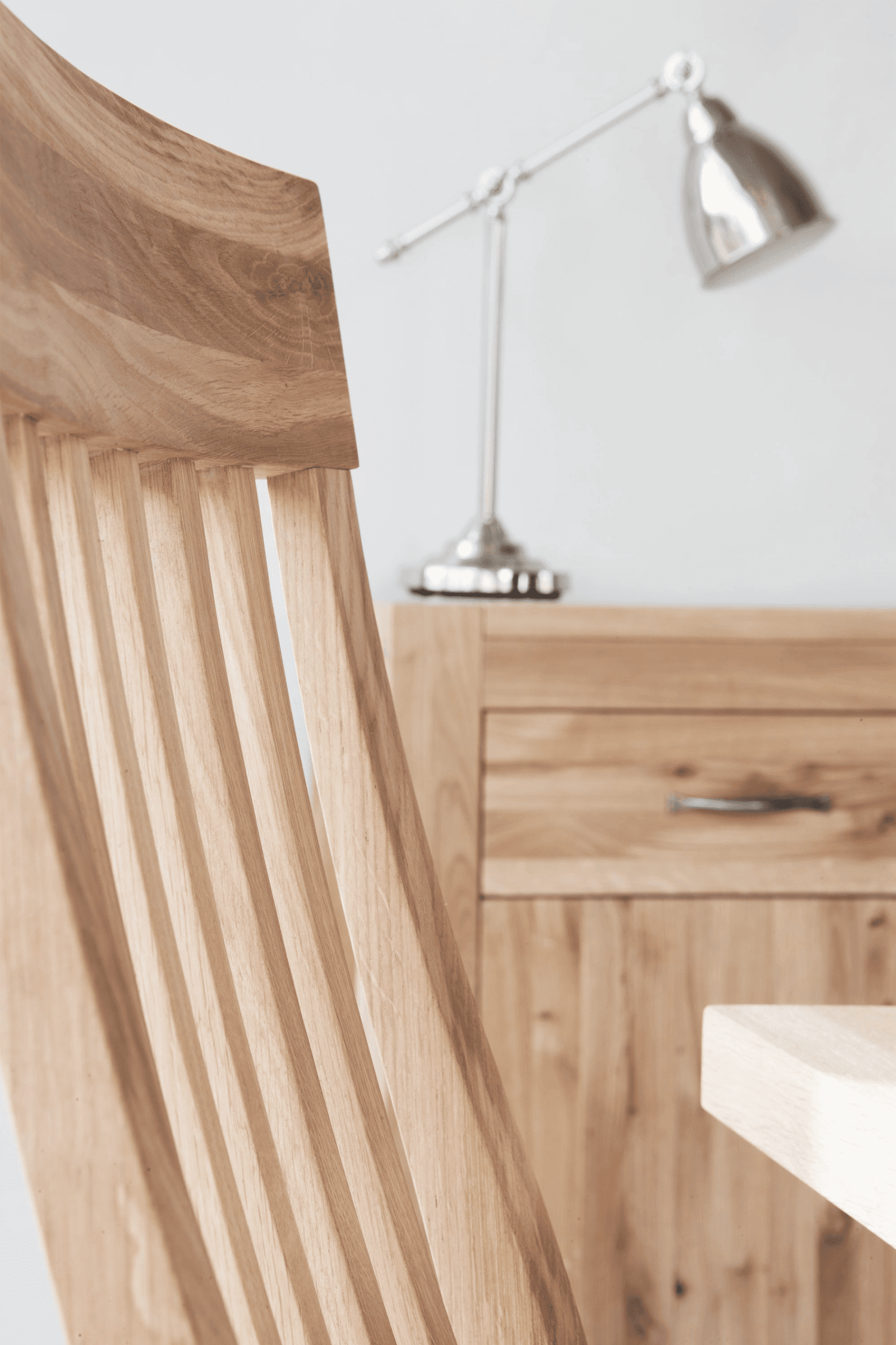 Made from the highest quality oak, the comprehensive Goliath range will appeal to those looking for contemporary styling that makes a bold statement. Chunky in design, whatever piece of furniture you choose from the Goliath range, it is sure to invite comment. All main visible surfaces are made from thick & completely solid oak and are meant to endure modern family life. The ends of all the surfaces feature an appealing curve rather than sharp corners, whilst all the drawers come in a choice of handles. The dining tables come with 2 optional extension leaves – a must for entertaining, or large families, while chair seats can be upholstered in a variety of leathers, fabrics or left in plain wood. The range comes finished in natural linseed oil, but can be ordered in a variety of stained colours and finished with lacquer or just bleached (natural light oil). Solid oak chair finished with linseed oil or a number of other finishes seen below. Goliath chair is available with an upholstered leather / fabric seat or a simple wooden seat. Available in A grade only.