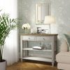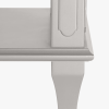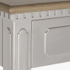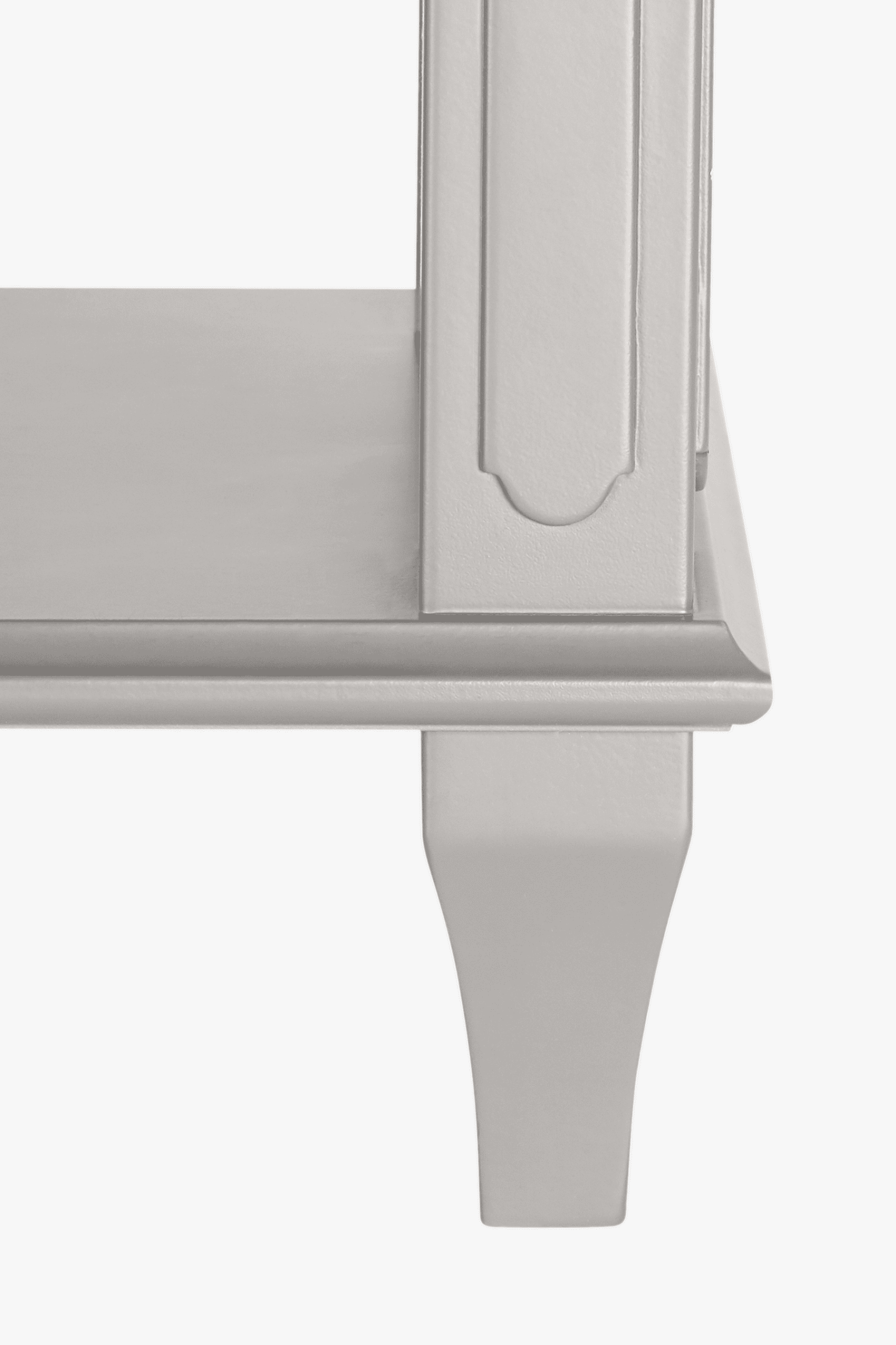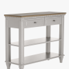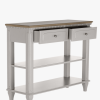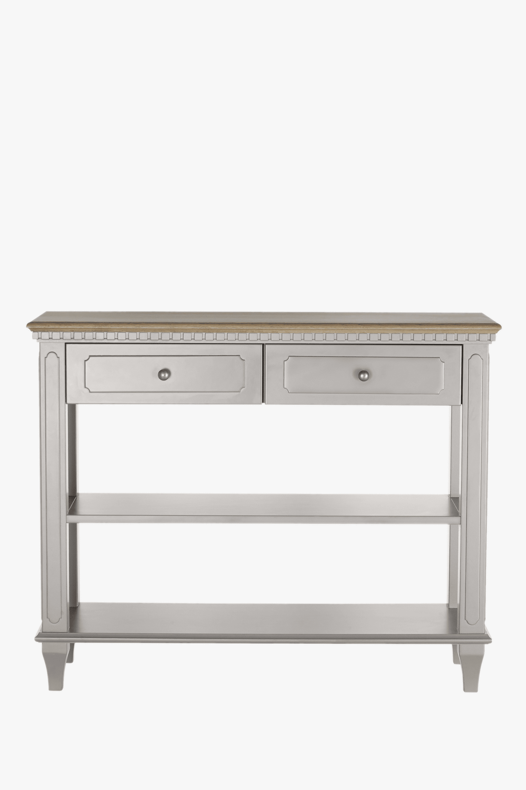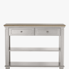 With a nod to neo-classical styling, the Laura Ashley Hanover 2 Drawer Console Table features a two drawers and two lower shelves offering ample storage space. It is crafted from oak and oak veneered modern materials and is spray painted and lacquered for a low maintenance finish. The top displays natural wood features, grain and colour variation and is further enhanced by a subtle grey patina giving it a gentle aged appearance. Pewter handles furnish each drawer but a second set of matt black handles are supplied if an alternate look is desired. Only the legs need to be attached to begin enjoying this piece; full assembly is not required.