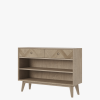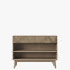 The Laura Ashley Hencroft 2 Drawer Console Table blends influence from mid-century style and contemporary weathered finishes to deliver a distinctive and modern design. A beautiful lattice marquetry design flows across the two adjacent drawers, gracefully accentuated with antiqued finger-pull handles. Additional storage comes in the form of two fixed shelves whilst the drawer runs traditionally on the carcase; all set within a chamfered frame resting upon classically mid-century legs, splayed at just the right angle. The solid bayur and mindi veneer is carefully stained a grey-brown tint, which brings out the characteristic high and low notes of the grain and mimics a weathered appearance before the finish protective lacquer is applied.
