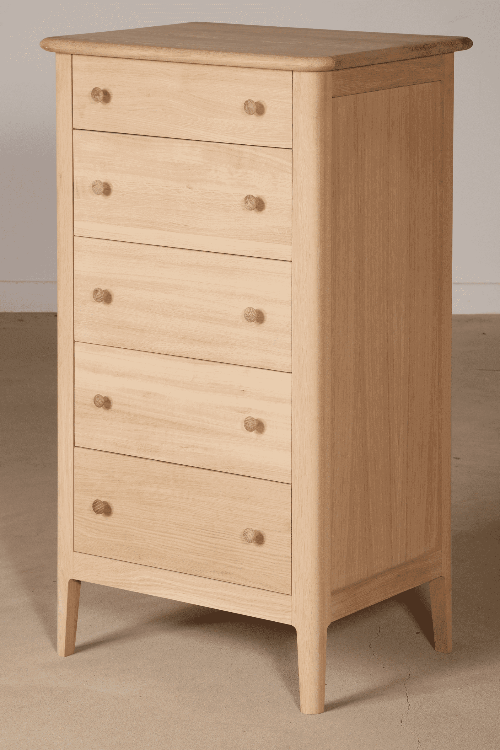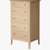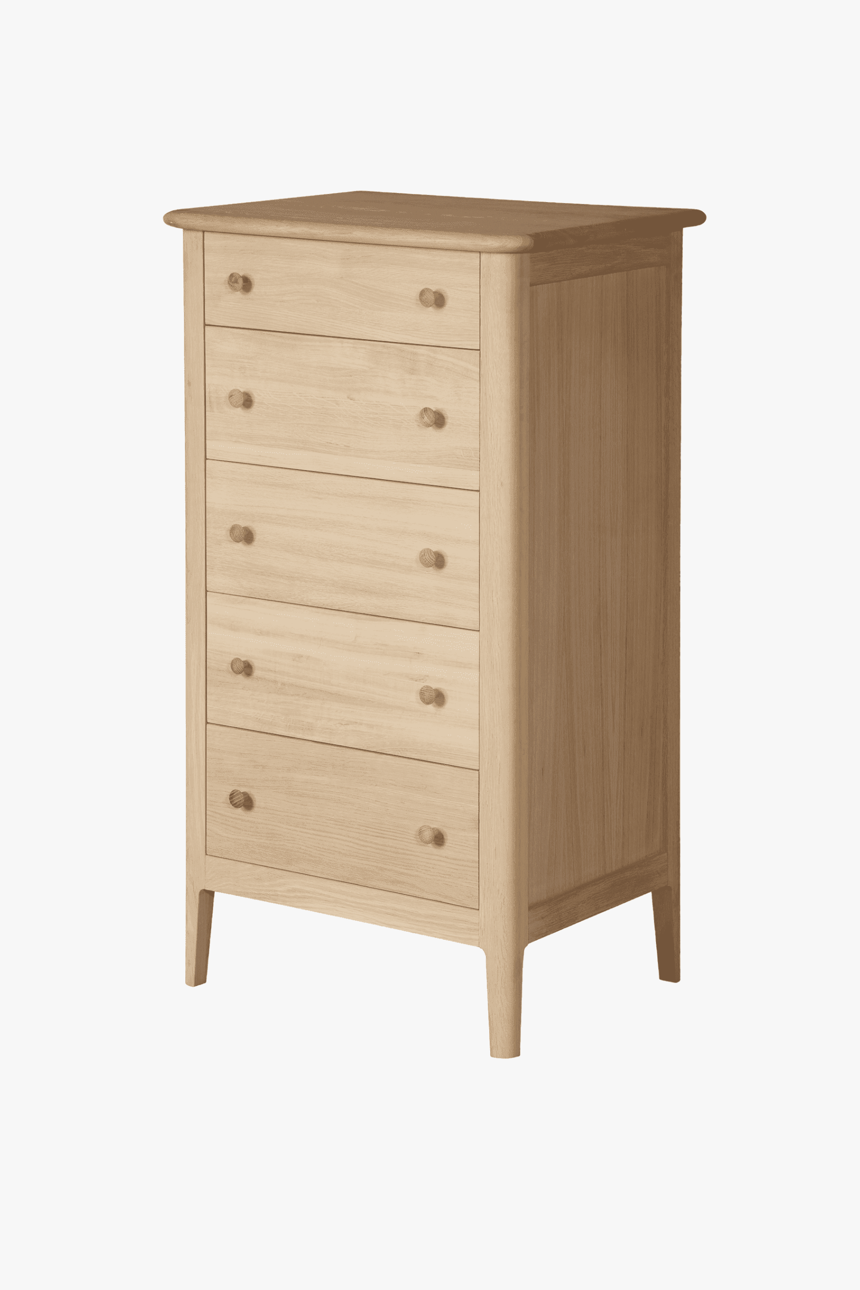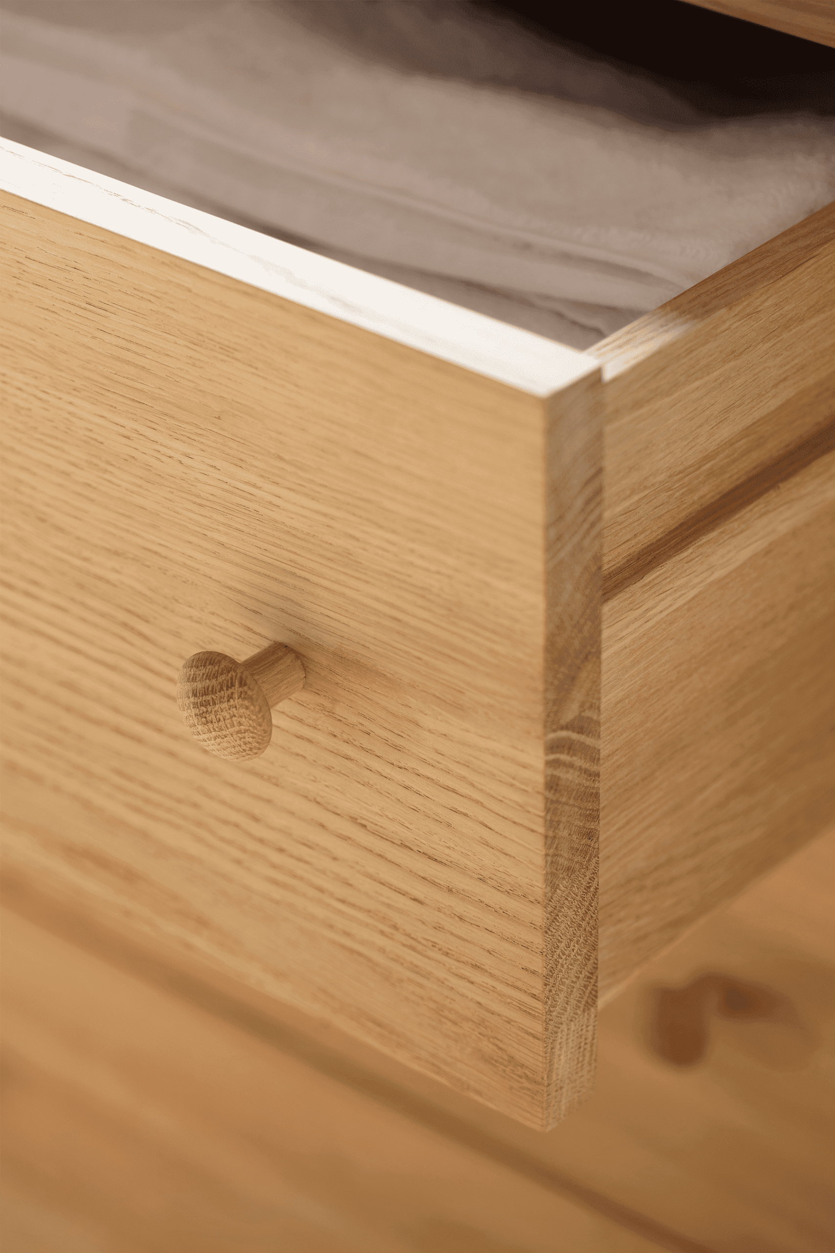 The Hudson collection by Qualita combines clean, lithe lines with a fresh shape and effortless curves, yet all the while hinting at the presence and strength within it’s core, formed from an abundance of solid, ‘A’ grade European oak. With a nod to the zenith of Scandinavian design, the soft radius of the tops follow through the framework, lending each piece a relaxed air, and a subtlety so often absent in a world where chunkiness is all too present. Gentle tapering of the legs allow the cabinets to sit gracefully from the ground, underlining this design’s modish look, and accentuating the refined profile. Featured here in ‘Soaped Oak’ – durable and easy to care for, this option retains the pure, smooth feel of natural wood, while providing a finish practical for today’s lifestyles. Light handles rest in perfect proportion on doors and drawers to compose a fluid aspect, and finishing an uncluttered, elegant style which fuses the beauty of natural oak with the essence of contemporary design, in a range to complement many of today’s interior schemes. Ideal for maximising storage in awkward room spaces, and adding interest and varied height through an interior scheme. Combination of standard size drawer and 4 deep drawers offers flexibility and interest to front profile. Solid oak and veneers throughout all construction. Tapered legs offer height and space lending a light look while still retaining generous storage options.