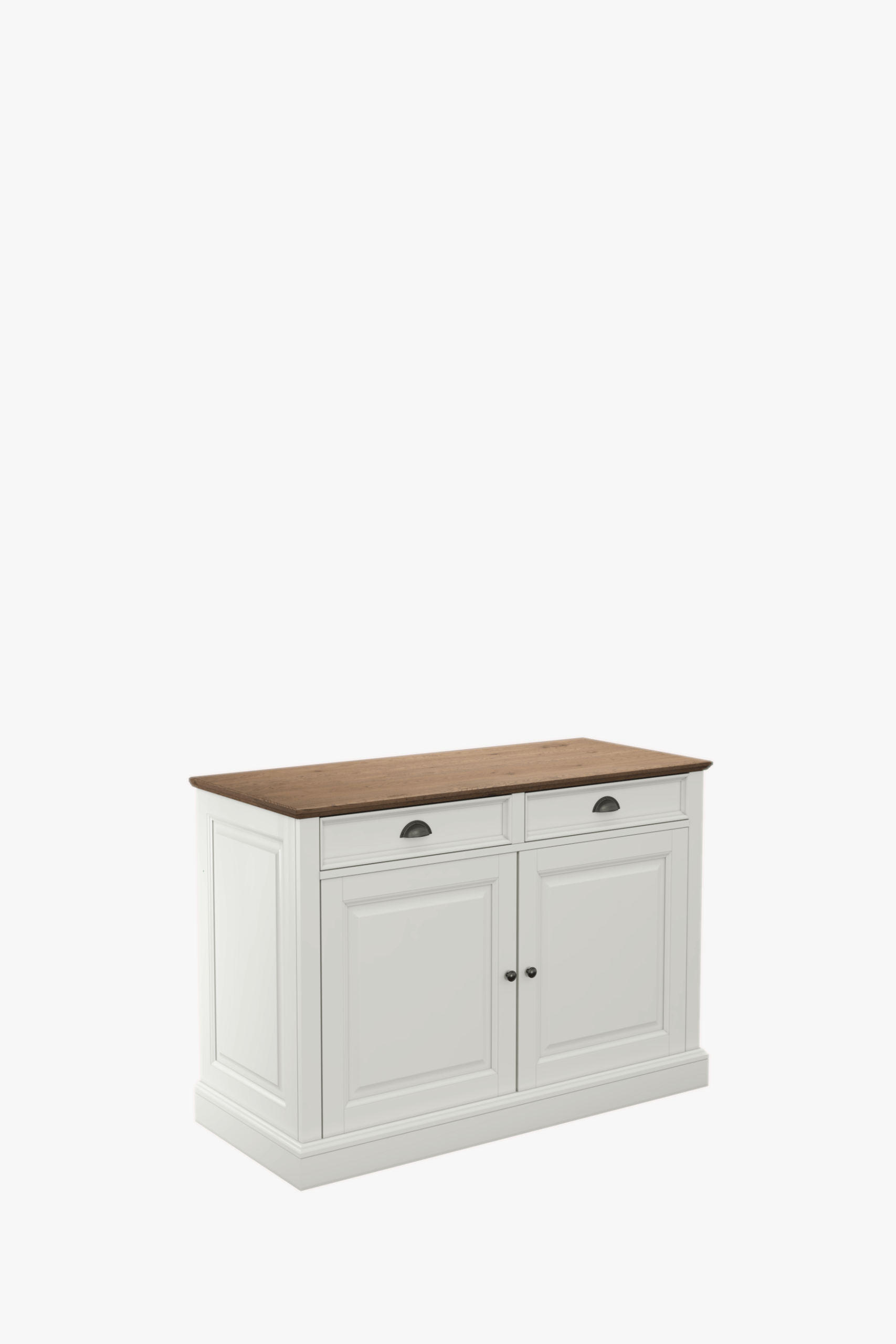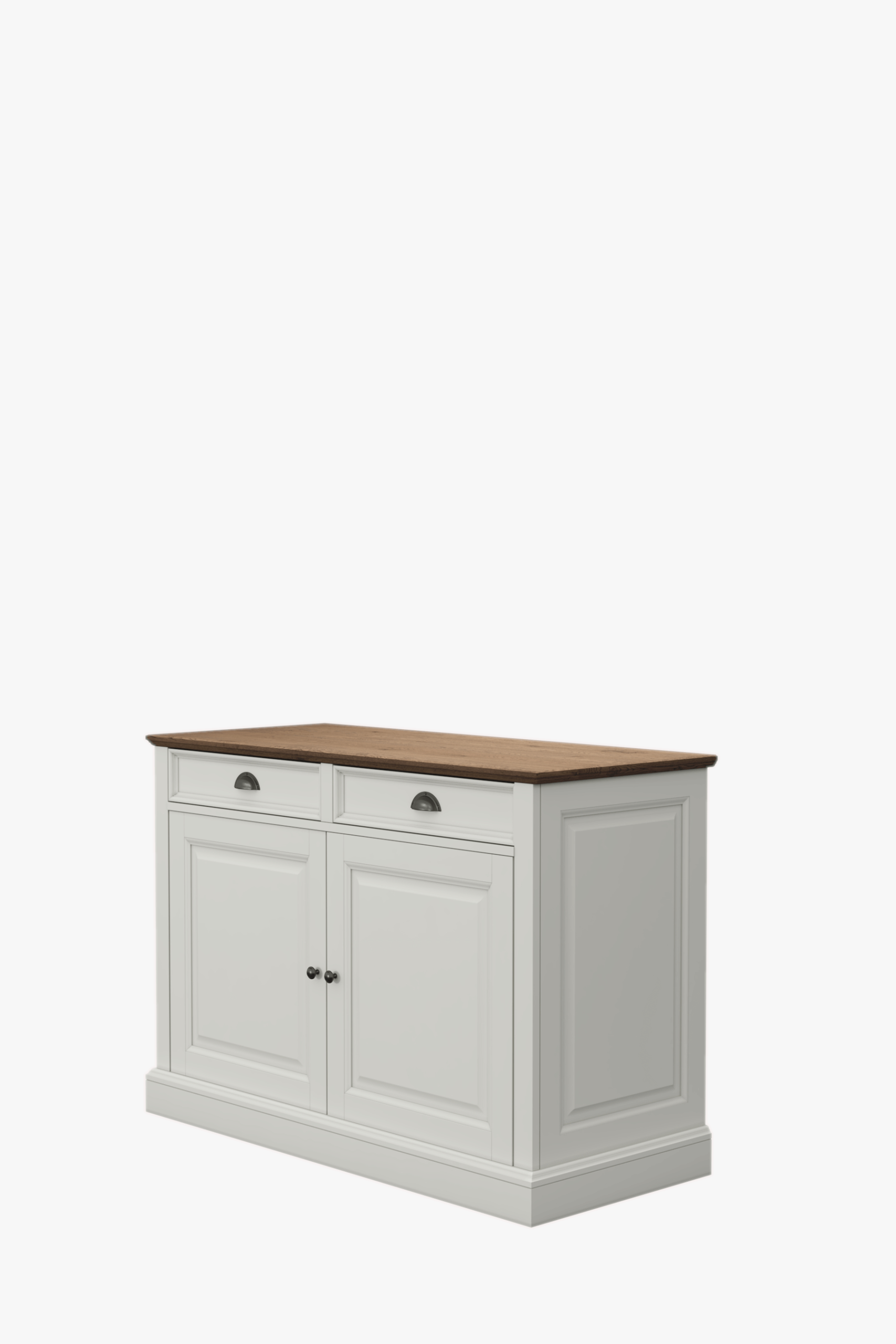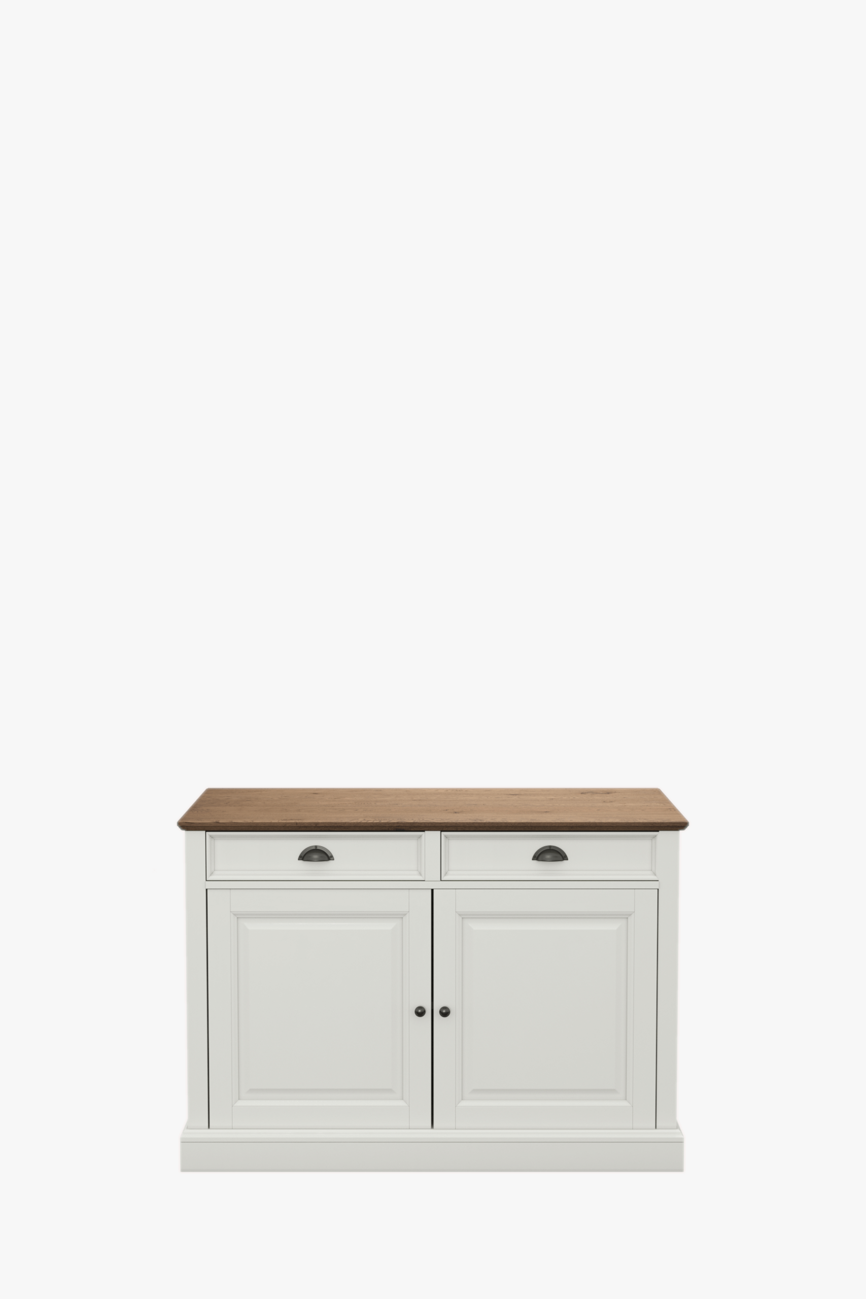 At first glance, the Laura Ashley Llanbister 2 Door 2 Drawer Sideboard appears to be a simple furniture piece with contrasting materials and colours. Actually, it comprises intricate detailing and premium materials. Each side panel and door is raised and fielded in a traditional style; the drawer fronts also feature pretty moulding details. Similarly, the top panels feature a detailed moulding profile in the solid oak edge and are beautifully finished with a grey tinted oil. An adjustable shelf is concealed behind each door which, like the drawers has a soft-close mechanism. Finally, each door and drawer is dressed with a pewter effect knob or cup handle.