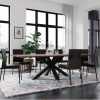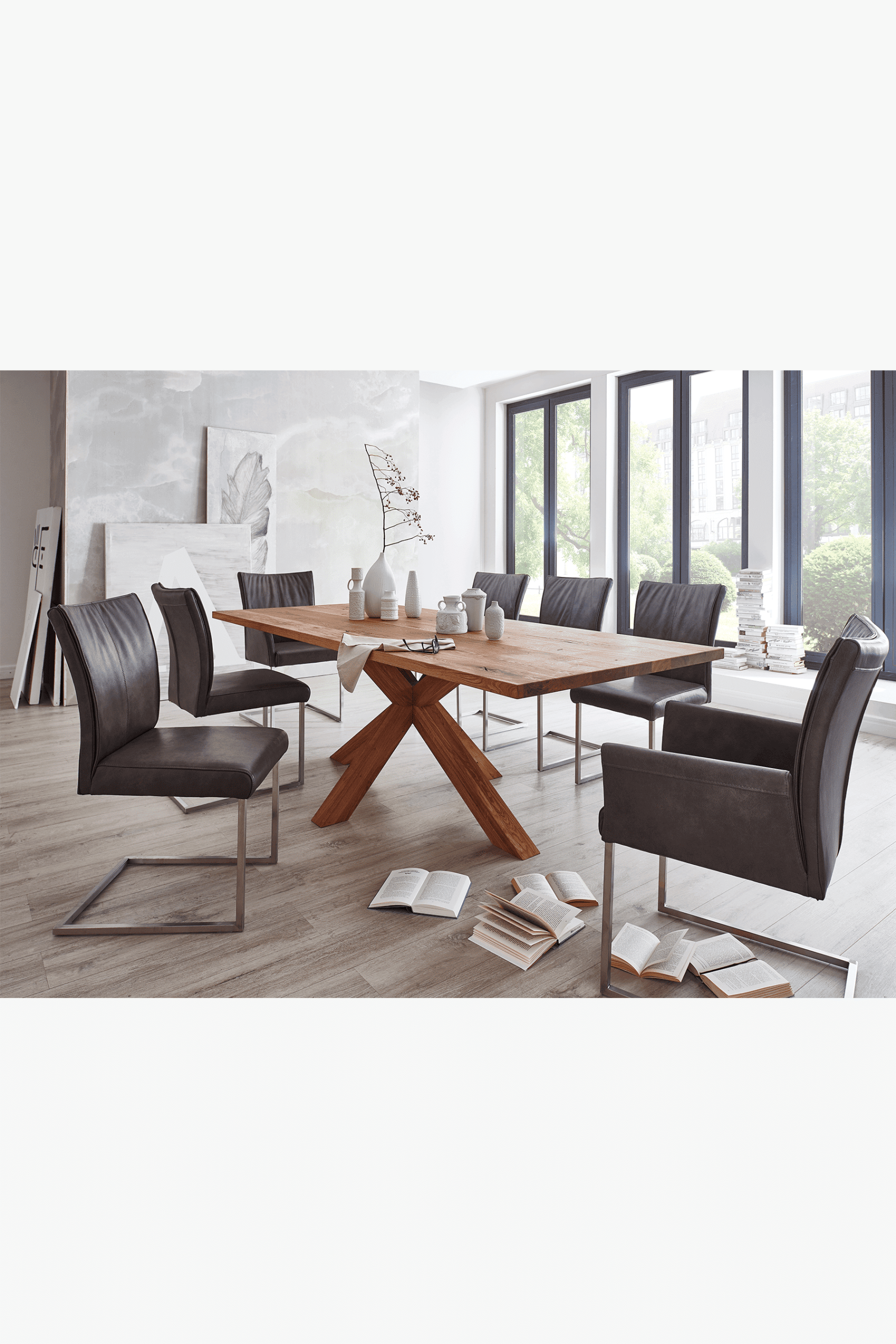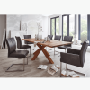 Table tops can be selected in either solid European oak or solid North American black walnut – with the option of straight or chamfered edges. Personal preferences can be even further tailored with contrasted fillers for the rustic tops, or simply with open knots and cracks to further accentuate the hallmarks of these characterful timbers. Cutting edge finishes in oiled and lacquered compositions help to offer durability and pleasing patina. Table leg available in wood or number of metal finishes.