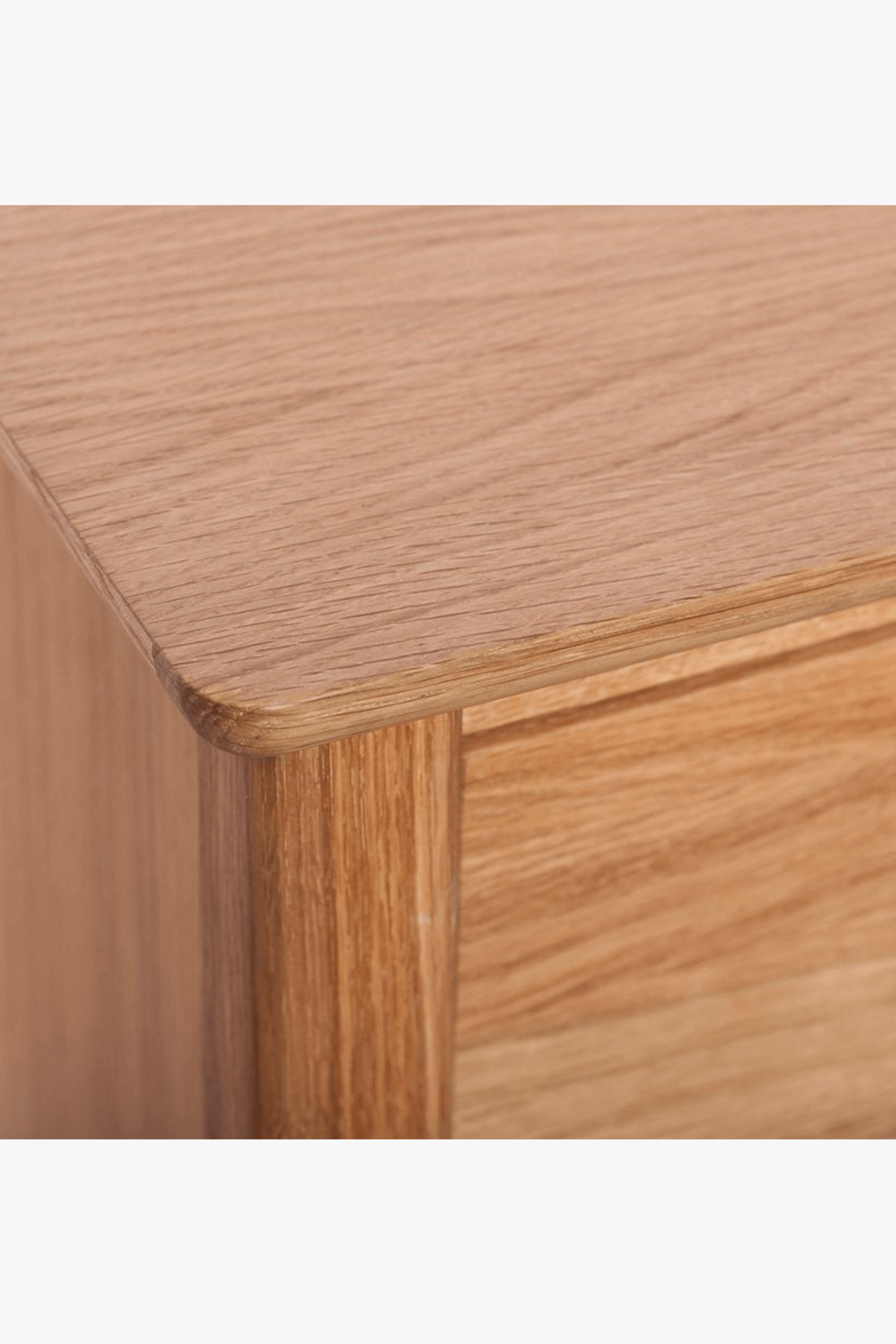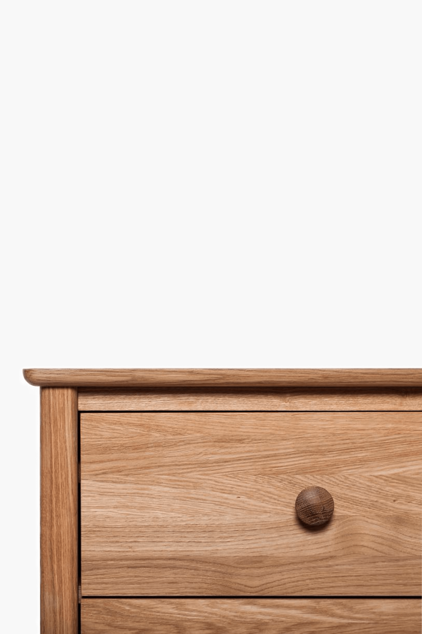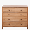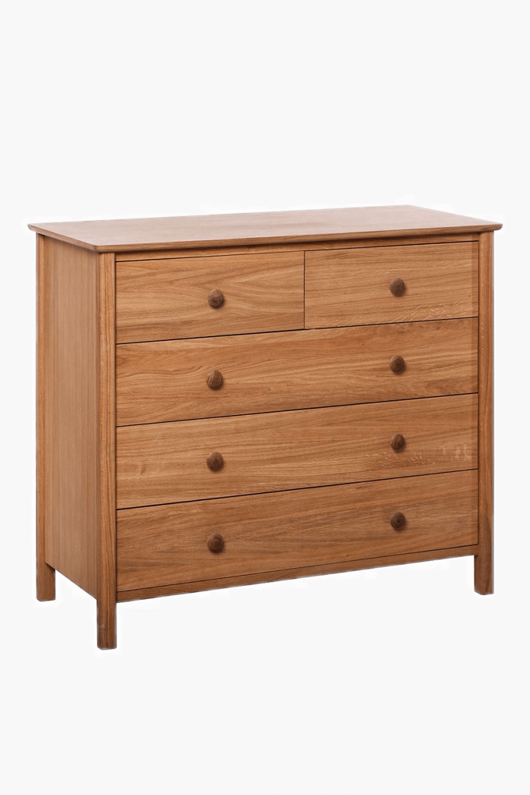 Our ‘Mid Century’ range offers home pieces that will suit a variety of interior environments. This chest of drawer’s light hue, oak veneers and natural wood imperfections add a touch of traditional charm, while the drawers feature round knobs and are spacious.