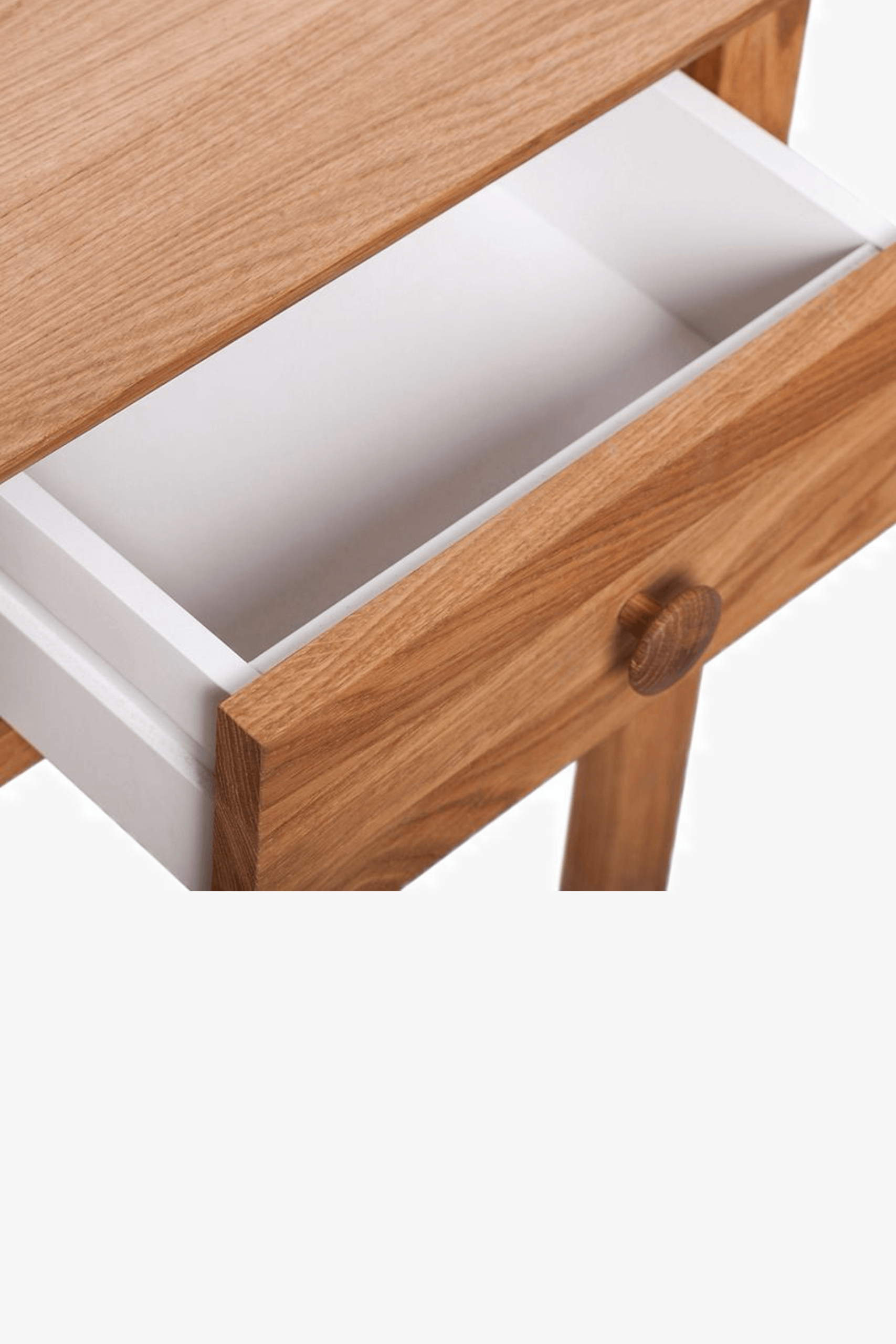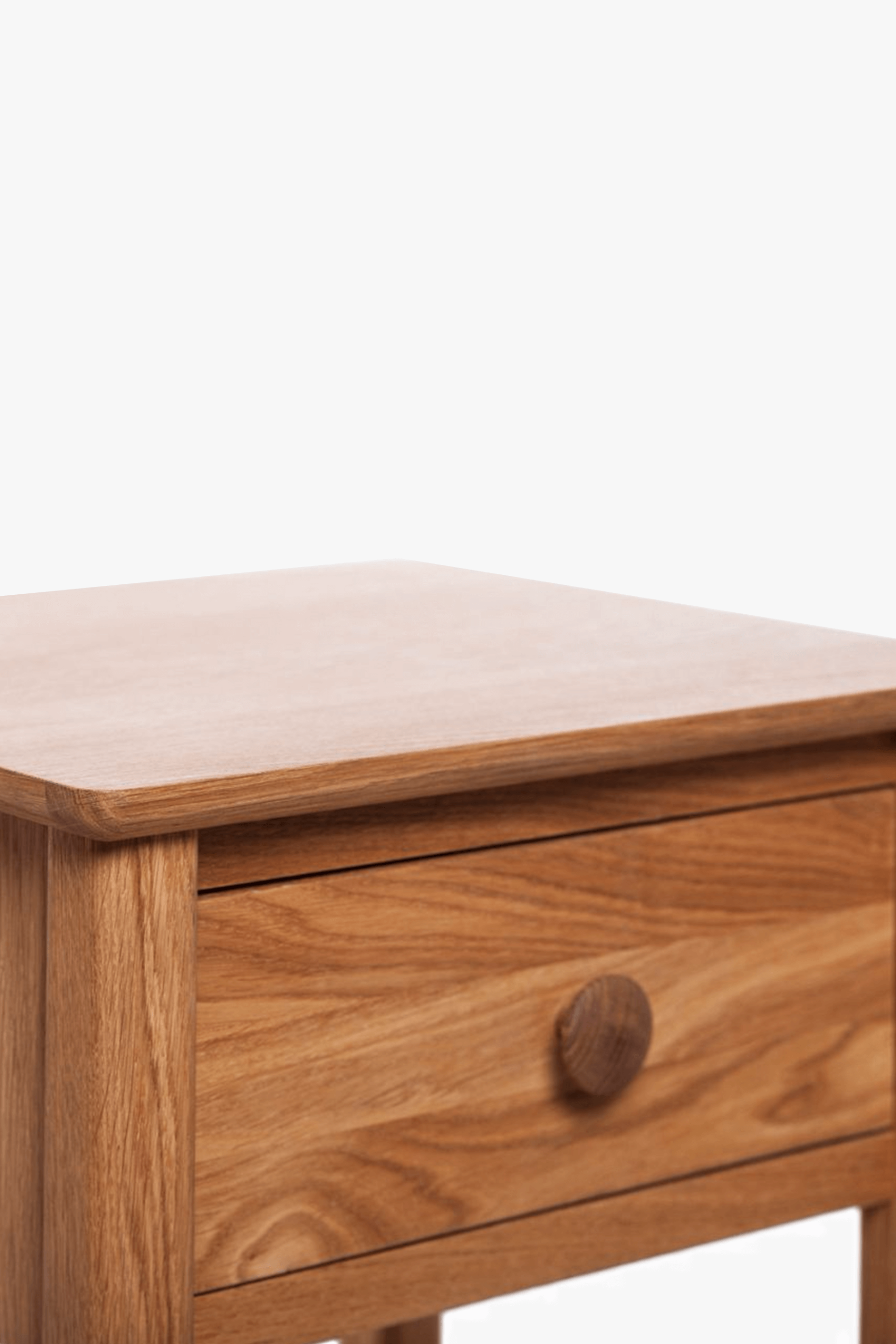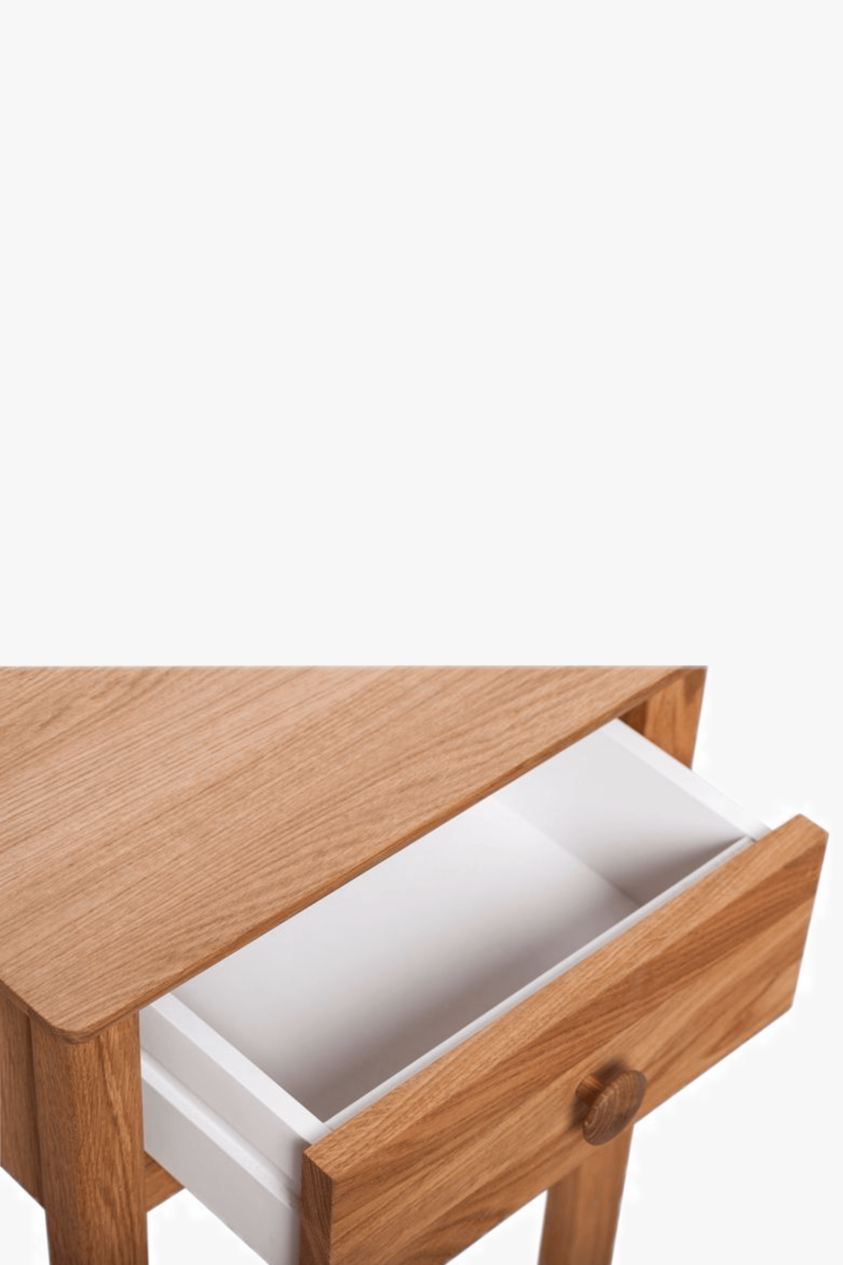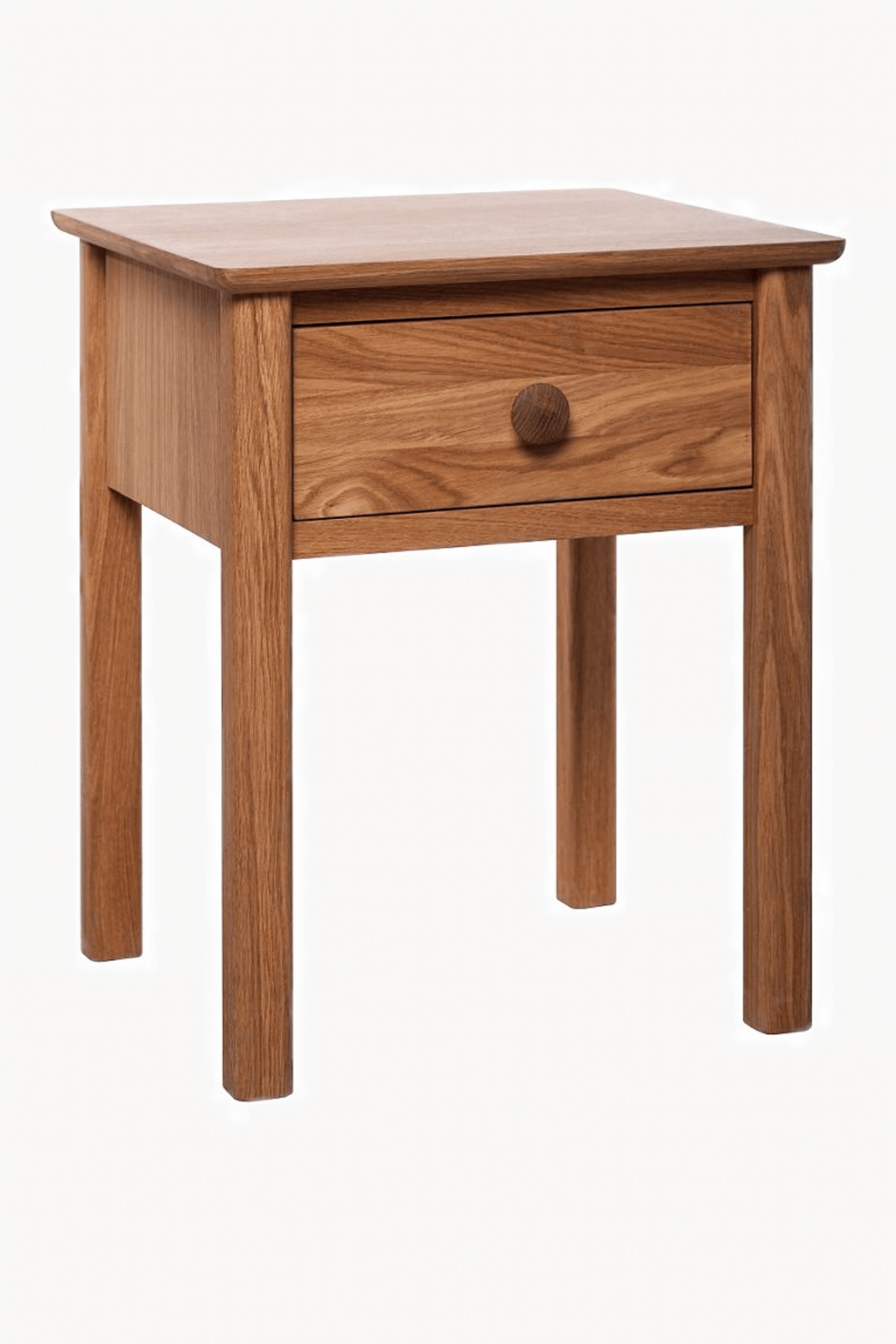Our ‘Mid Century’ range offers home pieces that will suit a variety of interior environments. This compact bedside cabinet’s light hue, oak veneers and natural wood imperfections add a touch of traditional charm, while the drawer features a round knob and is spacious.