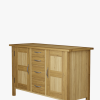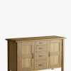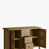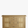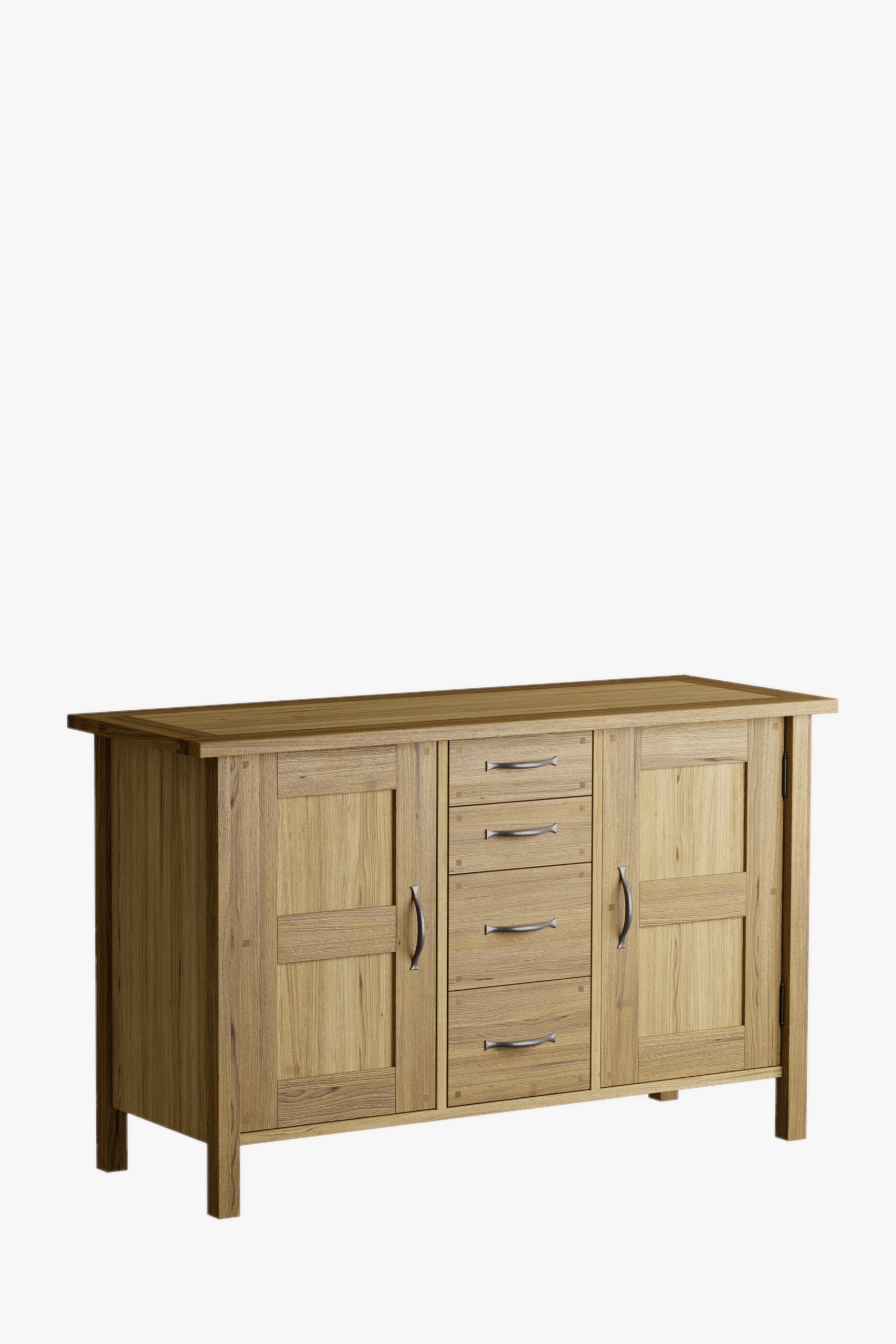 For more generously sized spaces in the Dining Room, the Laura Ashley Milton 2 Door 4 Drawer Sideboard features both cupboard and drawer storage. It has four smooth running drawers mounted on traditional wooden rails and two fielded panel doors behind which sits an adjustable shelf for convenience. It is crafted from a mix of solid oak and oak veneers and is finished with a quality oil resulting in a pure and timeless quality. Traditional craftsmanship and antiqued pewter effect handles complete the look of this versatile piece.