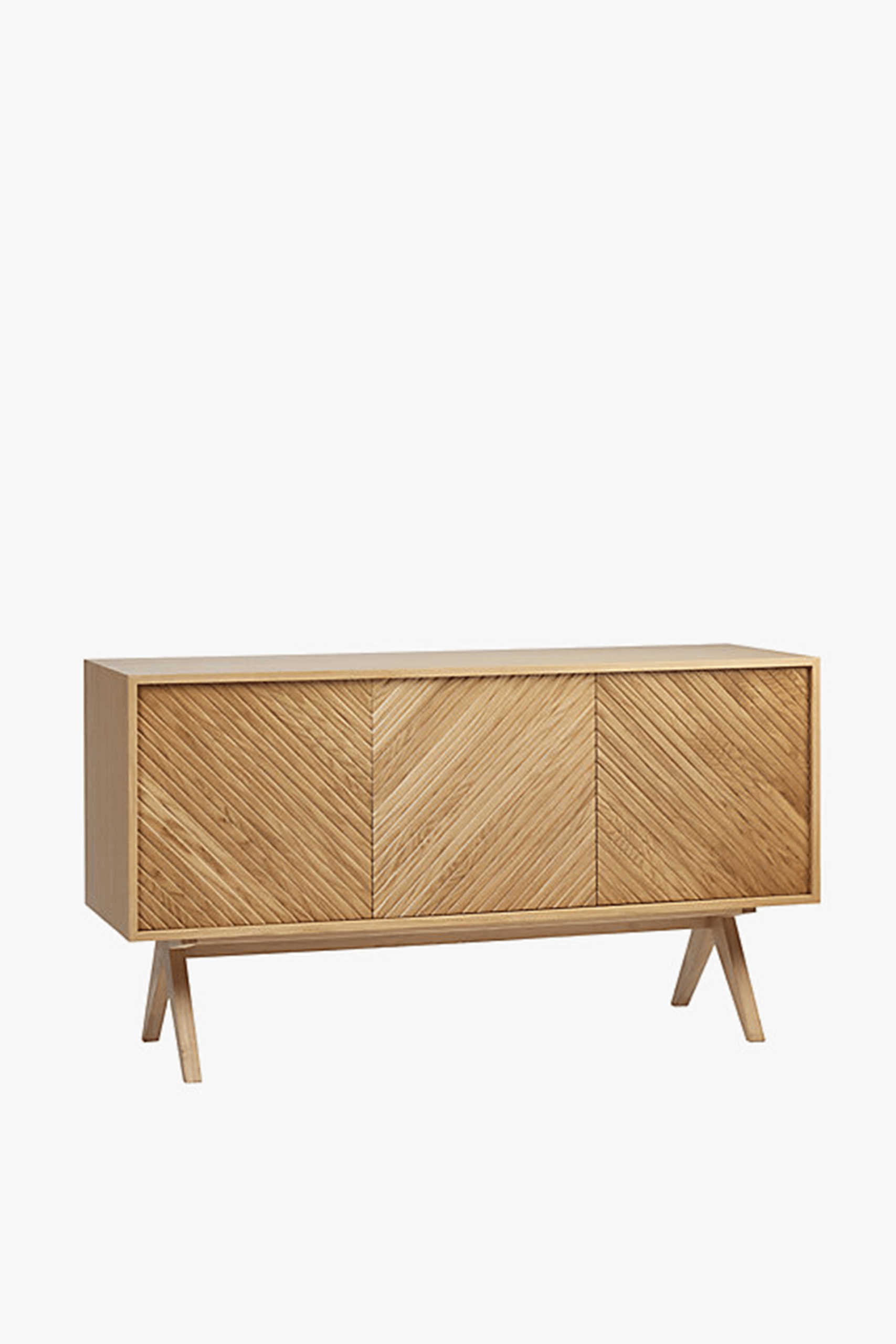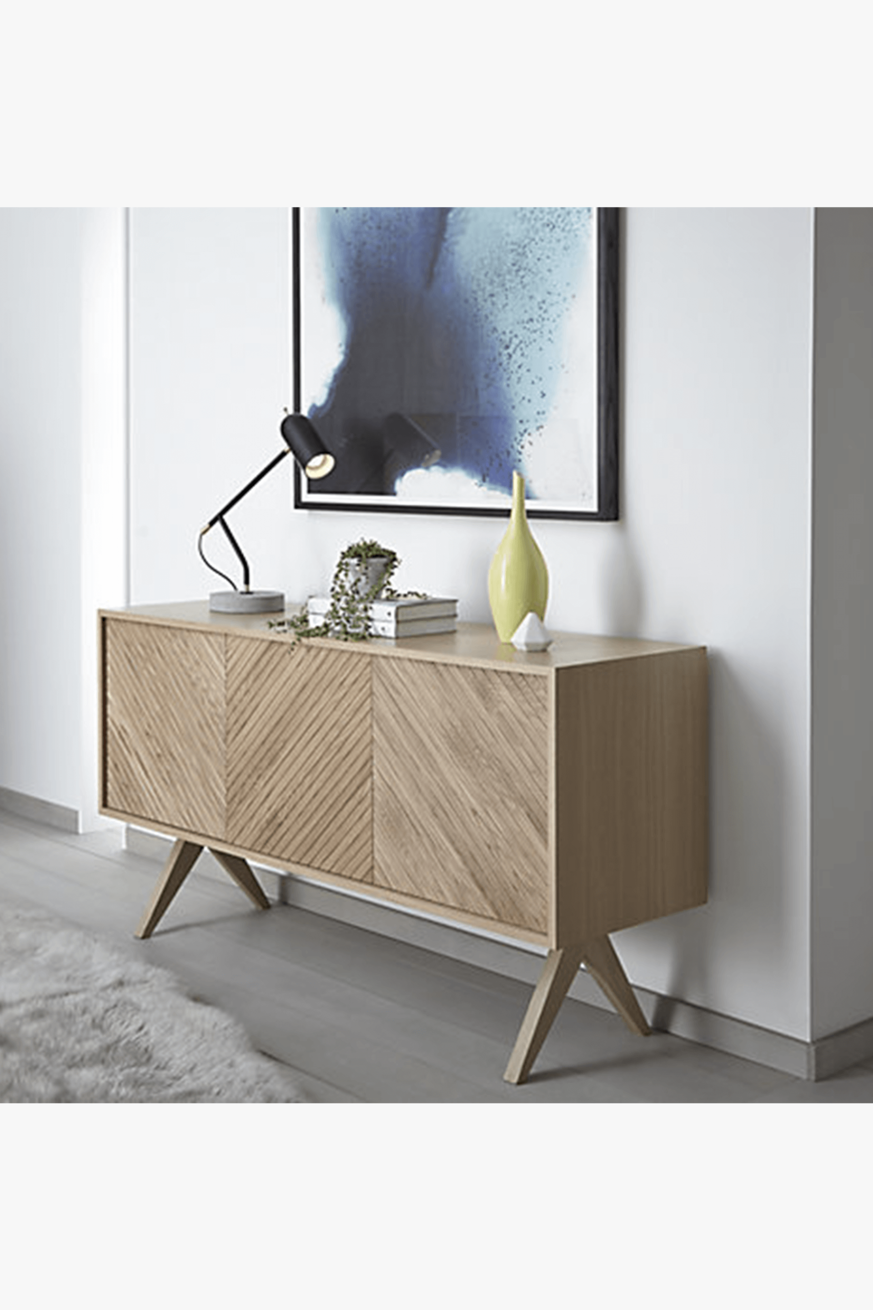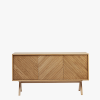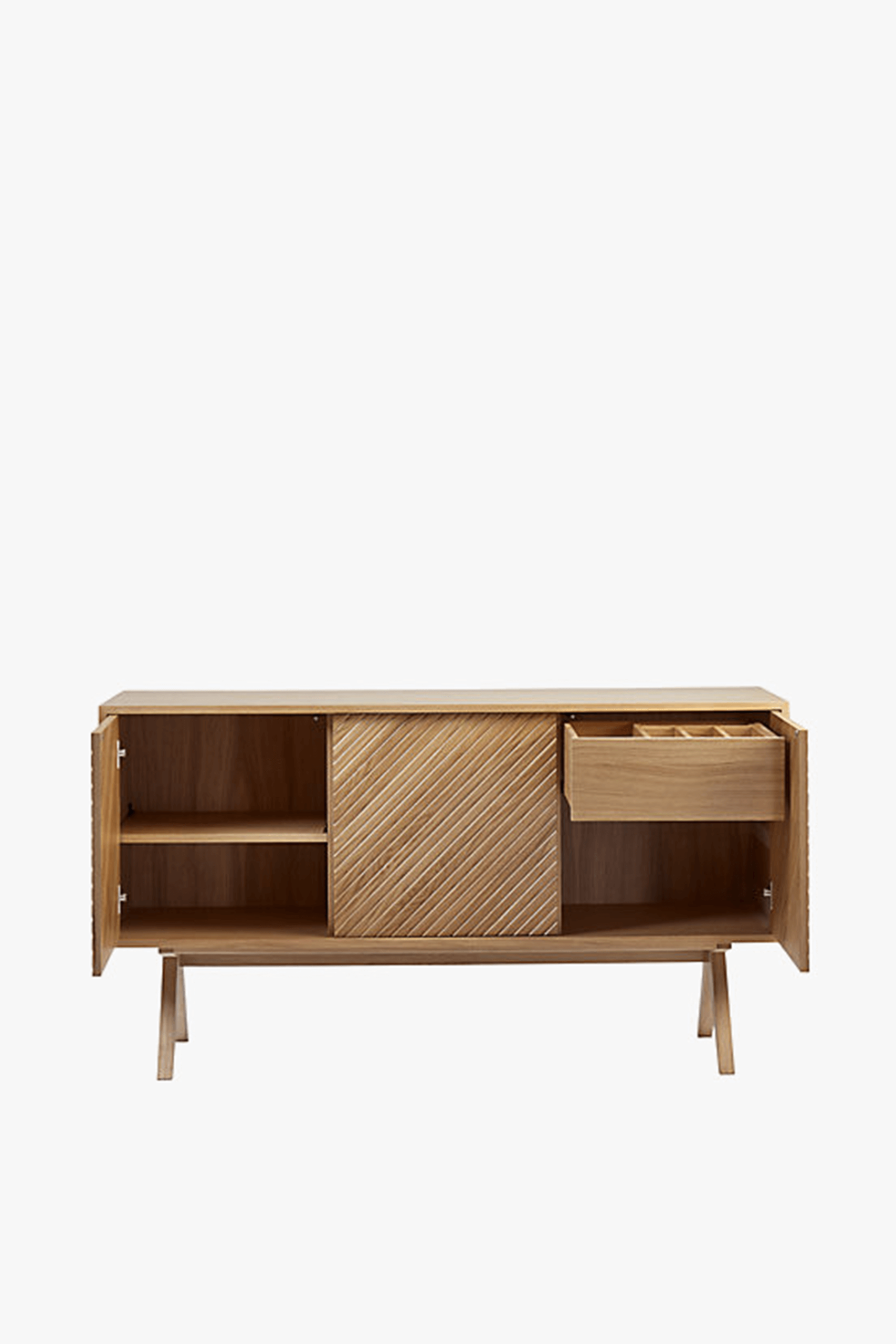 A range of contemporary dining room furniture made from solid and oak veneers with a natural lacquer. Designed exclusively for John Lewis by Bethan Gray. Bethan says, “The pared back simplicity of Newman, using high quality materials and highlighting craftsmanship, resonate particularly with how I love to design.” The design itself is associated with longevity and understated luxury. It is predominately made of solid oak with simple, clean lines and a pared back look. This beautifully crafted sideboard makes full use of the directional grain forming a unique diagonal pattern across the doors. A handy drawer is located in the right hand side of the sideboard, perfect for storing cutlery. 2 shelves are on hand for further storage options (one located behind the middle door). This striking piece would look the part in any modern setting.