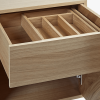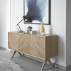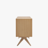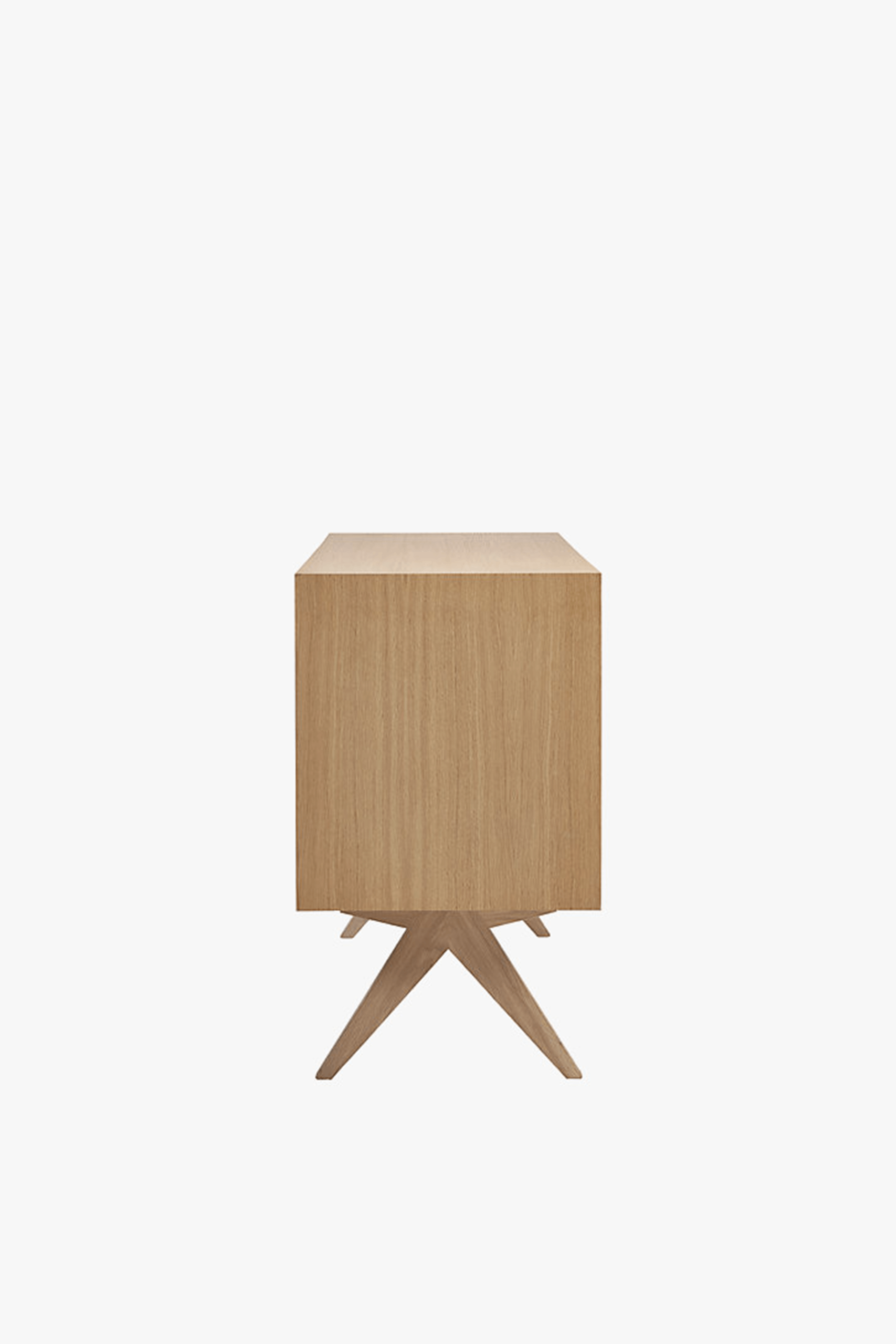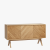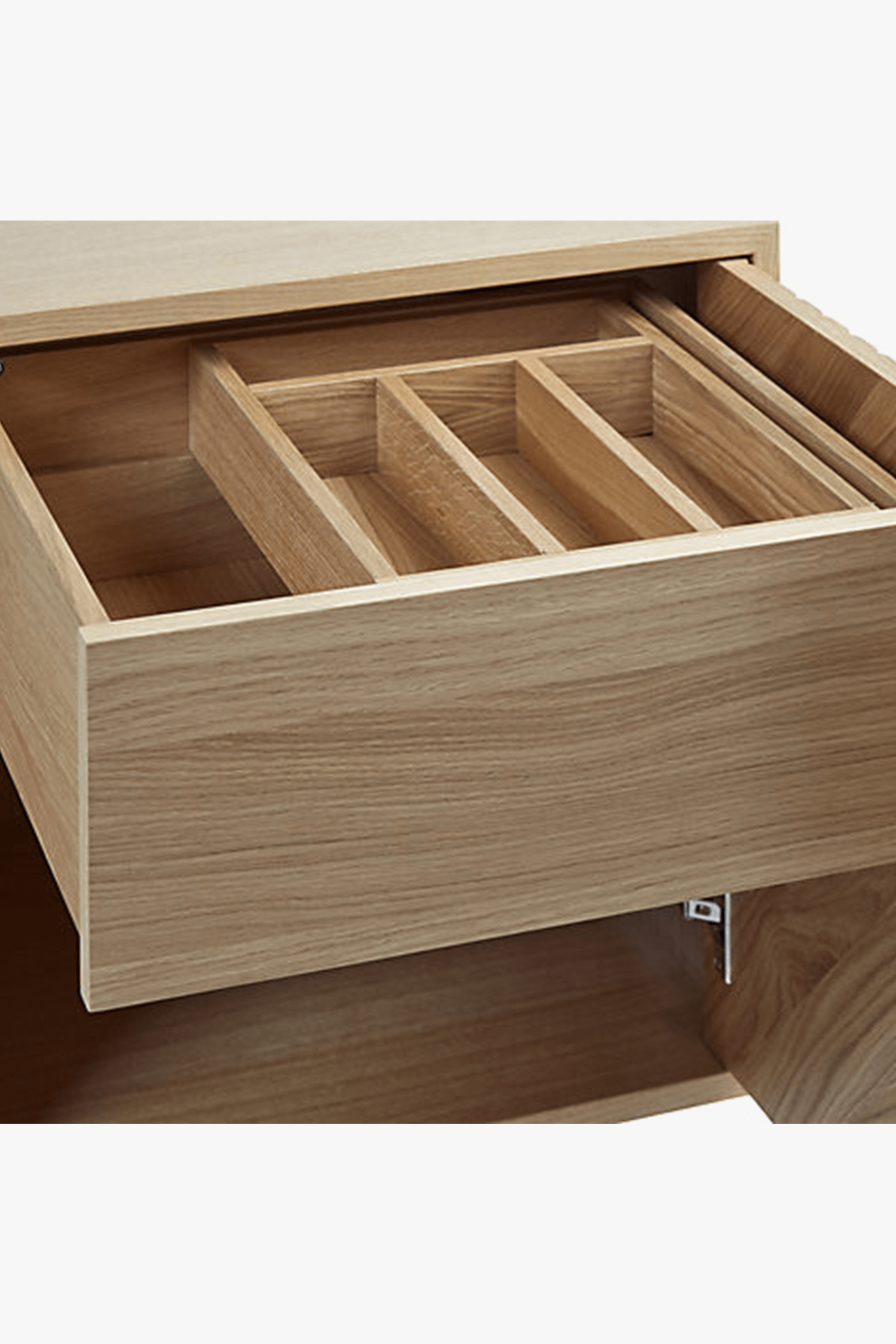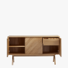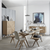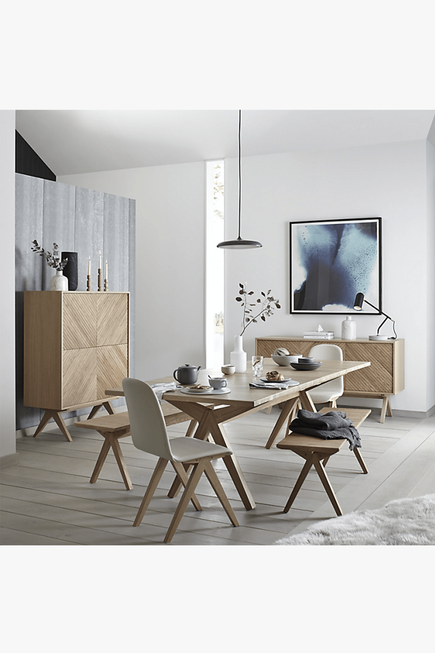 A range of contemporary dining room furniture made from solid and oak veneers with a natural lacquer. Designed exclusively for John Lewis by Bethan Gray. Bethan says, “The pared back simplicity of Newman, using high quality materials and highlighting craftsmanship, resonate particularly with how I love to design.” The design itself is associated with longevity and understated luxury. It is predominately made of solid oak with simple, clean lines and a pared back look. This beautifully crafted sideboard makes full use of the directional grain forming a unique diagonal pattern across the doors. A handy drawer is located in the right hand side of the sideboard, perfect for storing cutlery. 2 shelves are on hand for further storage options (one located behind the middle door). This striking piece would look the part in any modern setting.