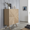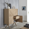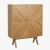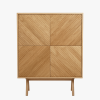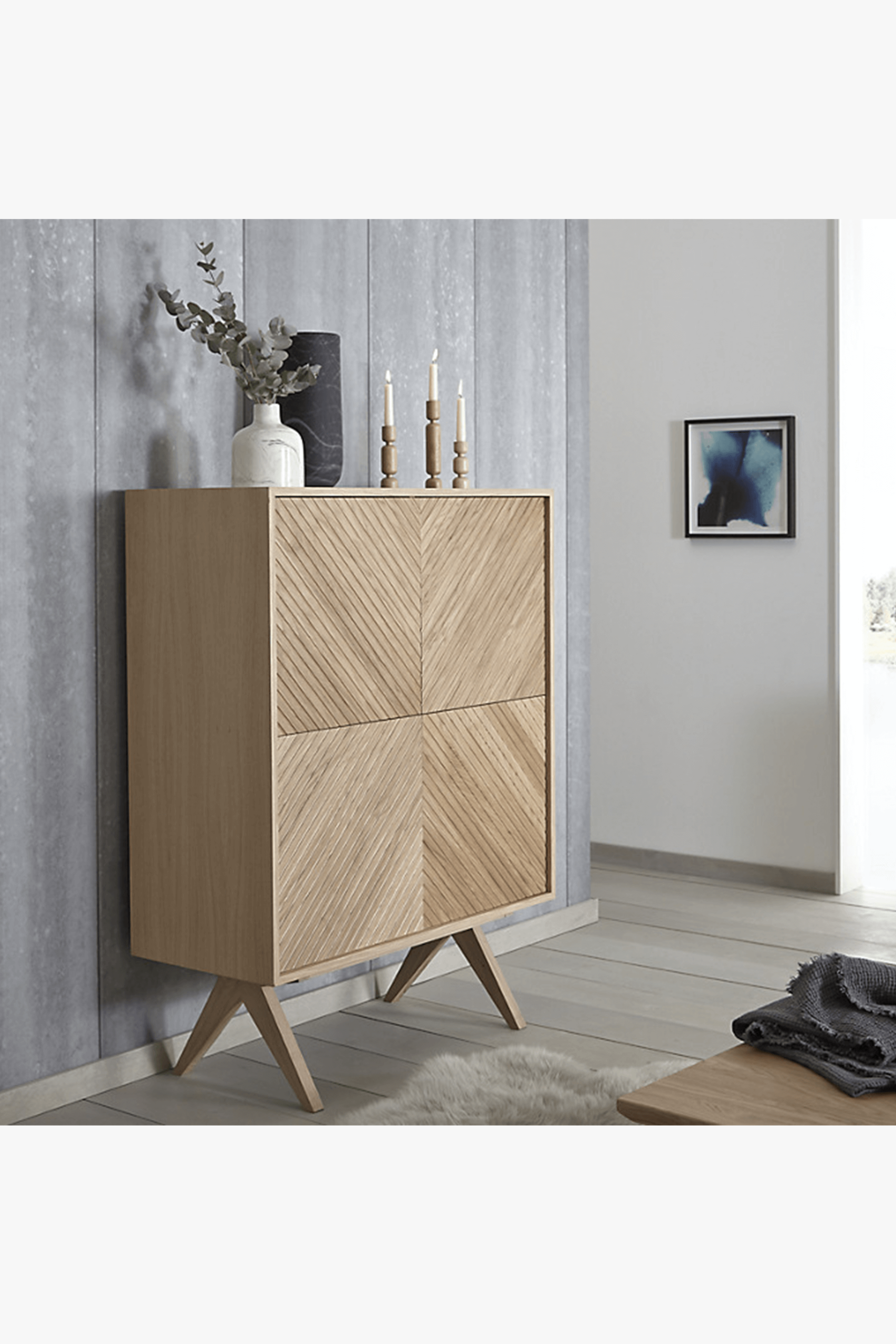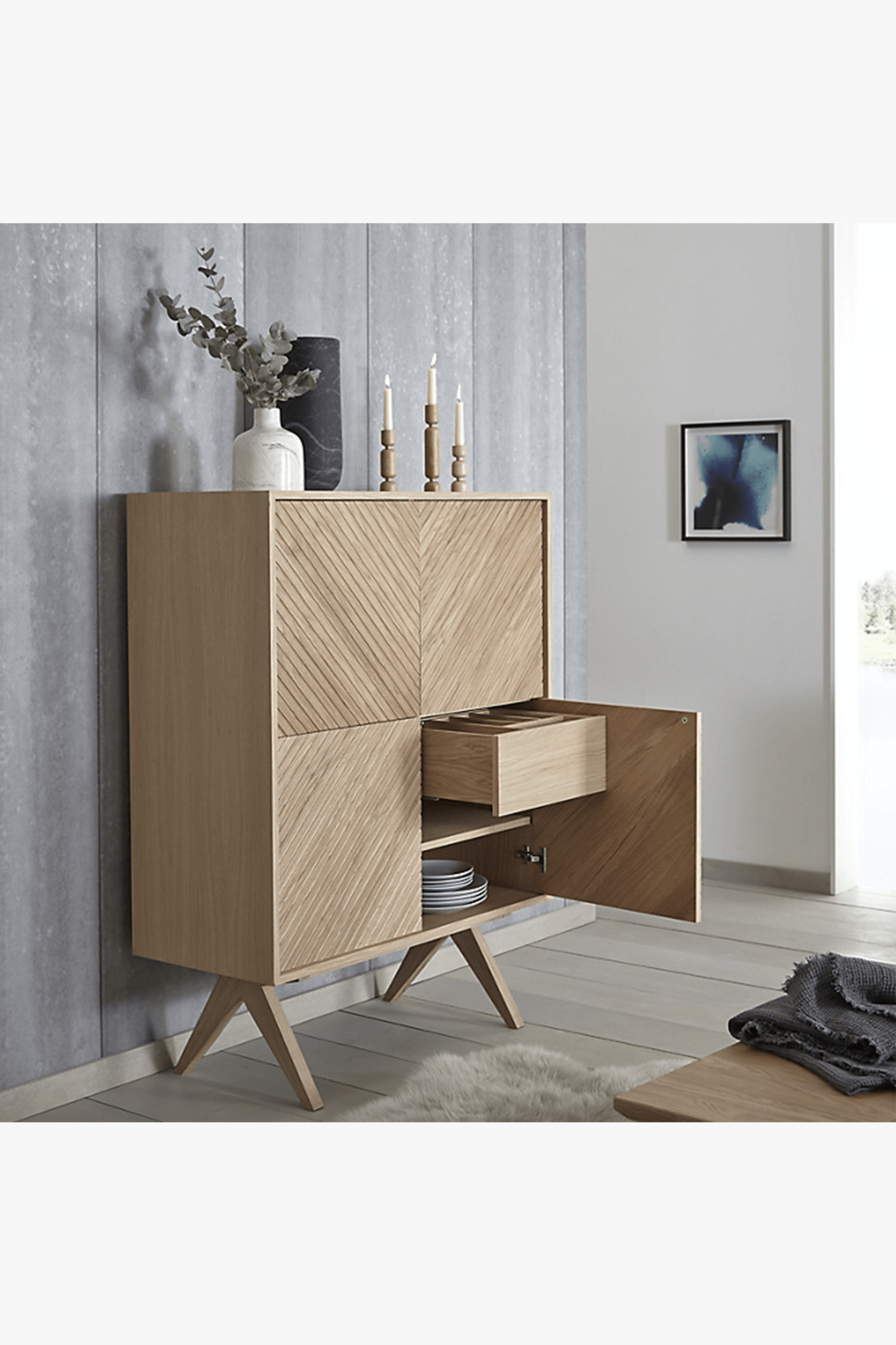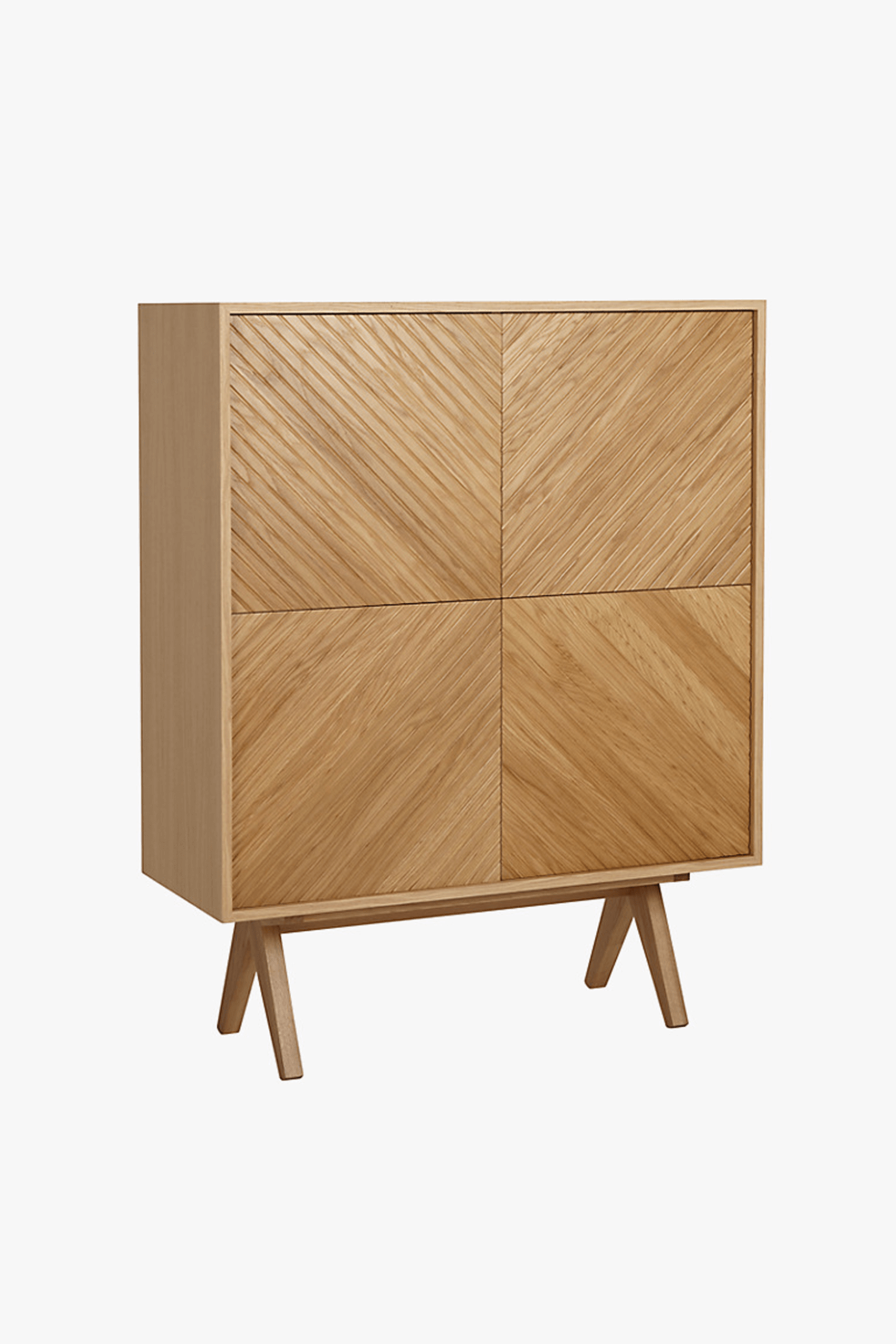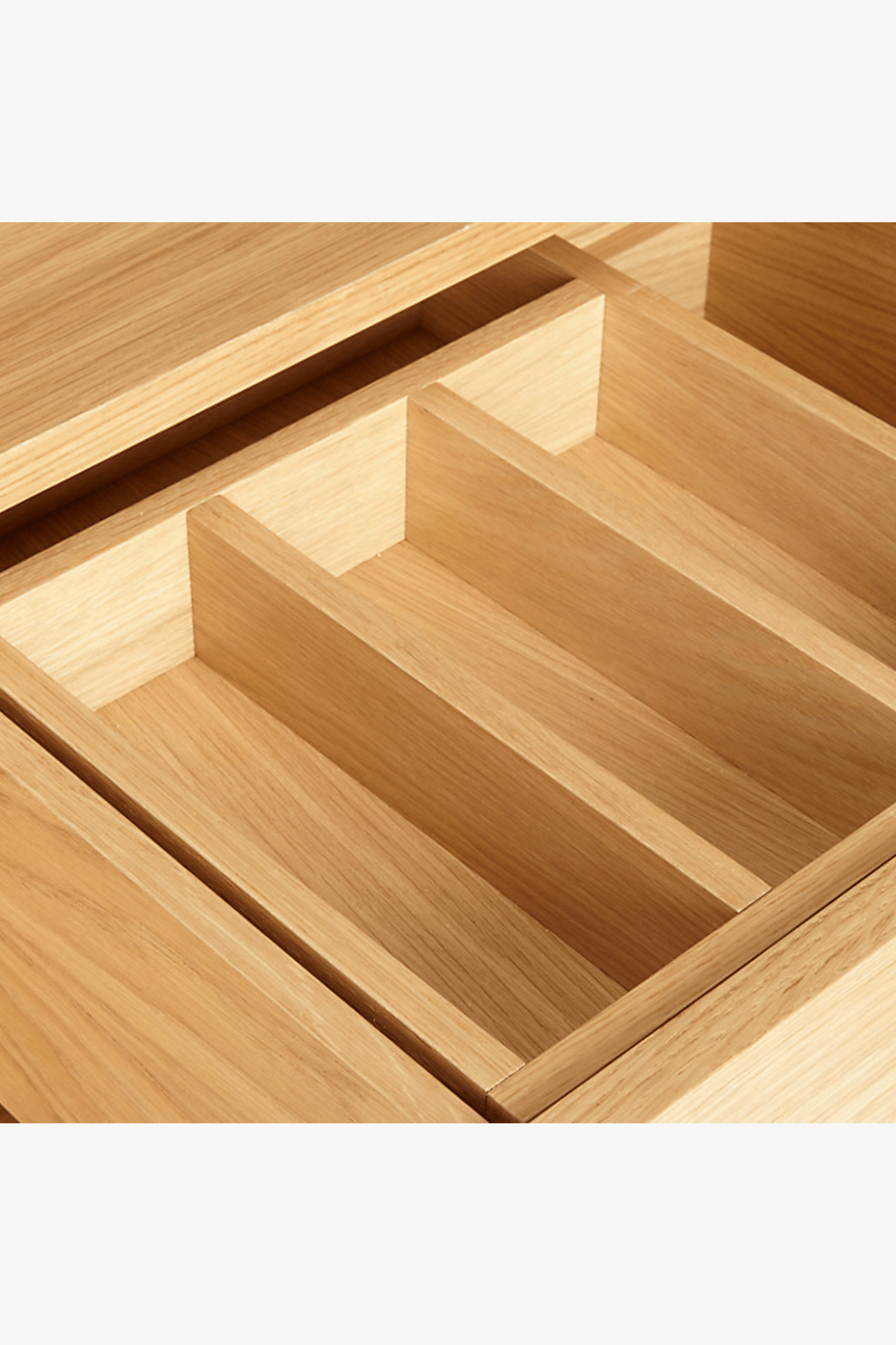 A range of contemporary dining room furniture made from solid and oak veneers with a natural lacquer. Designed exclusively for John Lewis by Bethan Gray. Bethan says, “The pared back simplicity of Newman, using high quality materials and highlighting craftsmanship, resonate particularly with how I love to design.” The design itself is associated with longevity and understated luxury. It is predominately made of solid oak with simple, clean lines and a pared back look. This beautifully crafted sideboard makes full use of the directional grain forming a unique diagonal pattern across the doors. A handy drawer is located in the top right of the sideboard, perfect for storing cutlery. 6 shelves are on hand for further storage options. The doors are push to open for a clean finish. This striking piece would look the part in any modern setting.