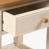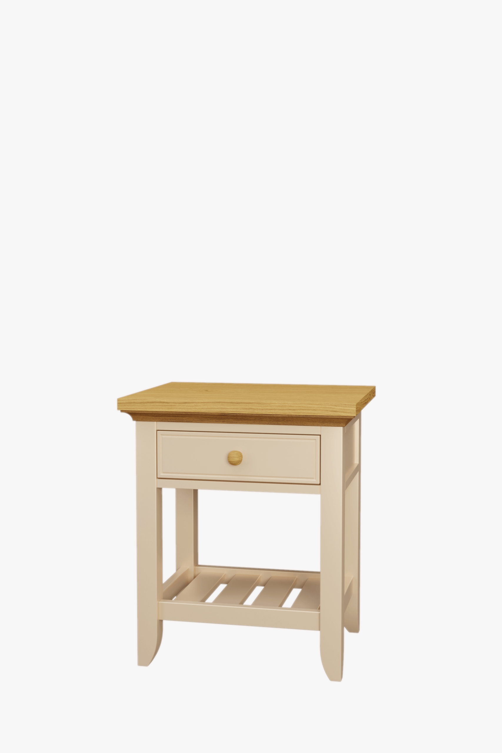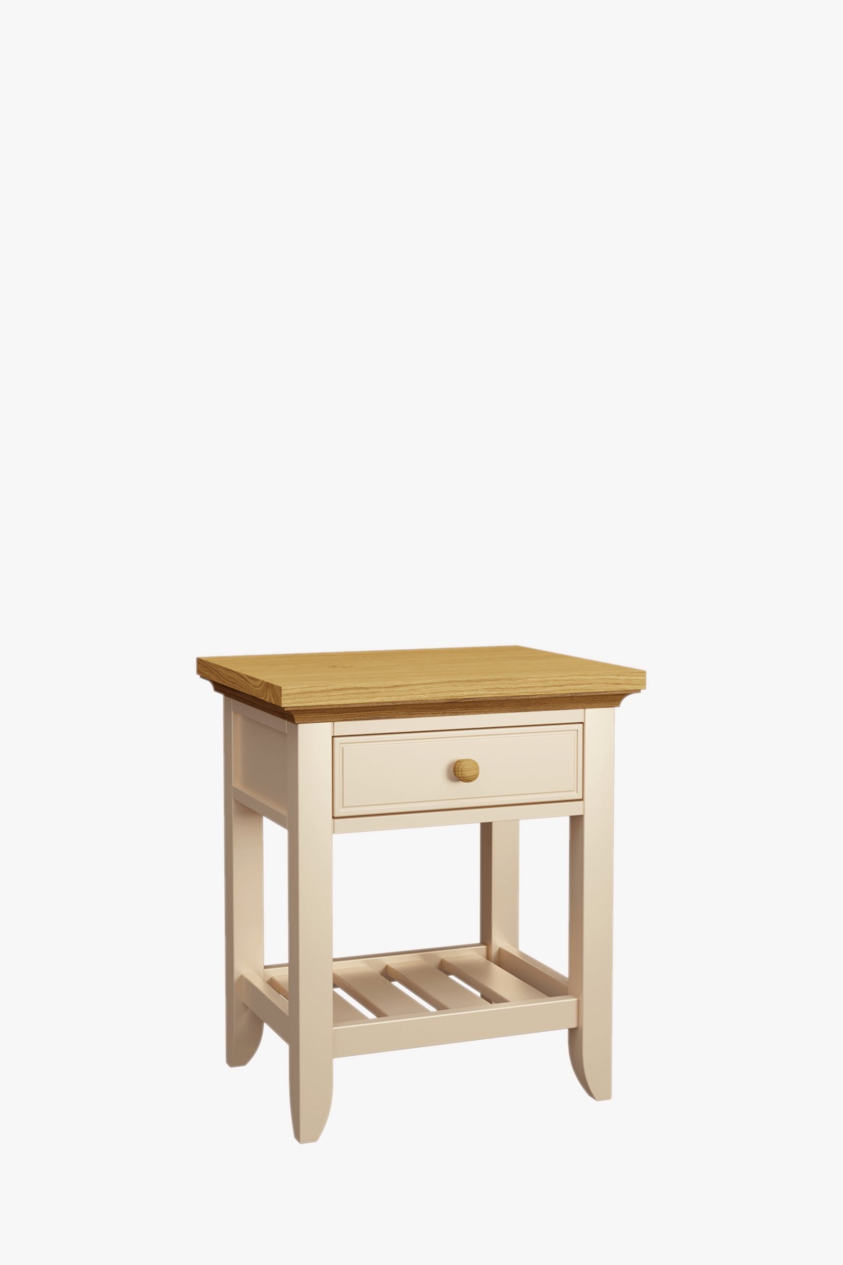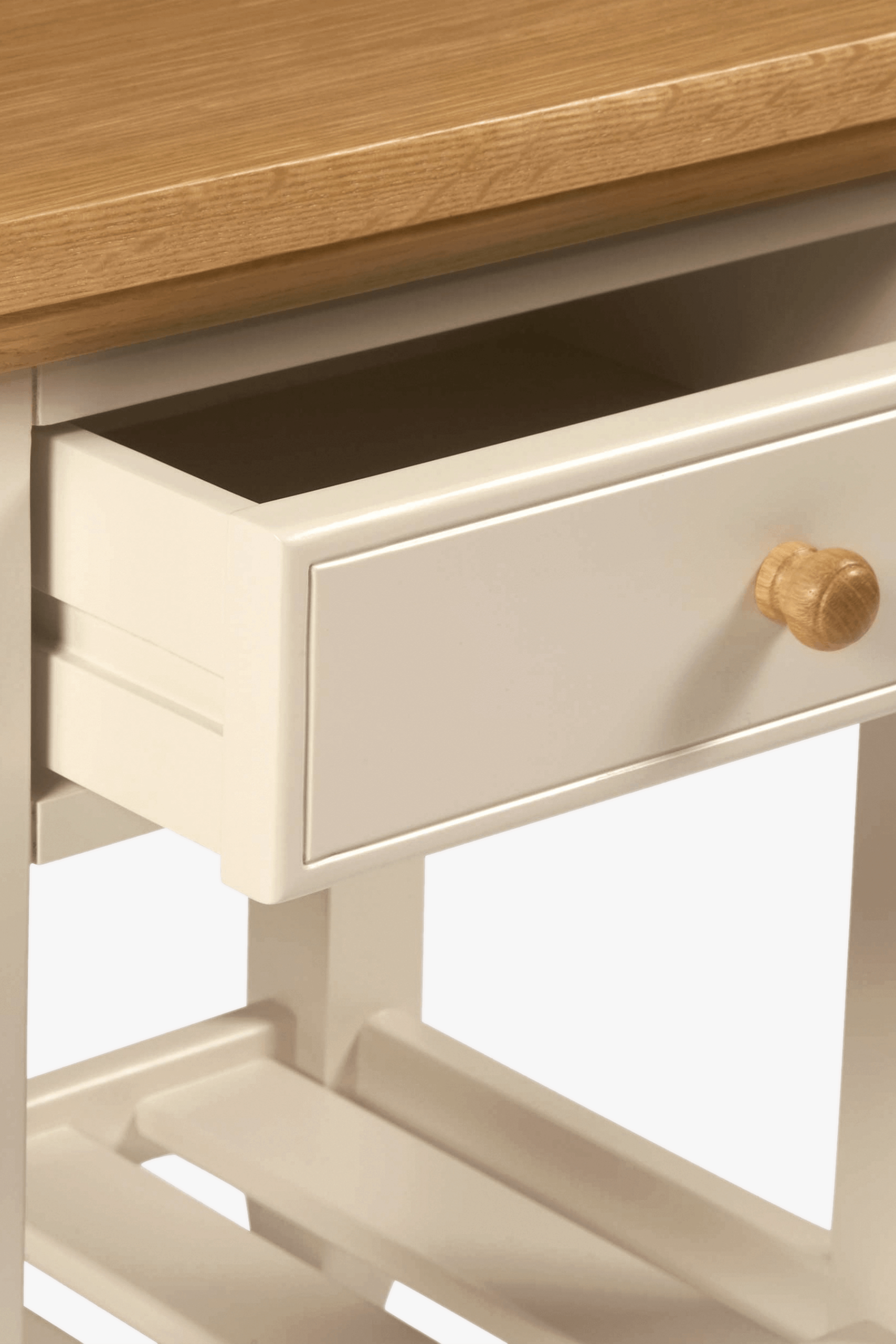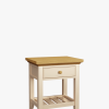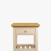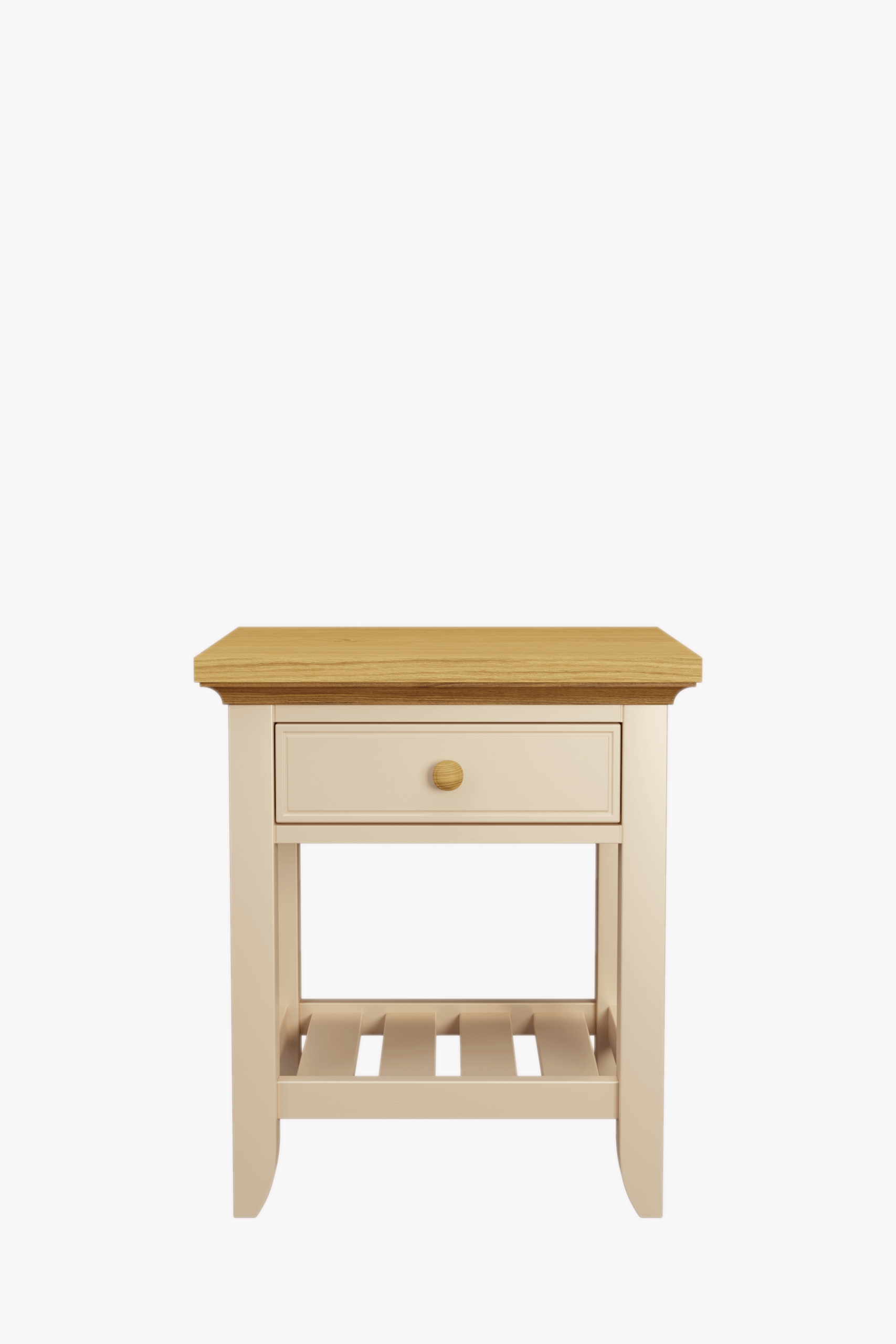 Featuring a drawer and a low slatted shelf, the Laura Ashley Oakham Side Table provides useful storage at the end of a sofa in a convenient footprint. The subtle country styling fits with many decorative settings; the inscribed drawer front, tapered legs and cornice top elevating its character above the everyday. Solid wood is used throughout; the drawer a solid oak knob and is mounted on traditional wooden rails. Finally, the top is finished with solid oak and oak veneer and the frame has a contrasting satin paint finish.