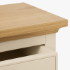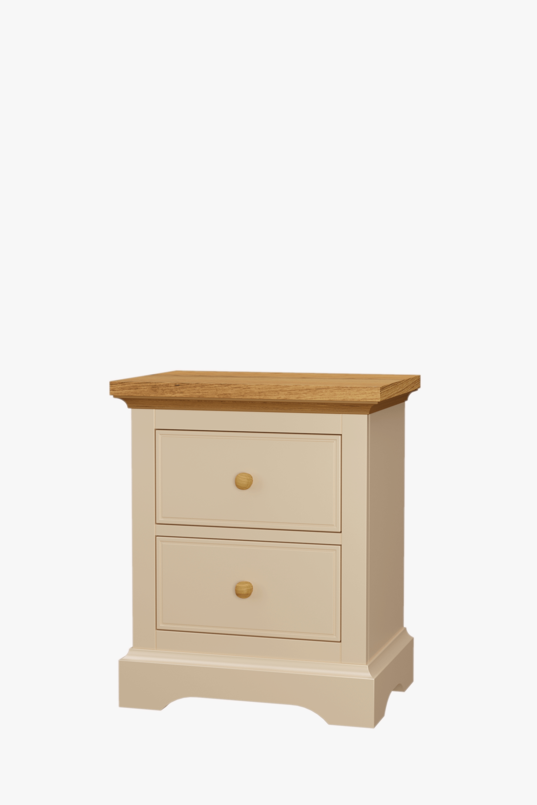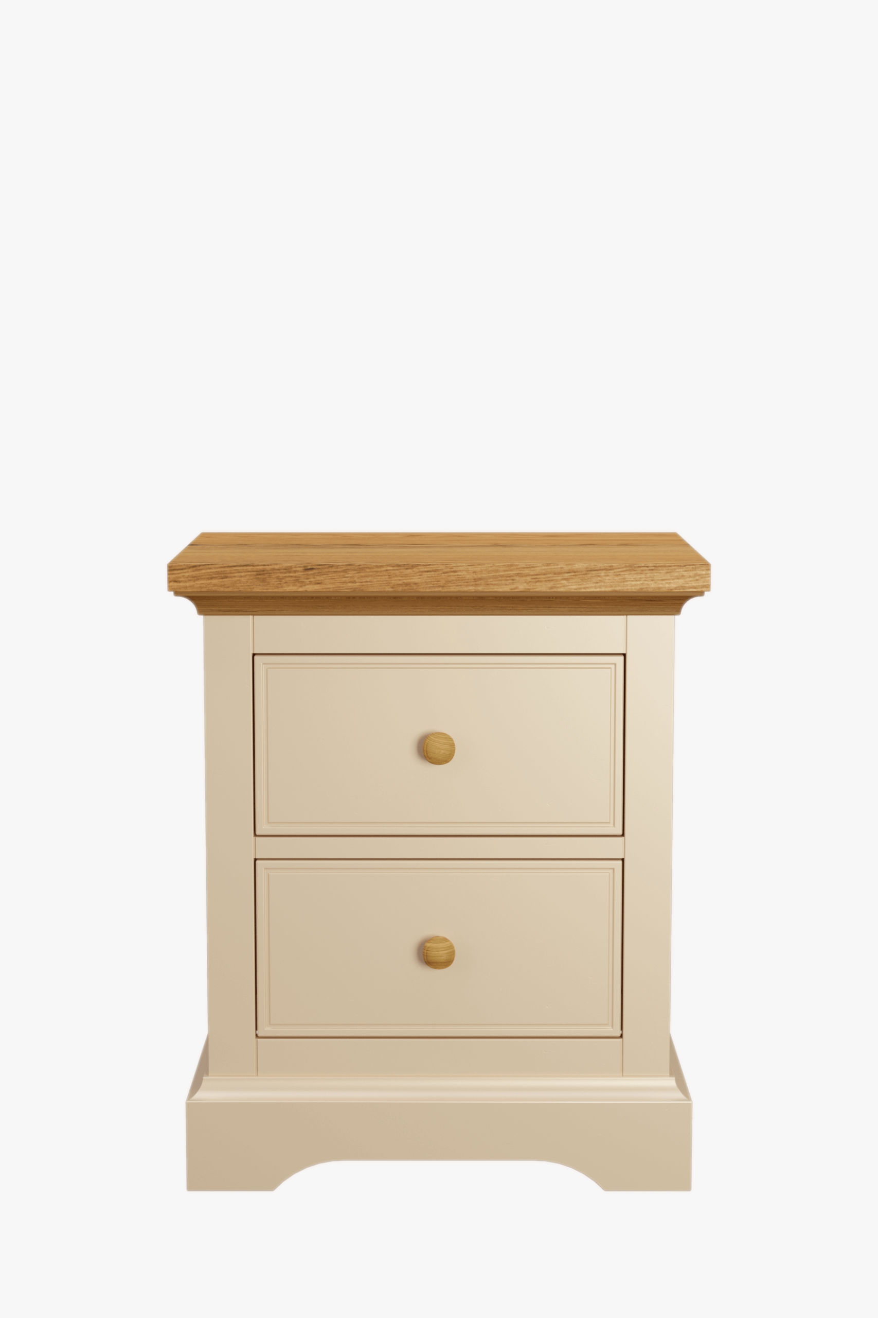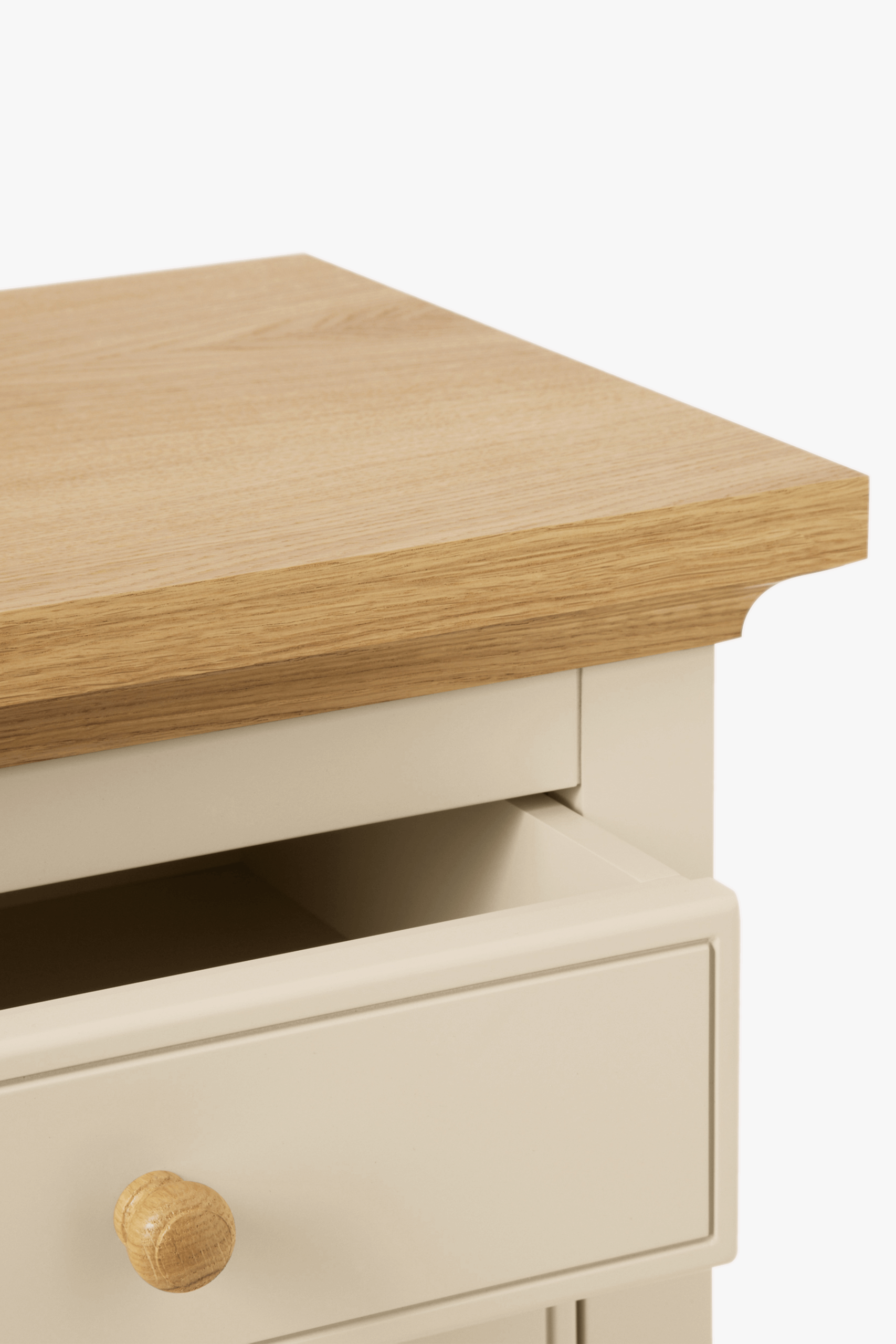 The Laura Ashley Oakham 2 Drawer Bedside Table provides generous storage within a compact and convenient footprint. The subtle country styling fits with many decorative settings; the inscribed drawer fronts, cut-out plinth and cornice top elevating its character above the everyday. Solid wood is used throughout; the drawers have solid oak knobs and are mounted on traditional wooden rails. Finally, the top is finished with solid oak and oak veneer and the body has a contrasting satin paint finish.