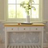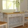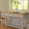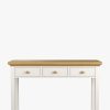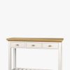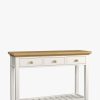 Featuring three drawers and a low slatted shelf, the Laura Ashley Oakham Console Table provides a generous amount of storage in a convenient size. The subtle country styling fits with many decorative settings; the inscribed drawer fronts, tapered legs and cornice top elevating its character above the everyday. Solid wood is used throughout; the drawers have solid oak knobs and are mounted on traditional wooden rails. Finally, the top is finished with solid oak and oak veneer and the frame has a contrasting satin paint finish.