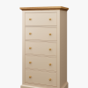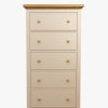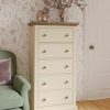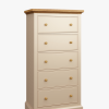 The Laura Ashley Oakham Tall 5 Drawer Chest provides plenty of storage within a compact and convenient footprint. The subtle country styling fits with many decorative settings; the inscribed drawer fronts, cut-out plinth and cornice top elevating its character above the everyday. Solid wood is used throughout; the drawers have solid oak knobs and are mounted on traditional wooden rails. Finally, the top is finished with solid oak and oak veneer and the body has a contrasting satin paint finish.