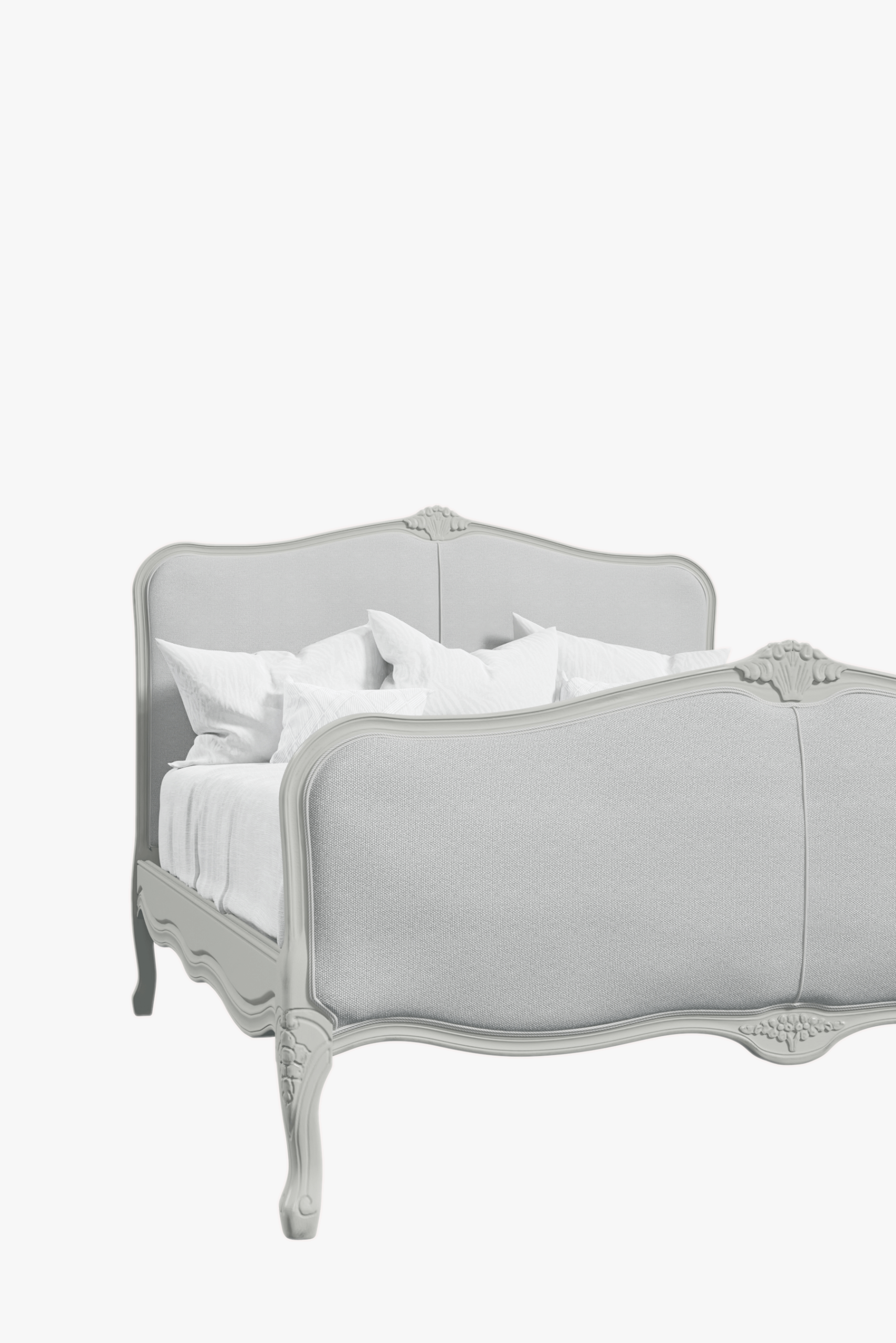 The masterpiece that finishes the room; the Laura Ashley Provencale Bed Frame exemplifies the beautiful proportions and intricate detailing of Rococo French furniture. Exquisitely shaped panels and carved details contribute to an elaborate yet tasteful design that brings together elements from the complete collection. The headboard and footboard are generously upholstered in Laura Ashley Linen Plain whilst the frame uses sprung slats for a supportive and ventilated mattress base. All surfaces are finished with a durable yet unassuming paint and a delicately applied patina to selected edges and profiles.