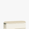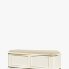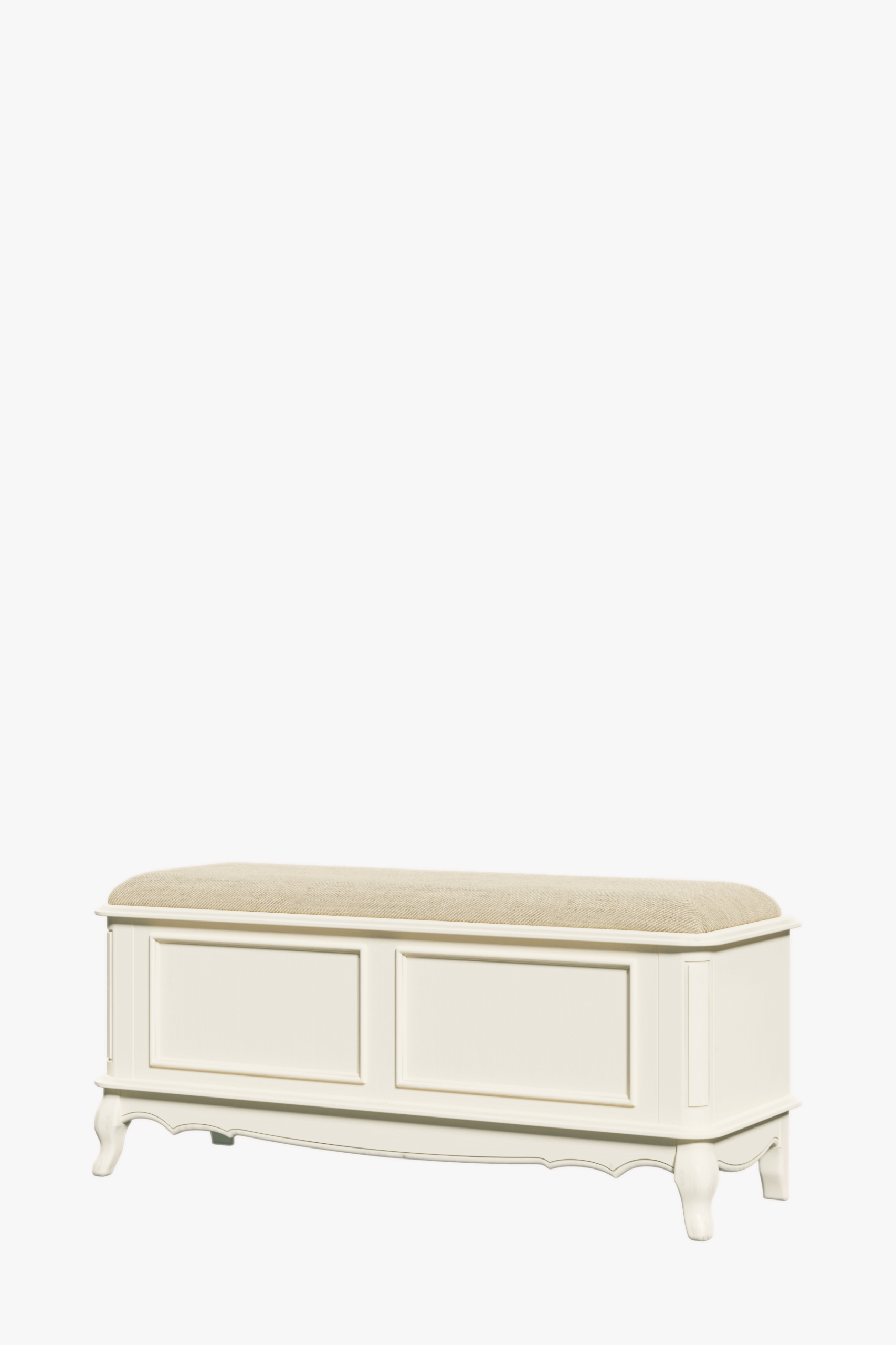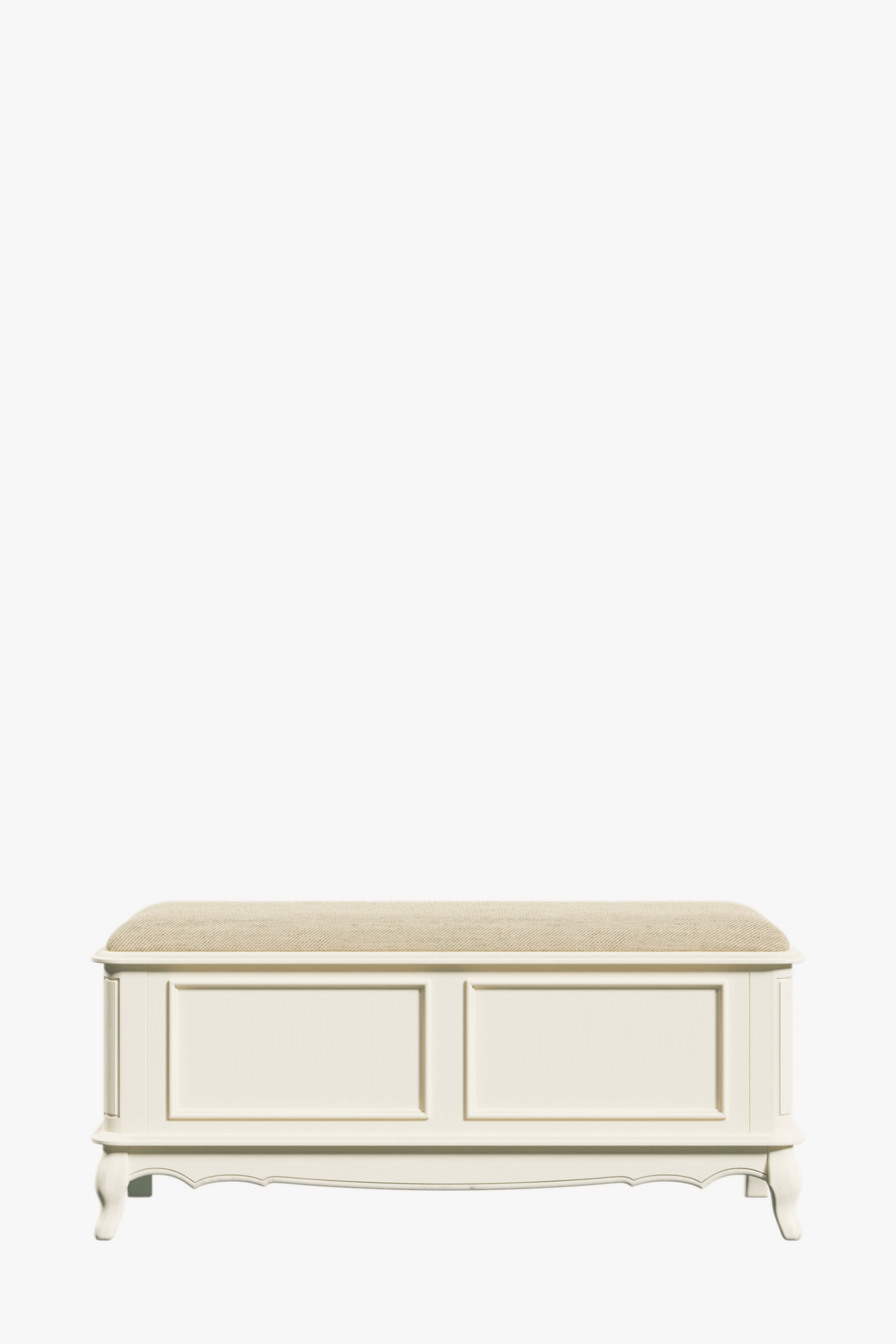Providing useful storage but also an elegant and comfortable seat whilst dressing, the Laura Ashley Provencale Blanket Box is the perfect piece for the end of a bed or under a window sill. The seat is upholstered with Laura Ashley Linen Plain and, when lifted and supported by hinged brackets, reveals a copious storage space within. The typical curved corners and fielded panels of the piece are further complemented by its inscribed details. All surfaces are finished with a durable yet unassuming paint and a delicately applied patina to selected edges and profiles.