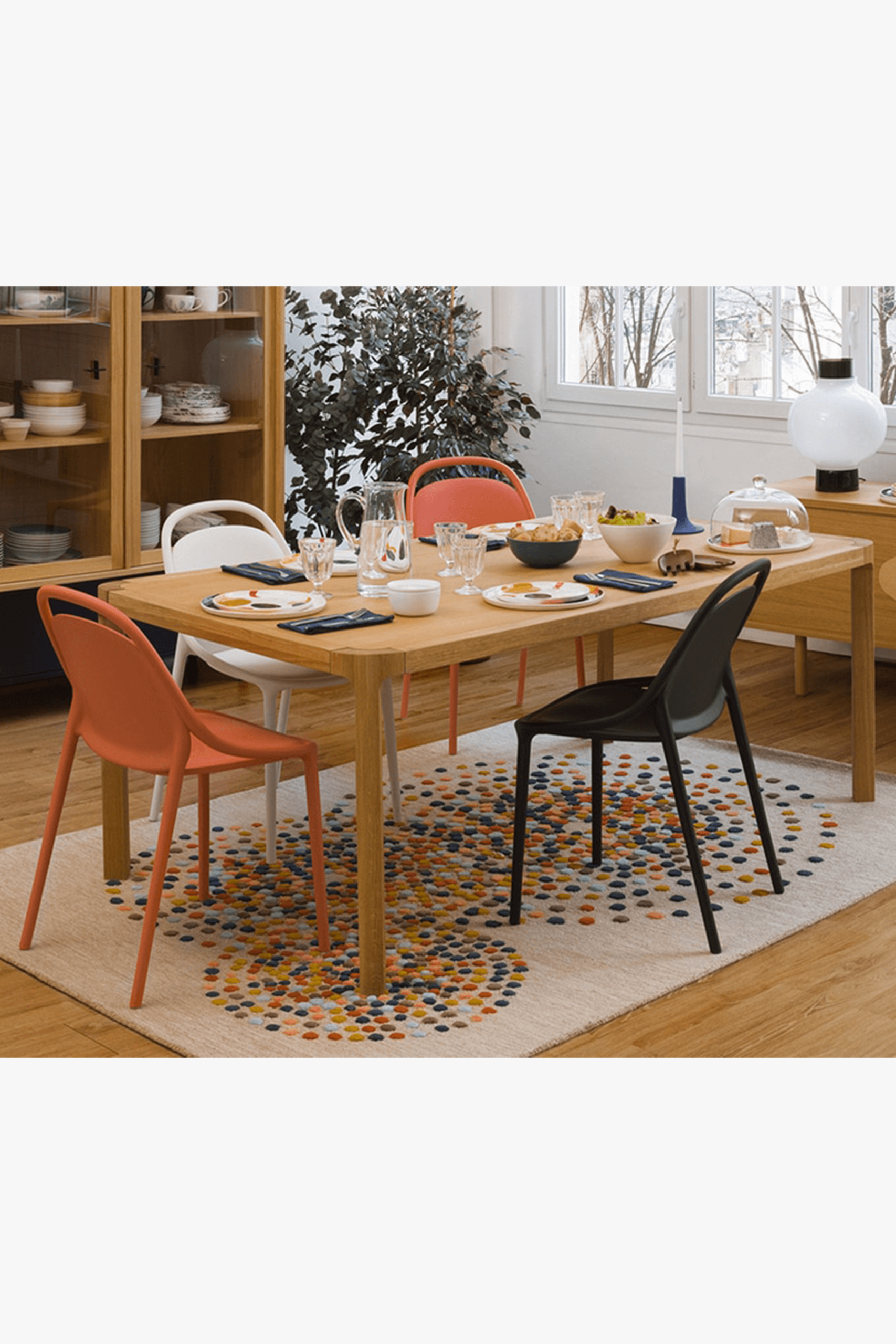 Frédéric Sofia, French designer, presents the table Sofia , his latest creation exclusively for Habitat. The elegance of the Sofia table resides in its rounded, dovetailed legs, a traditional cabinetmaking technique. Its solid oak base gives it charm and robustness. The Sofia dining table can accommodate up to 8 or 10 people for convivial lunches or dinners.