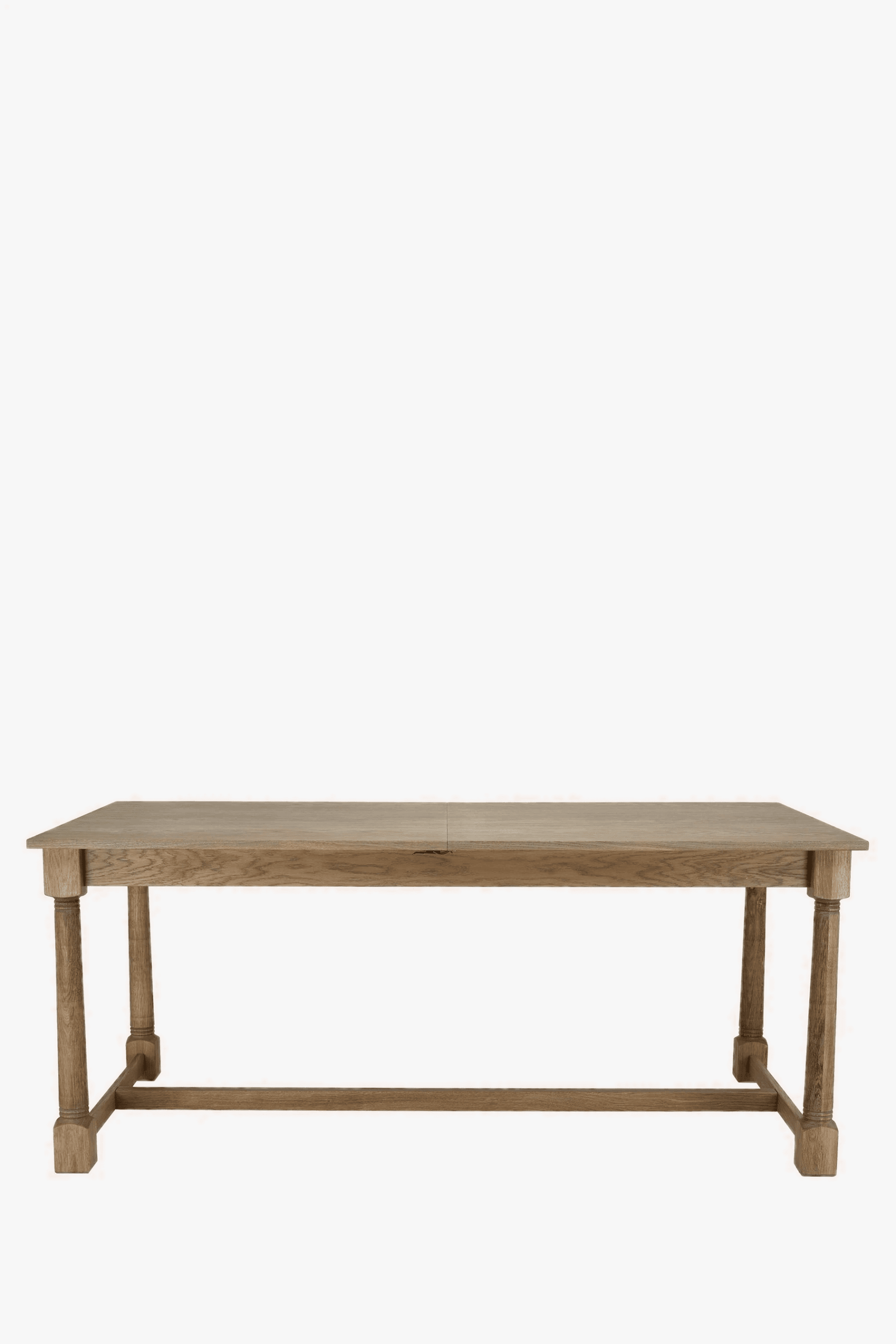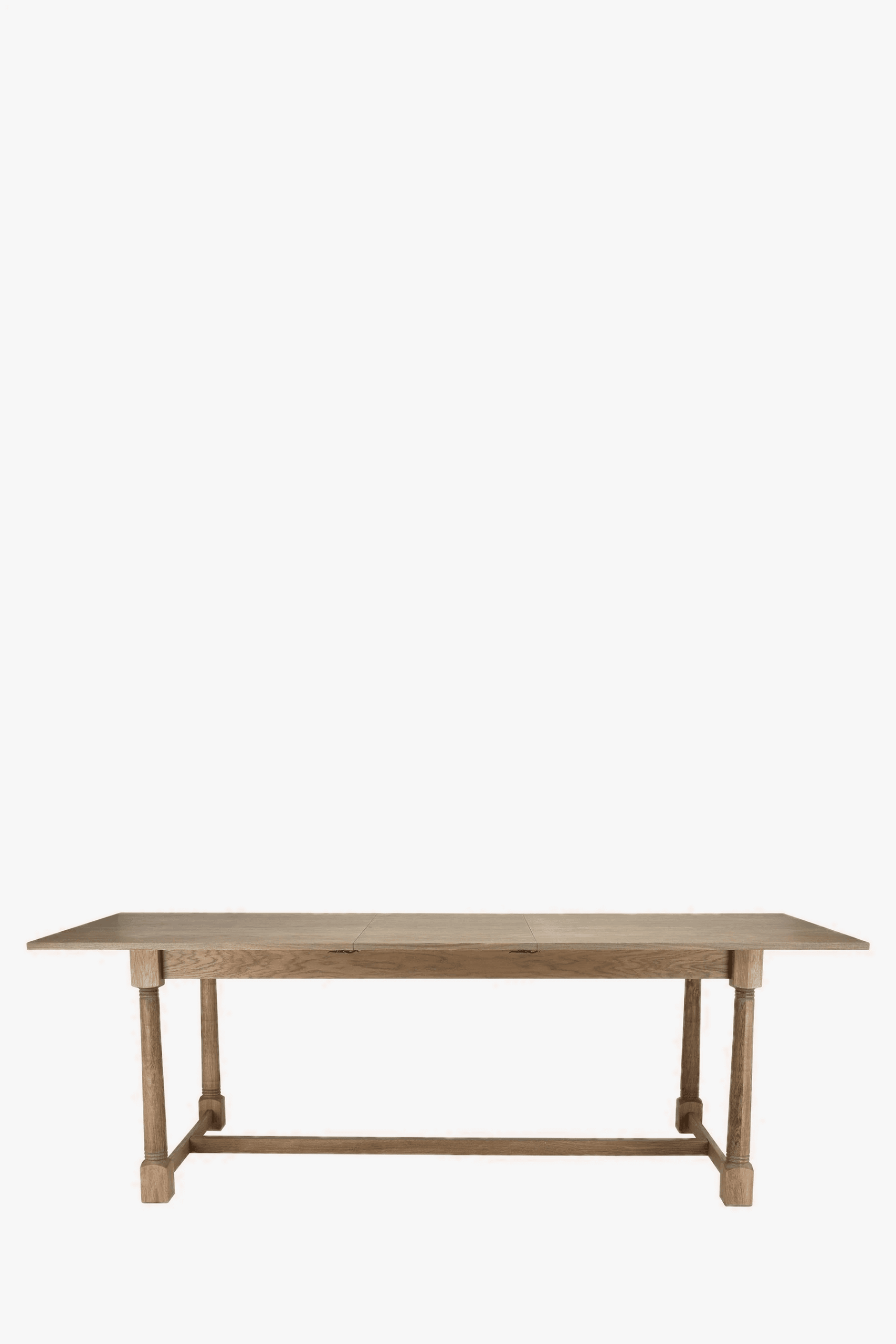 Displaying a rustic washed oak, oiled finish to give a refined, aged look the Laura Ashley Wellington Extending Dining Table is enhanced with stately carved effect pillar column legs. This handsome table can comfortably seat 6-8 people. Only the legs need to be attached to begin enjoying this piece; full assembly is not required.